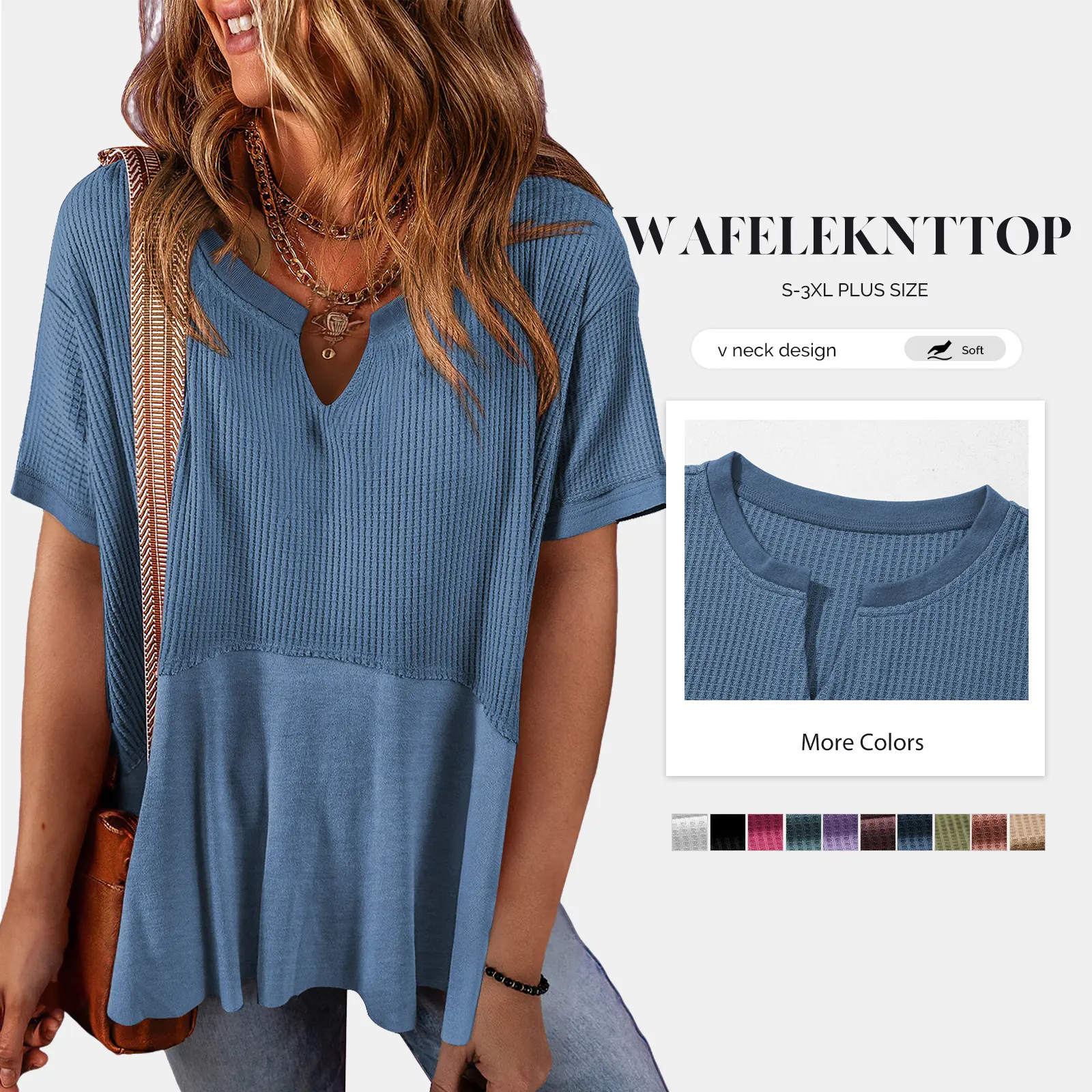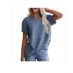 Waffle knit tops feature a V-neck design, loose fit, and short sleeves. These basic tunic tops come in solid colors, offering versatile styling options. Perfect for creating chic, casual looks. The fabric is 100% Polyester, with a bit of stretch, ensuring comfort and ease of care. Ideal for spring and summer outfits.