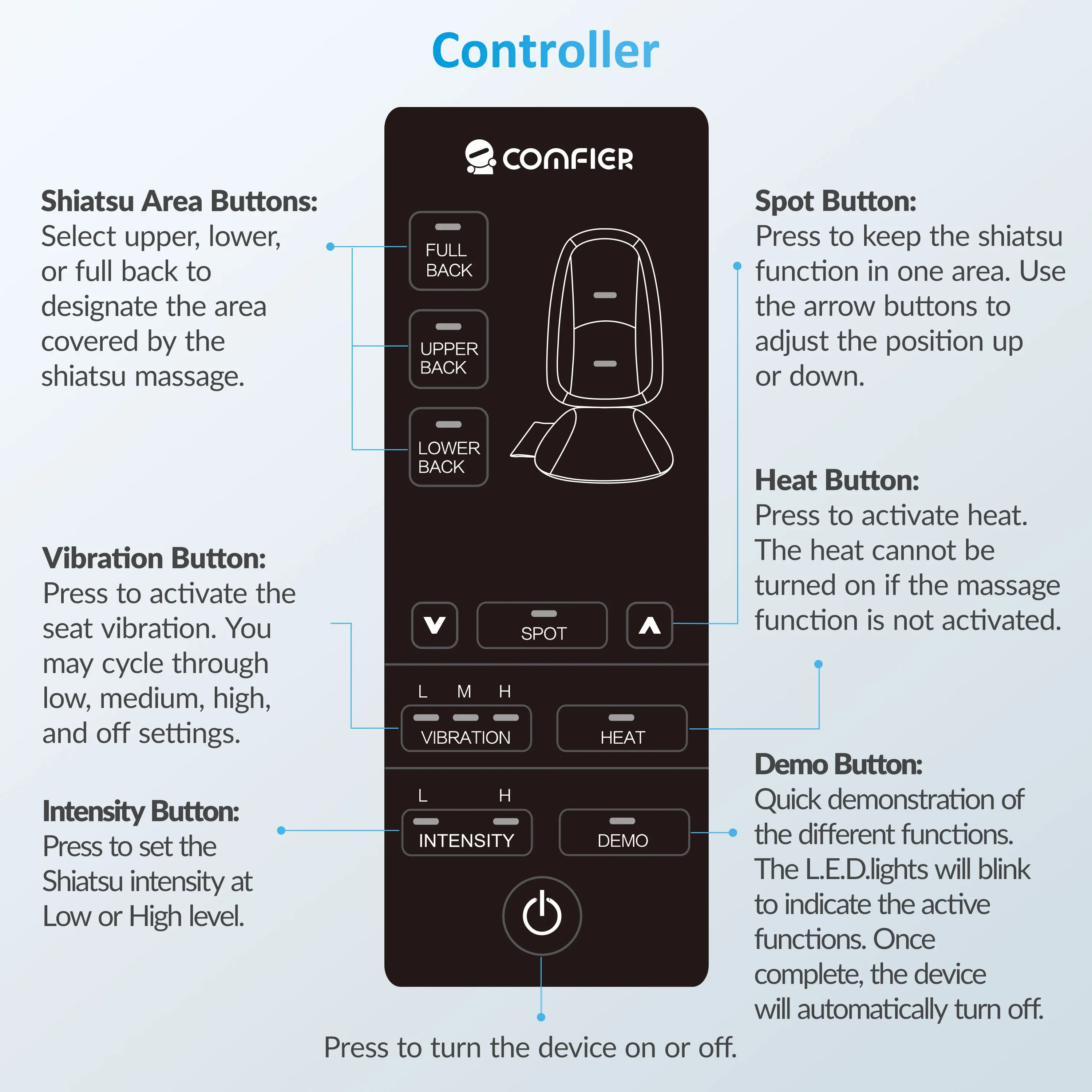·Customizable Back Massage Zones Personalize your massage experience with the ability to focus on specific areas of your back. You can select from Full Back, Upper Back, or Lower Back massage settings. Additionally, use the SPOT feature to concentrate the massage on one pinpoint area for targeted relaxation and relief from tension.