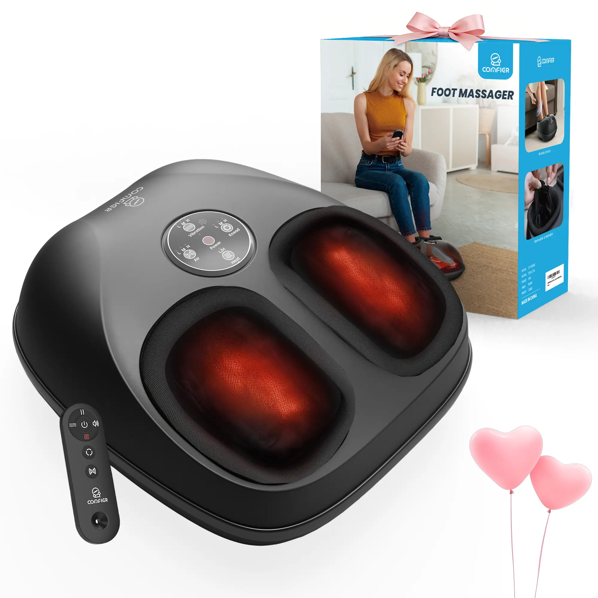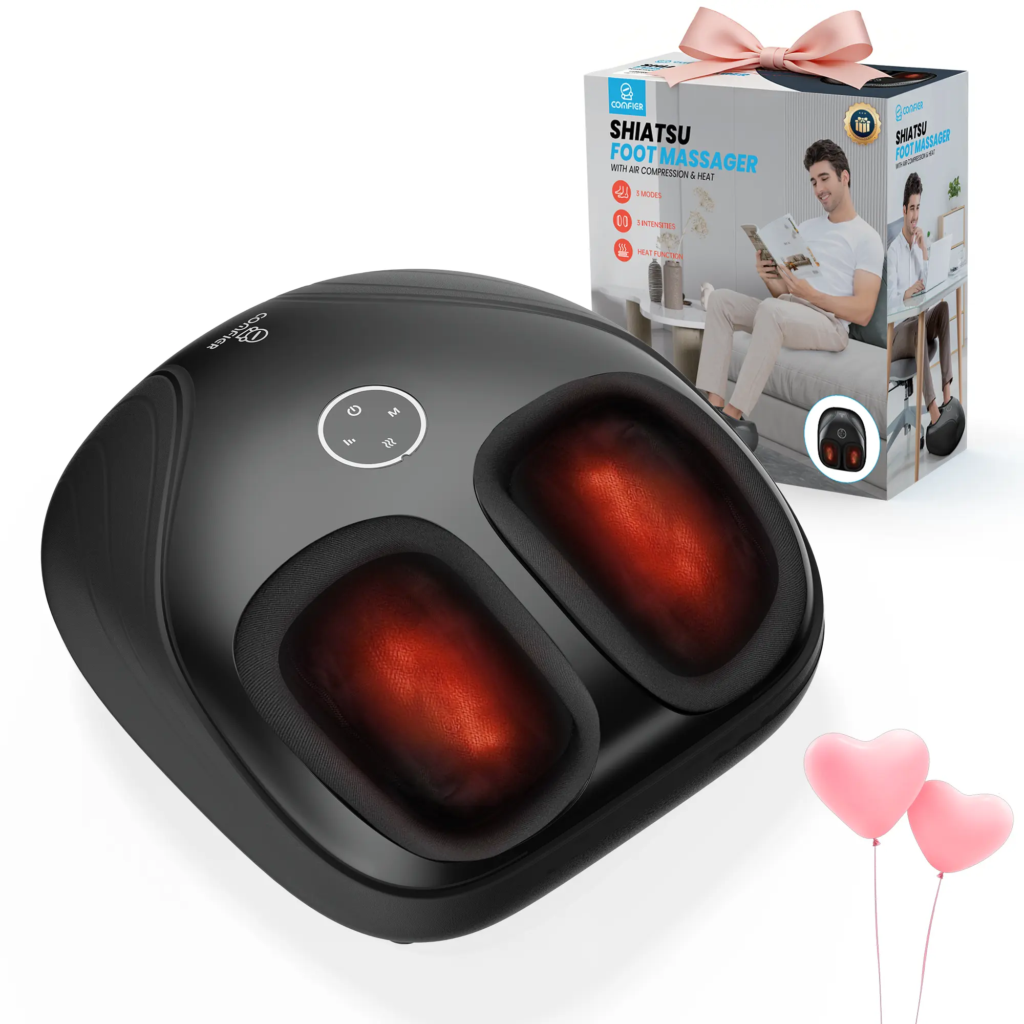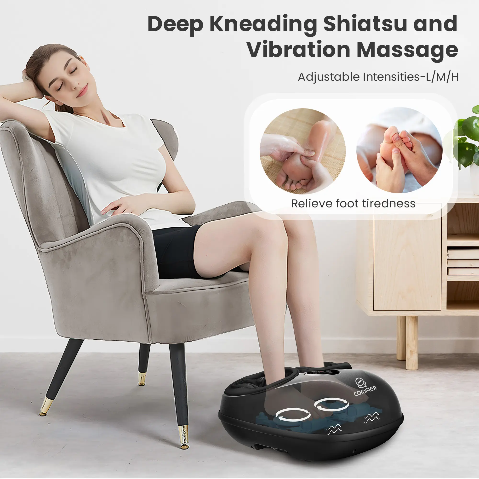 ¡Multifunctional Foot Massager with 3 Intensities-COMFIER feet massager is equipped with two independent rolling heads and multiple ergonomic small massage nodes, combined with vibration function, which can massage more areas of the foot and achieve upgraded shiatsu massage. Also, it has built-in air compression technology, works better when combined with the deep kneading shiatsu foot massage to strengthen muscle tissues & reduce muscle stiffness, allowing you to fully relax after a busy day.