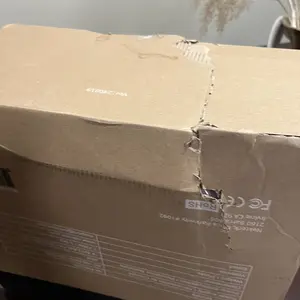 Horrible shipping box has been opened and torn with tape holding it together.