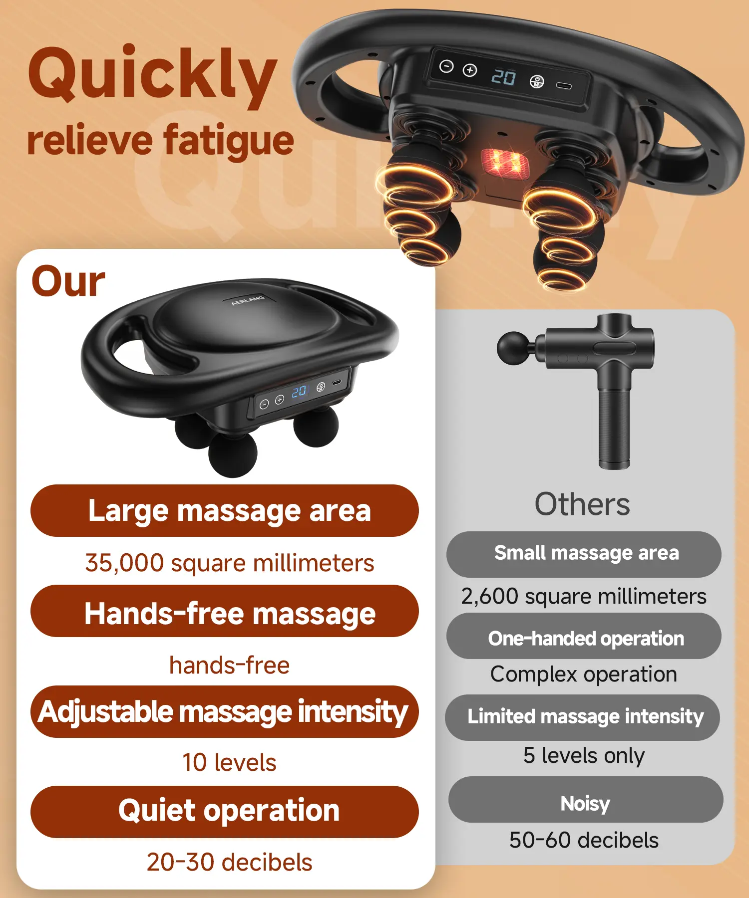 · Powerful Muscle Relief: The AERLANG Massage Gun is a deep-tissue muscle massage gun that effectively relieves muscle discomfort, making it an ideal electric massage gun for athletes and anyone looking to relieve muscle tension