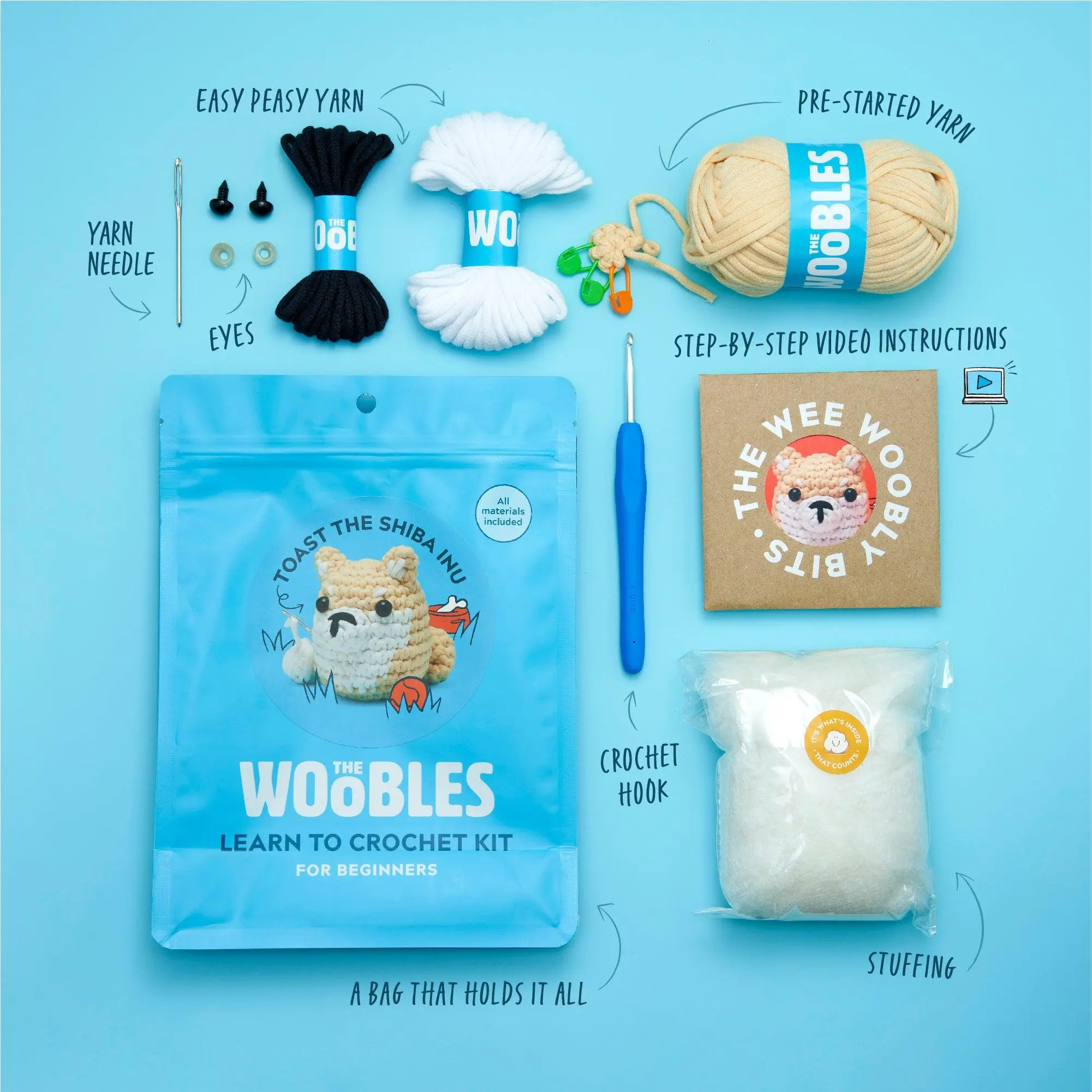 Our step-by-step instructions and The Woobles Easy Peasy Yarn™ will help you unleash all the color-changing skills you’ll need for her toasty tan and white coat and curly tail. Plus as soon as you embroider that signature Shiba smirk, those sweet little eyebrows, and that unmistakable ear fluff, this paw-some pal will be ready for some delicious kaya toast—her favorite food—and plenty of snuggles.