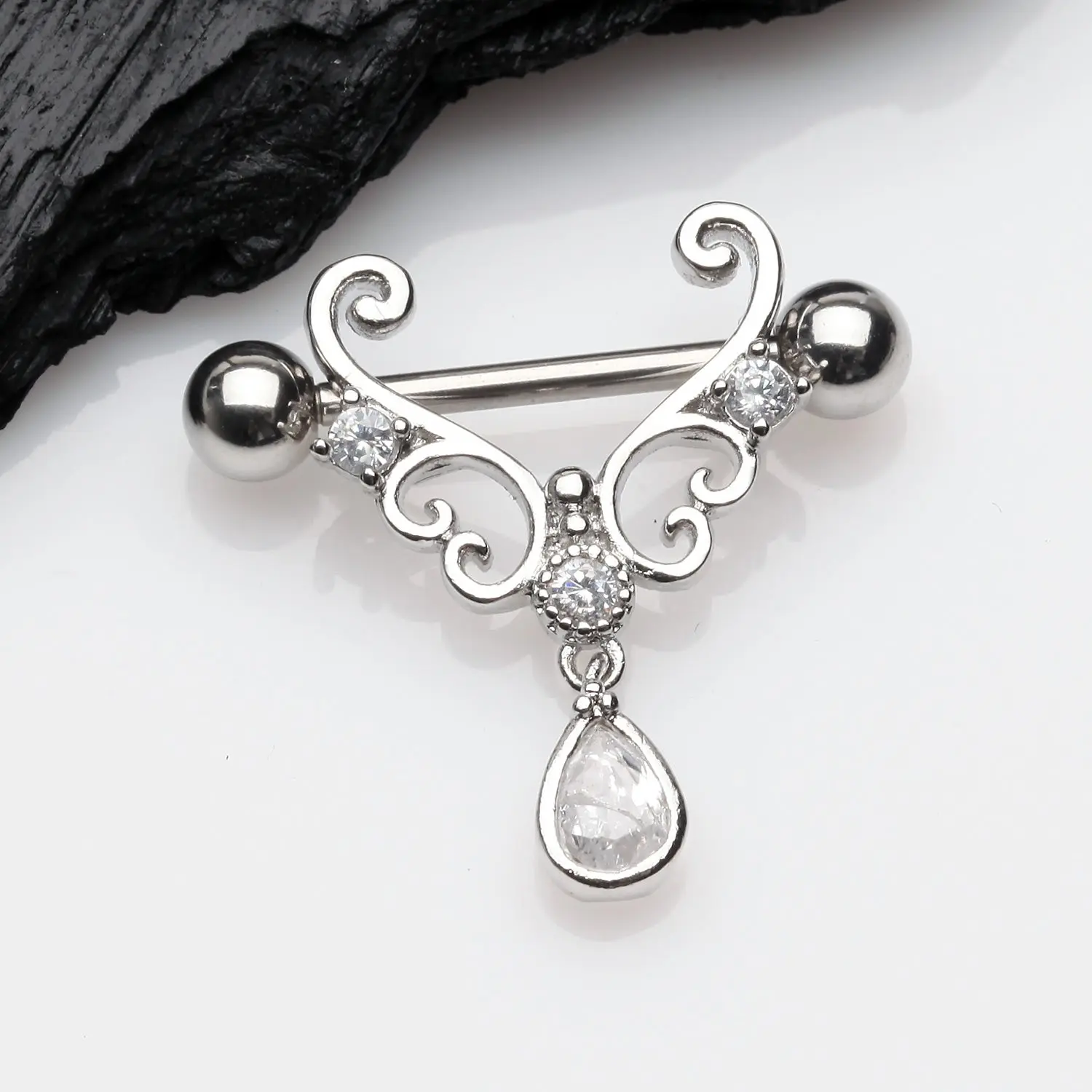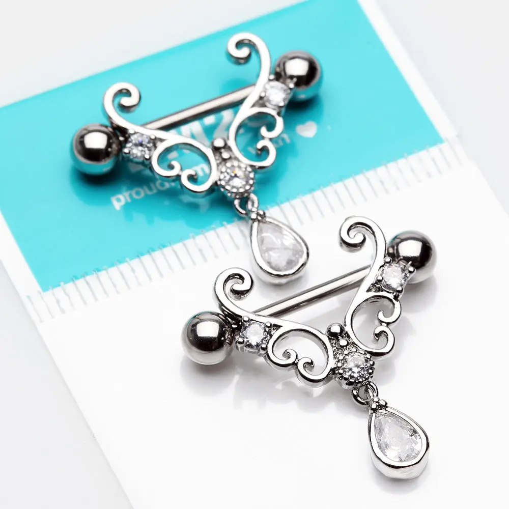 A Pair of Royal Heart Filigree Sparkle Dangle Nipple Shield