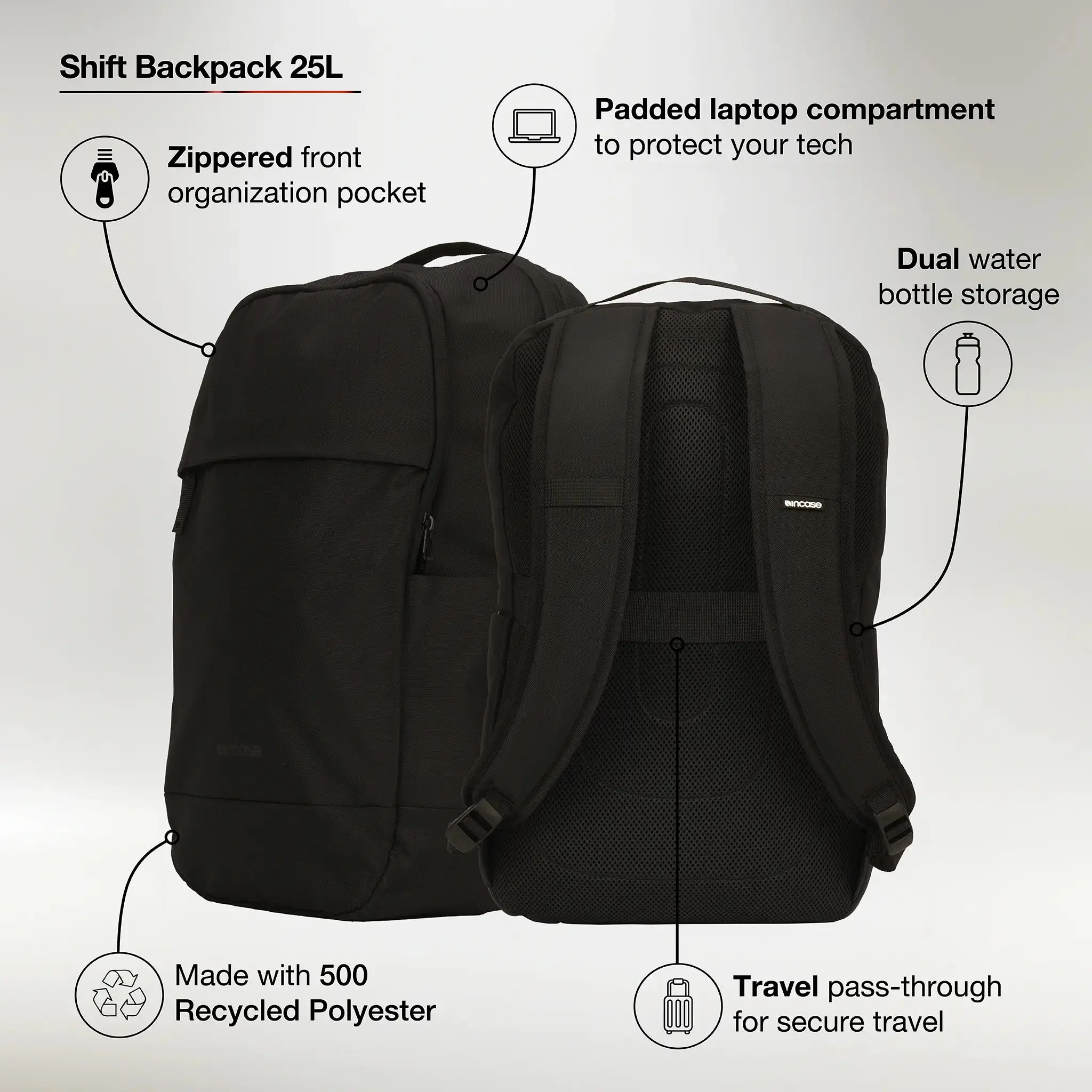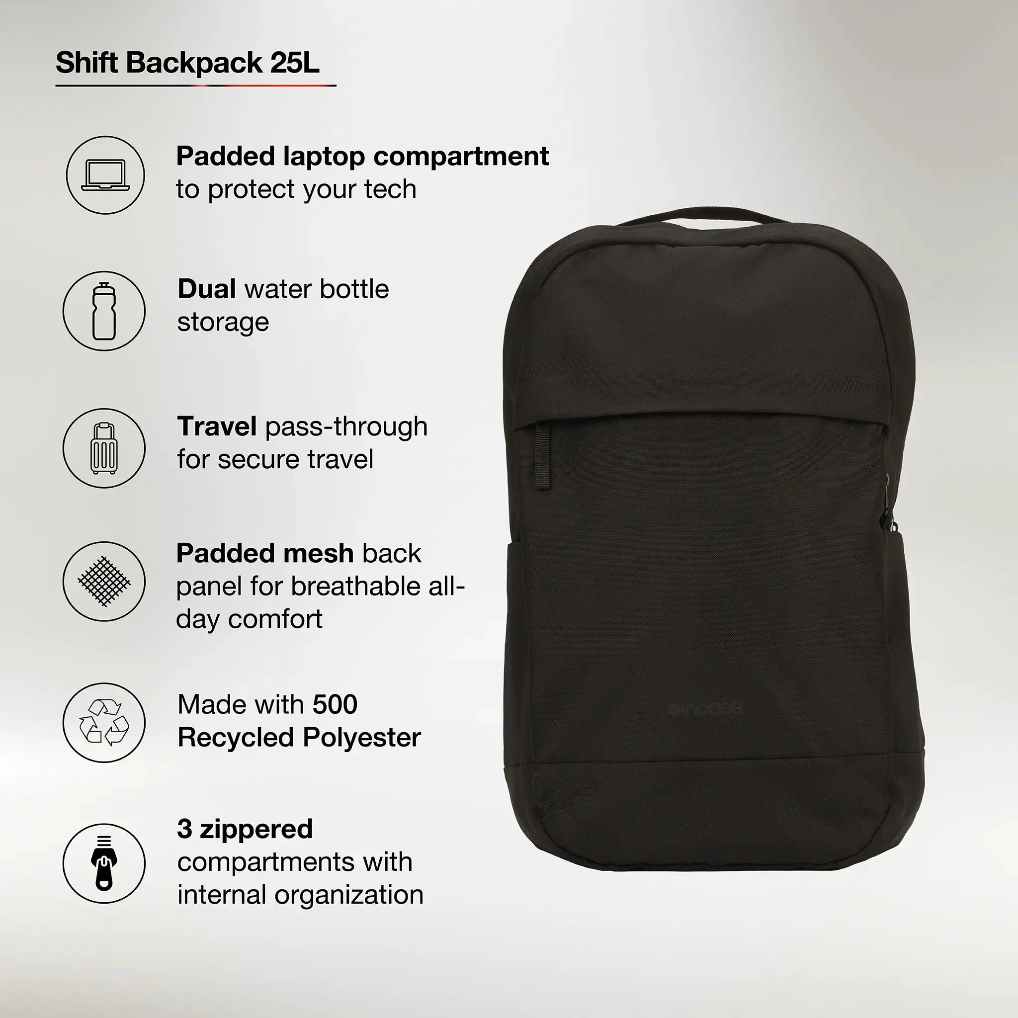 The Shift Backpack 25L is engineered for versatility, with a clean, compact design that adapts to the needs of your day. Multiple carry compartments offer intuitive organization, while a padded laptop slip and breathable padded mesh back panel ensure comfort and protection in motion. Made with 500D recycled polyester, this modern carry blends form with function.