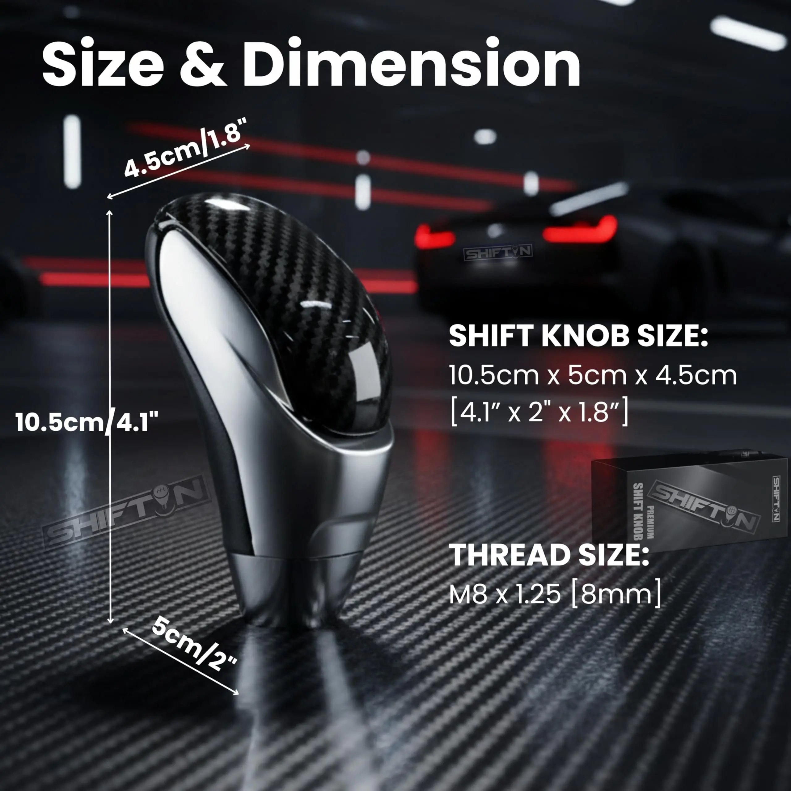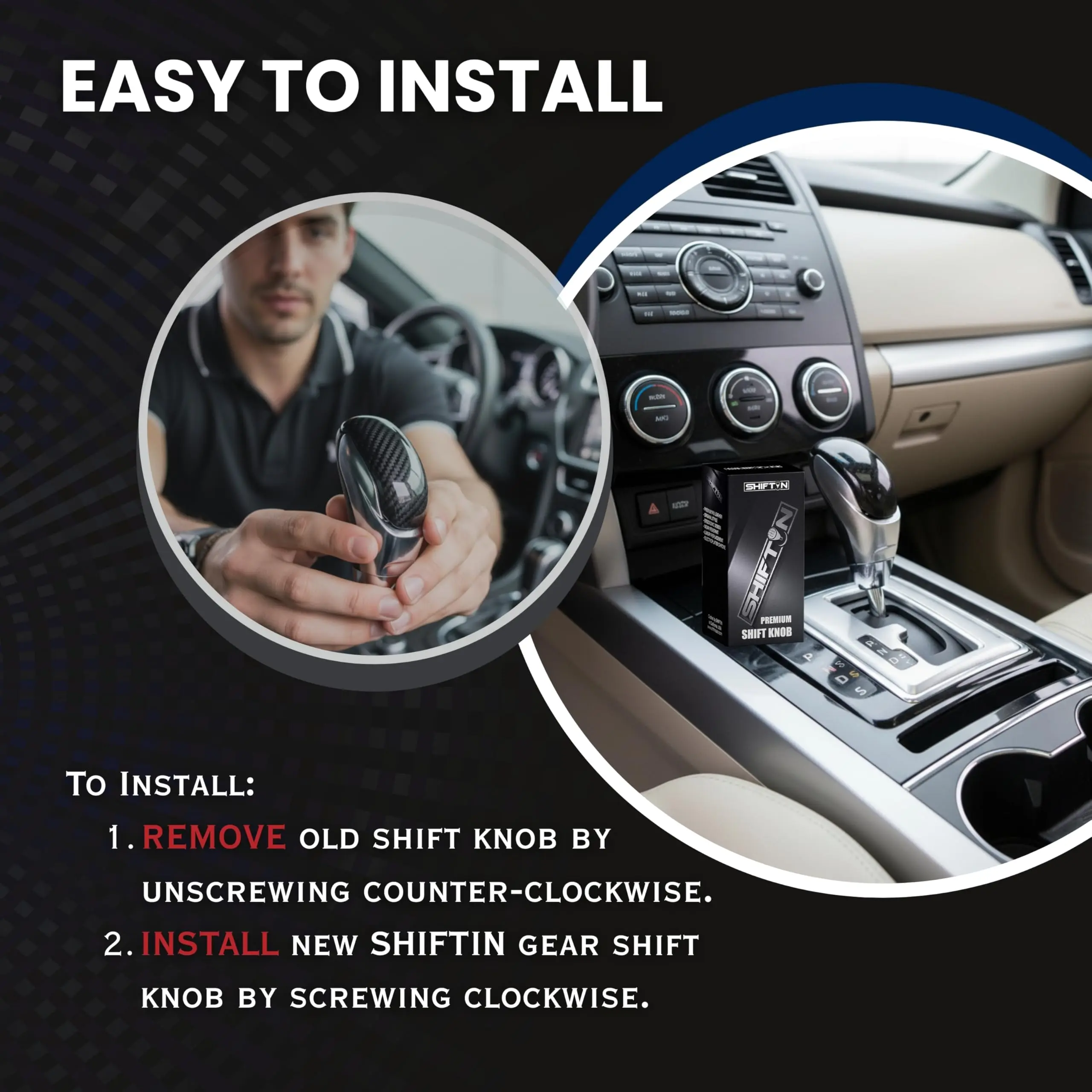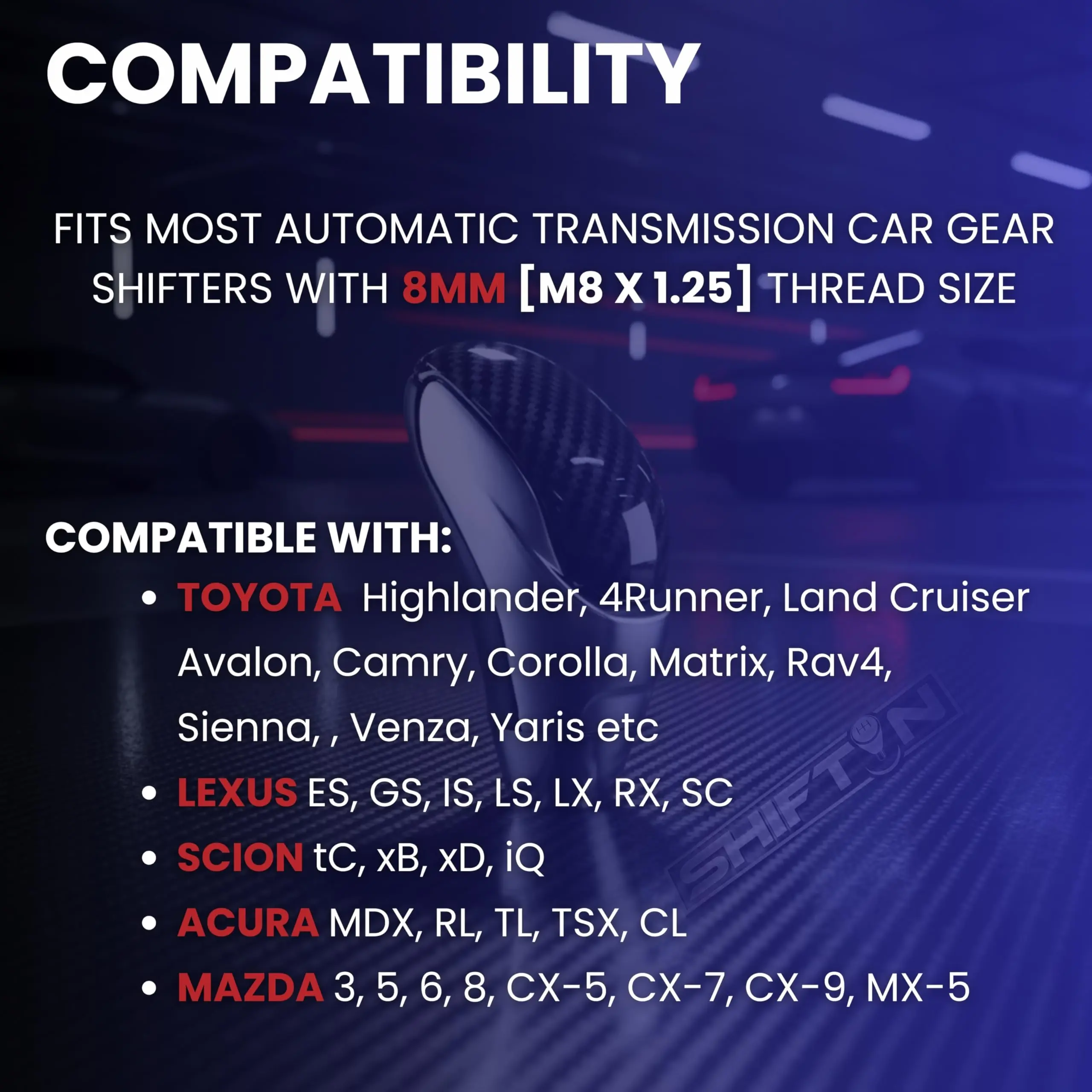 EASY INSTALLATION – Quick screw-on installation with no tools or modifications required. Simply twist clockwise to install. Compatible with automatic transmission gearbox shifters with 8mm (M8 x 1.25) thread size.