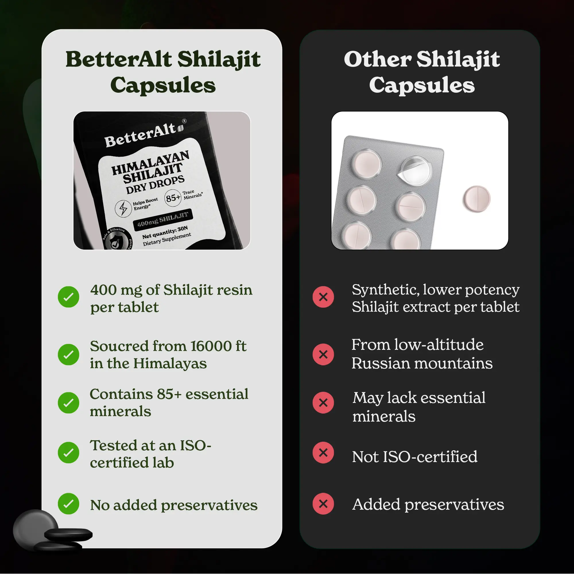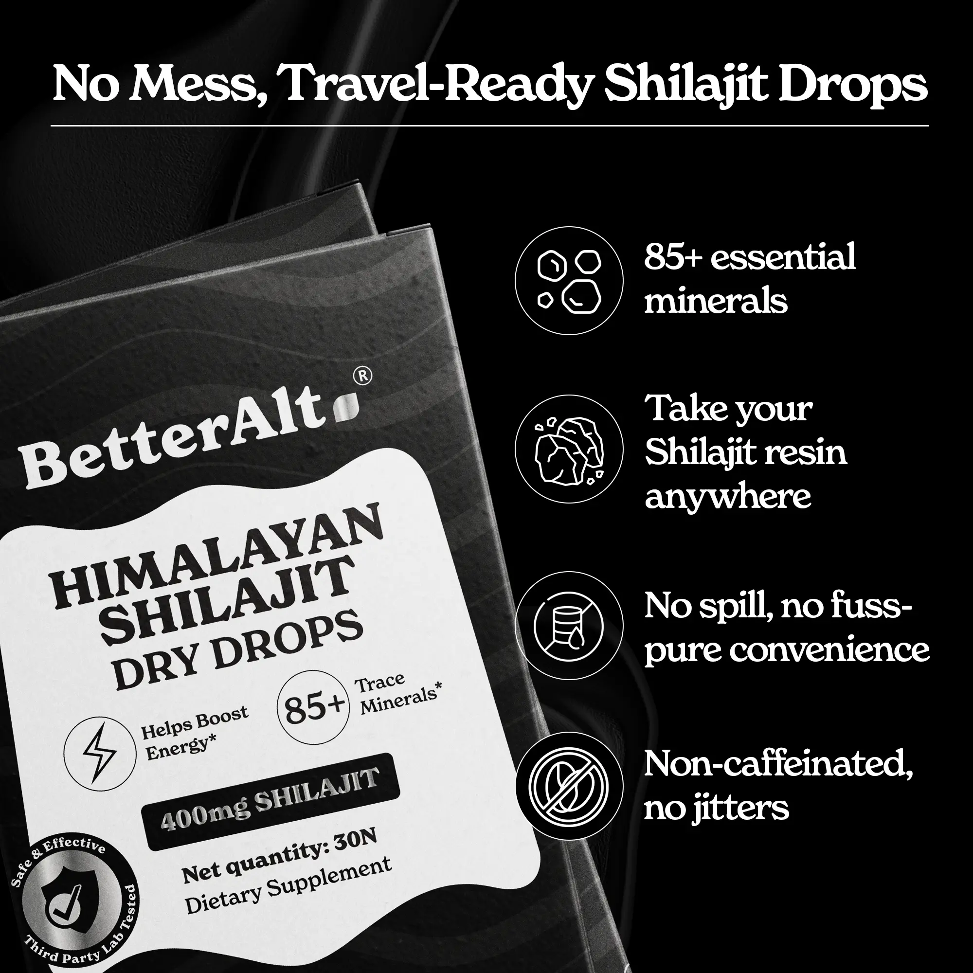 ·Experience the power of nature with BetterAlt’s Shilajit Dry Drop Tablets. Each tablet contains 400 mg of pure Himalayan Shilajit resin, packed with over 85 essential minerals to help support sustained energy, enhance stamina, improve focus, and reduce feelings of fatigue.*