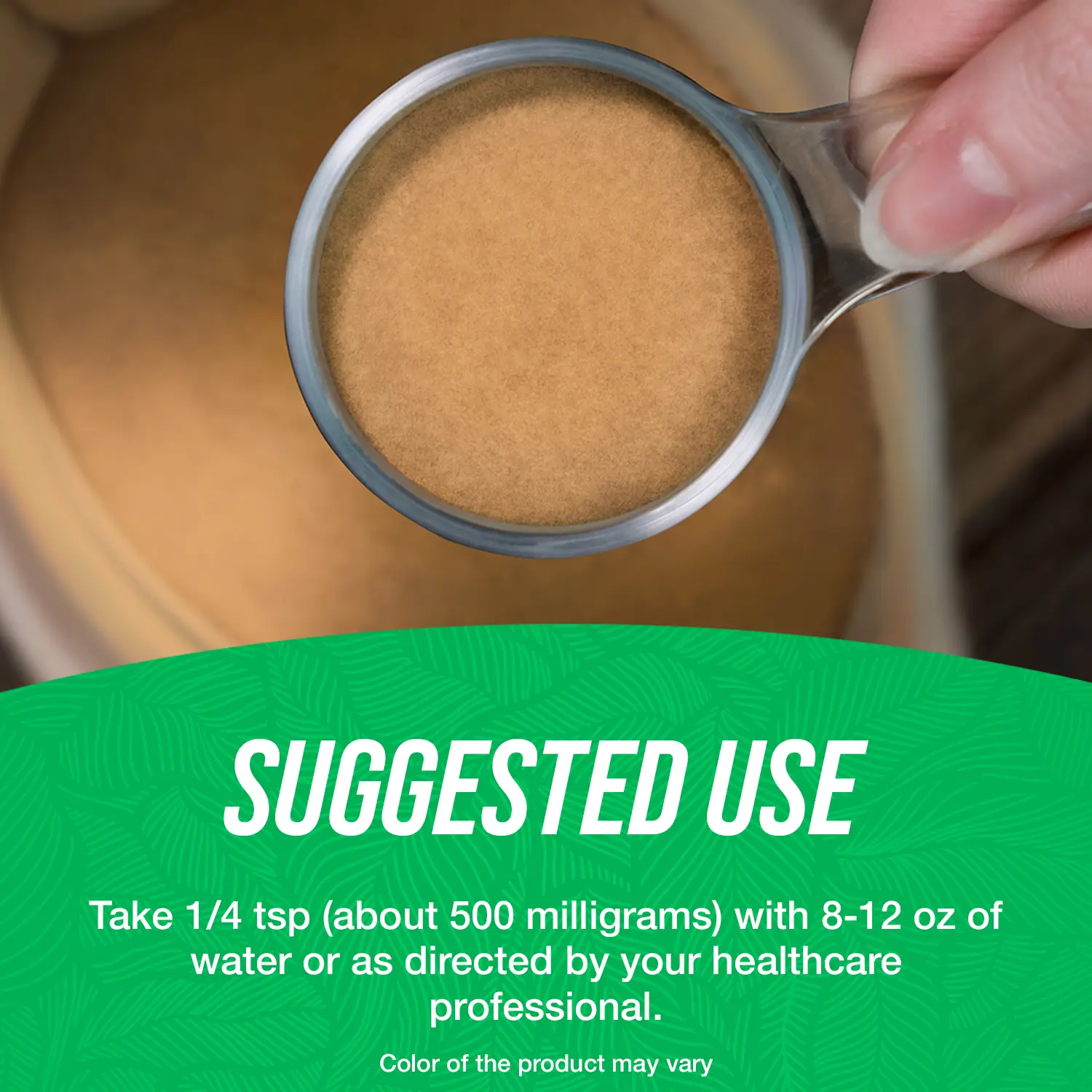 Suggested Use: As a dietary supplement, take 1/4 tsp (about 500 milligram) with 8-12 oz of water or as directed by your healthcare professional.