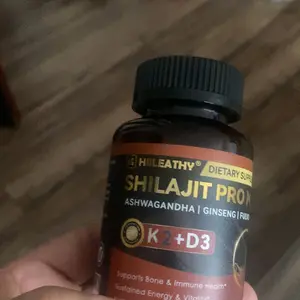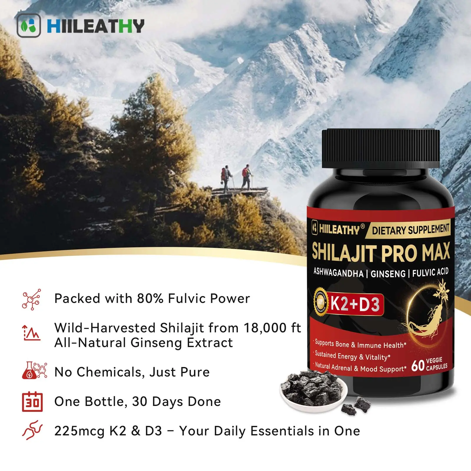 HIILEATHY Shilajit PRO MAX 500mg Extract with K2+D3, Ashwagandha & Ginseng 60 Capsules for Men & Women. Made in USA, these capsules support healthy testosterone, energy, stamina, focus, immune system, and healthy aging. Perfect for those seeking natural health support.
