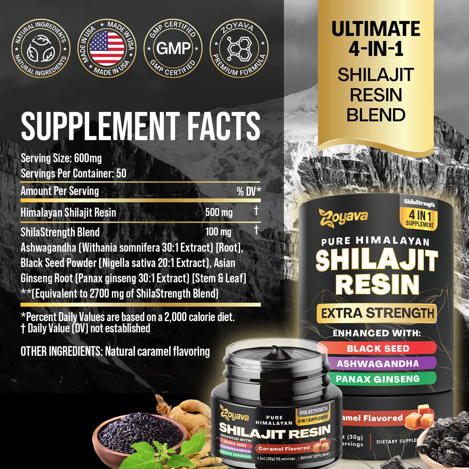 Zoyava Shilajit Resin: Pure Himalayan All-in-One Supplement with Extra Strength Ingredients - Caramel Flavored