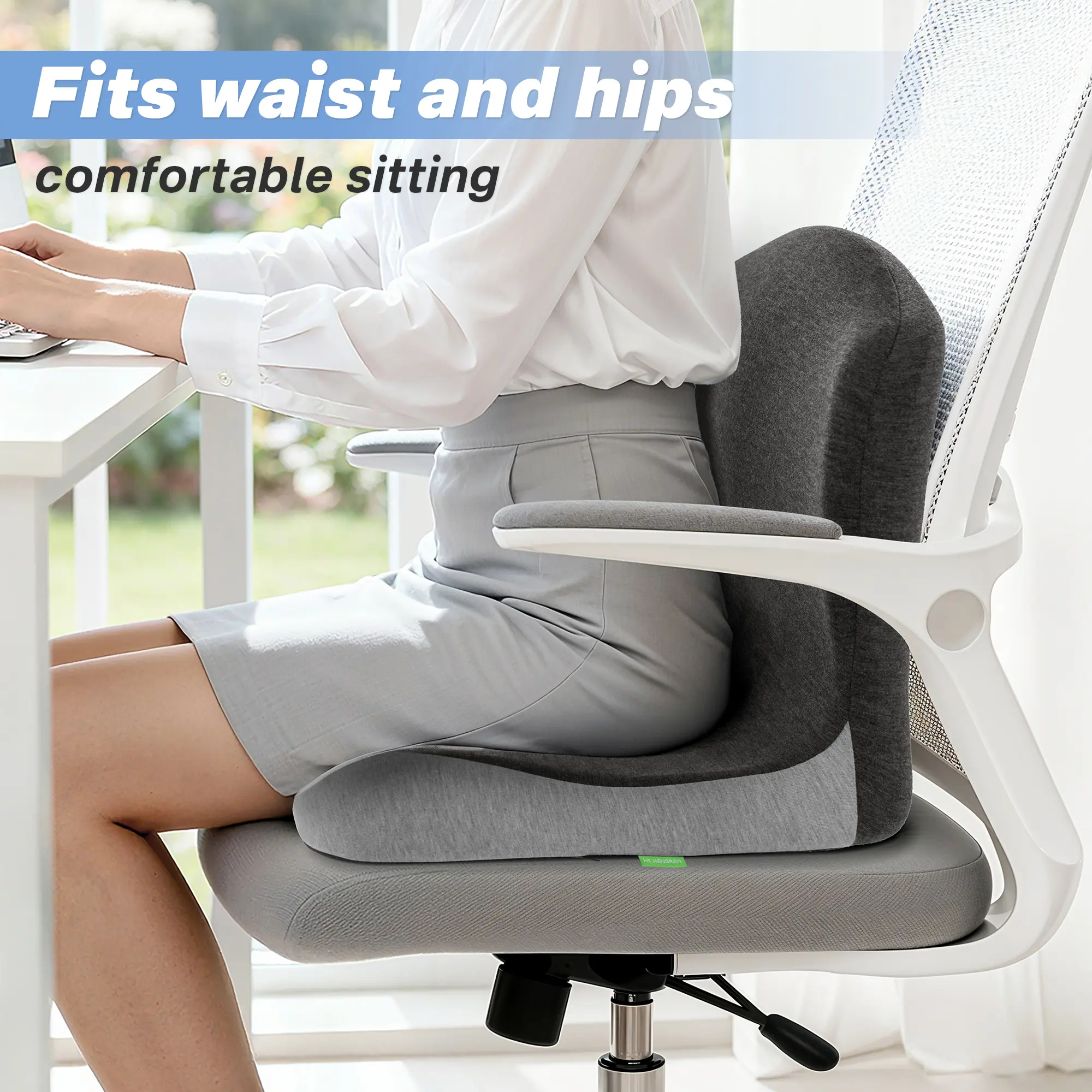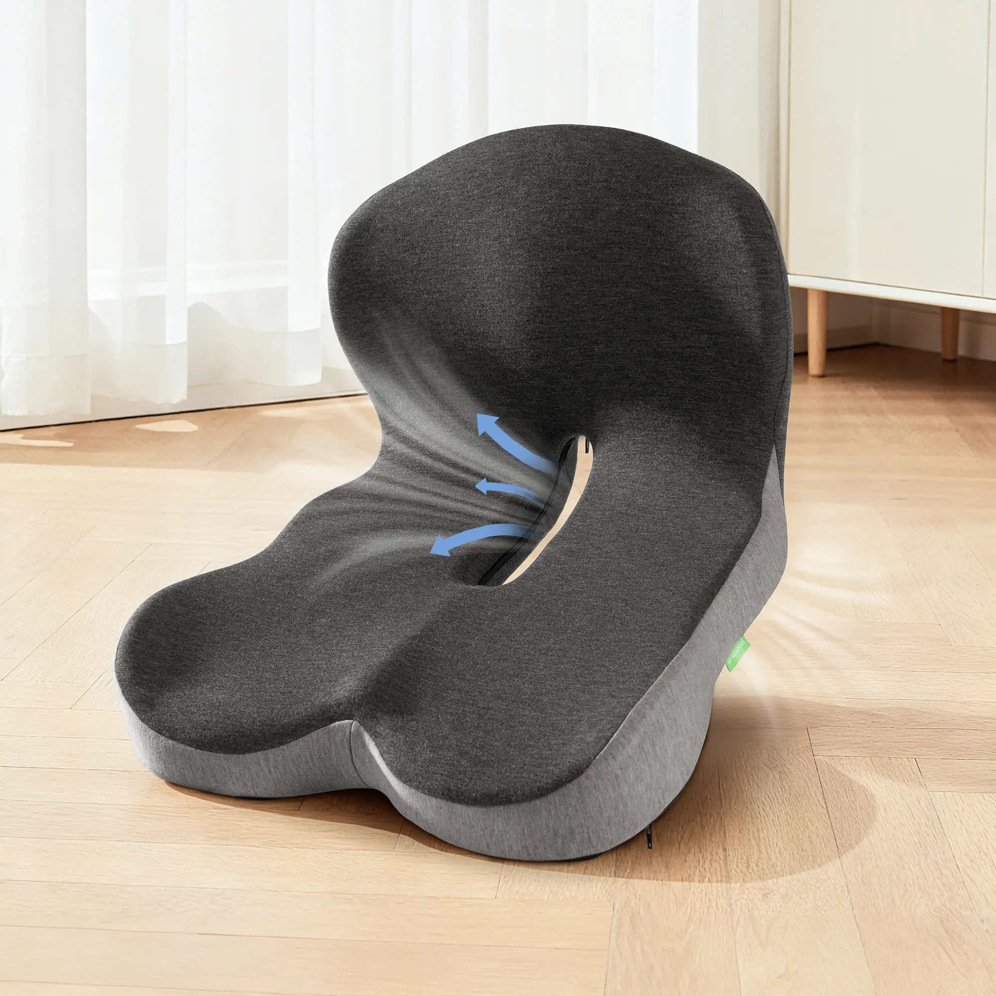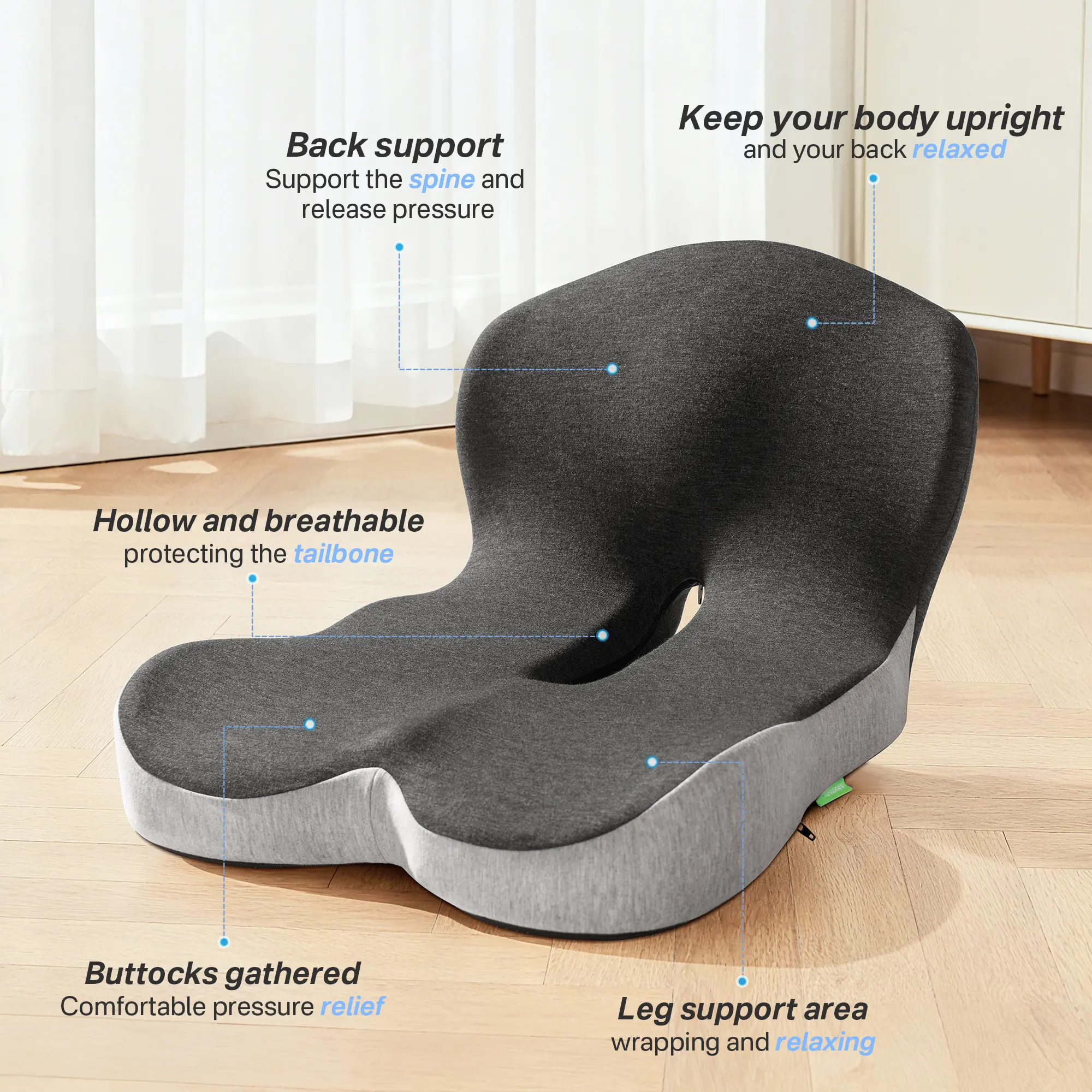 One-piece seat + lumbar cushion provides full support for the tailbone and lower back, helping maintain healthy posture during long sitting.