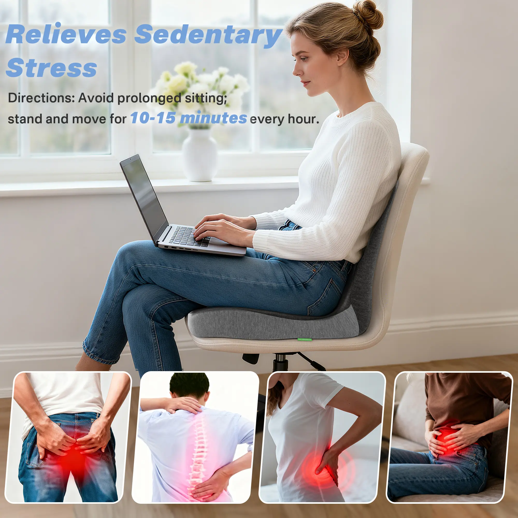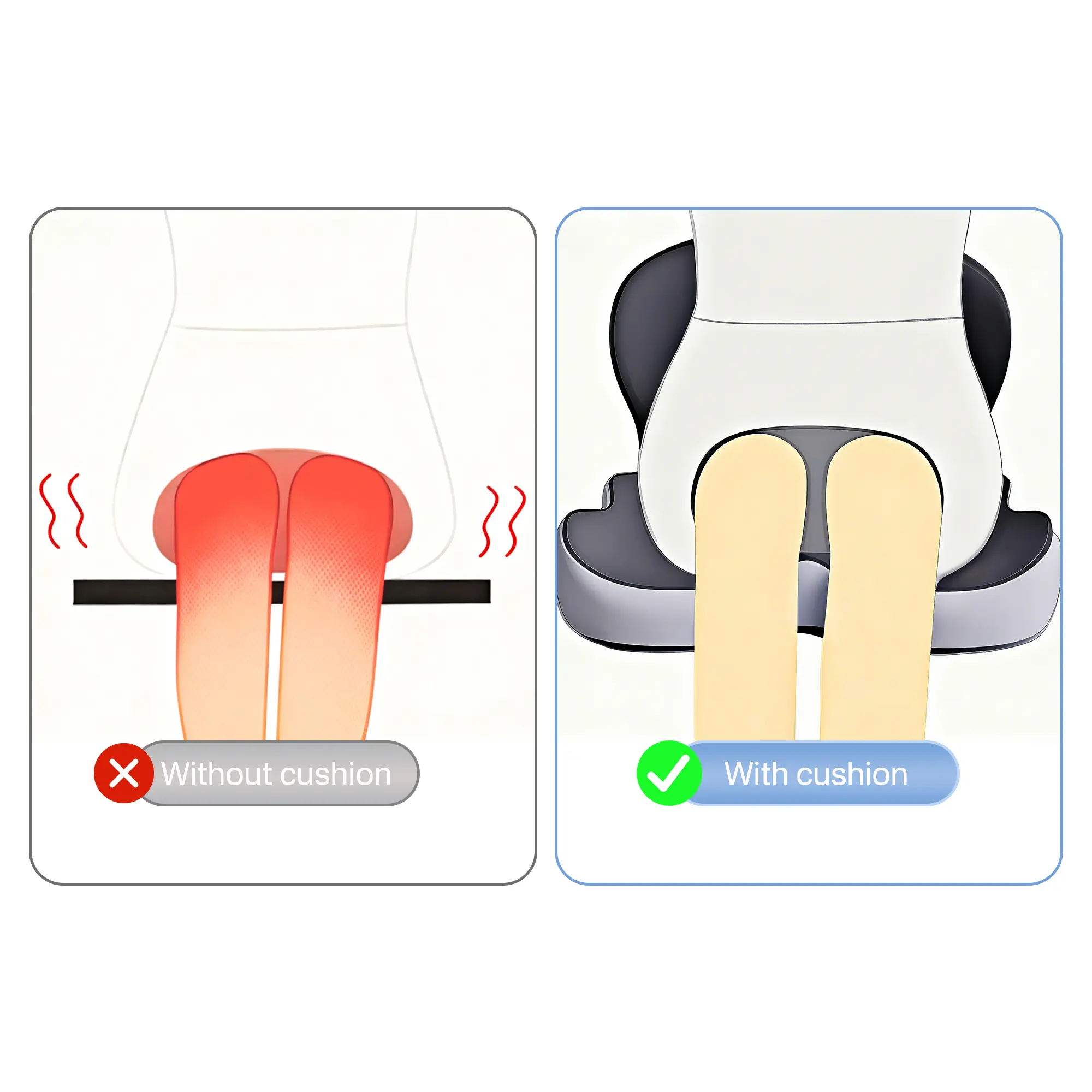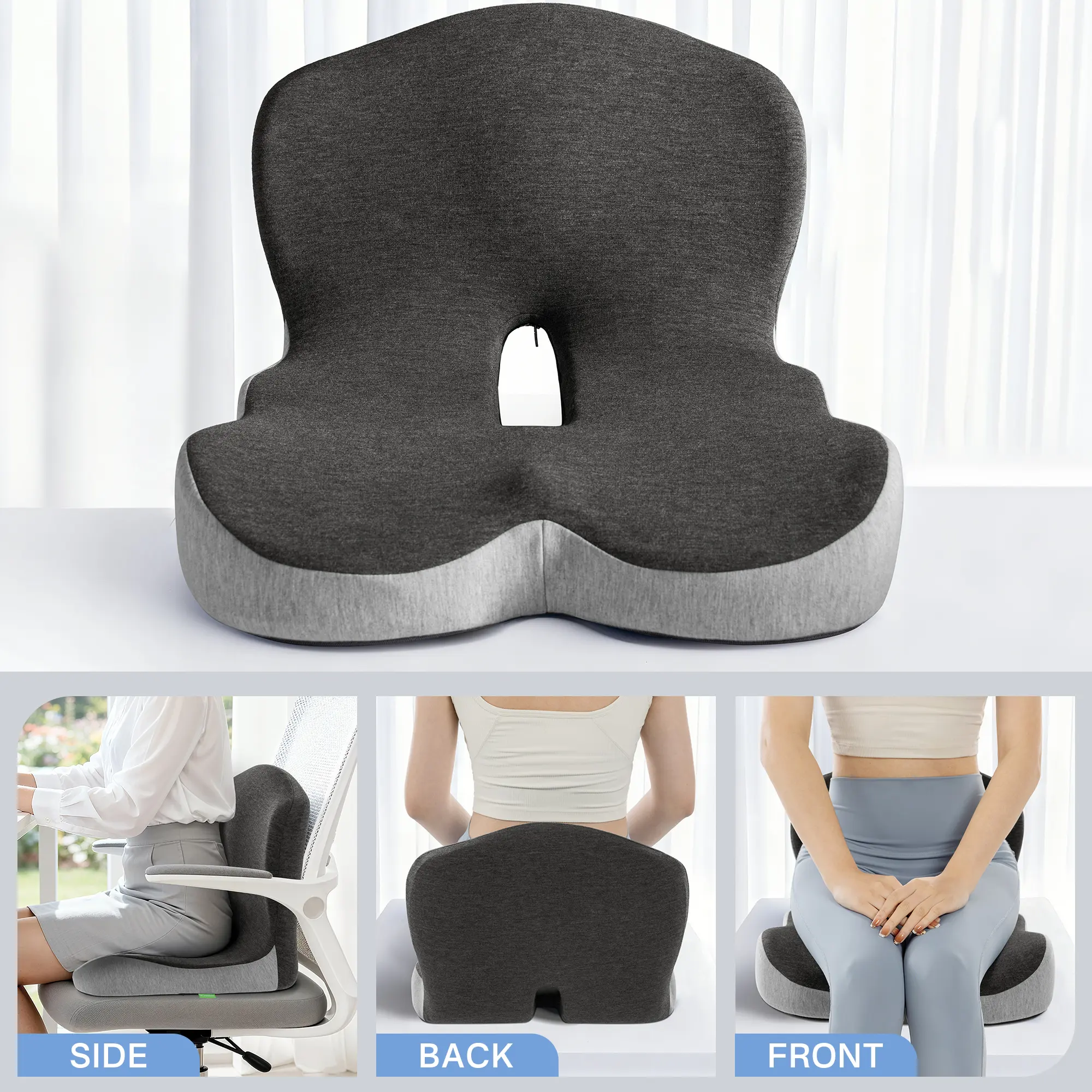 One-piece seat + lumbar cushion provides full support for the tailbone and lower back, helping maintain healthy posture during long sitting.