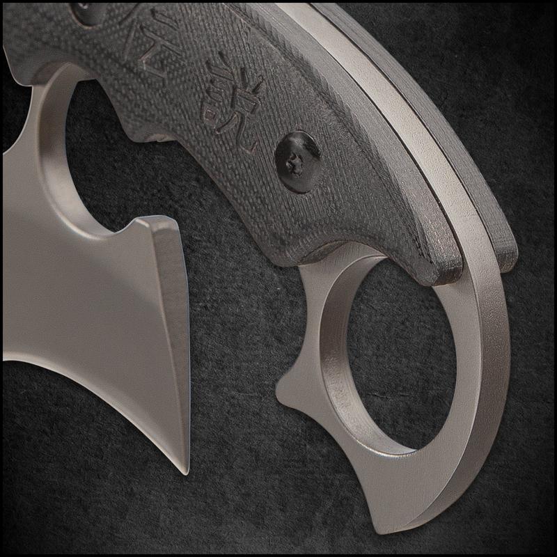 UNIQUE DESIGN COMBINATION: Merges the traditional karambit and ulu knife features for enhanced versatility.FULL-TANG BLADE: 5 4/5” 3Cr13 stainless steel with a non-reflective finish for durability and low visibility.ERGONOMIC HANDLE: Black G10 scales, grooved for comfort and secured with heavy-duty screws.THUMB JIMPING: Provides additional control and stability during use.PREMIUM LEATHER SHEATH: Includes a black leather belt sheath with a snap strap closure for convenient storage and carry.