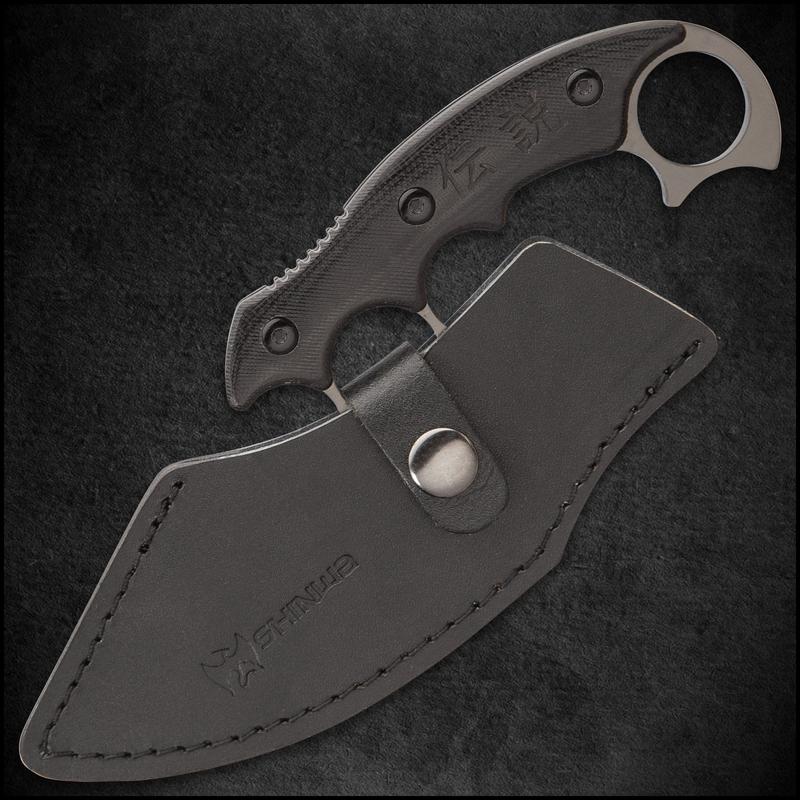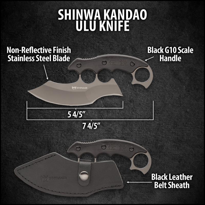 Shinwa Kandao Ulu Knife 3Cr13 stainless steel 5 4/5" full-tang blade UNIQUE DESIGN COMBINATION: Merges the traditional karambit and ulu knife. ERGONOMIC HANDLE: Black G10scales PREMIUM LEATHER SHEATH: Includes a black leather belt sheath #knife #karambit #edc #giftideas #sharp
