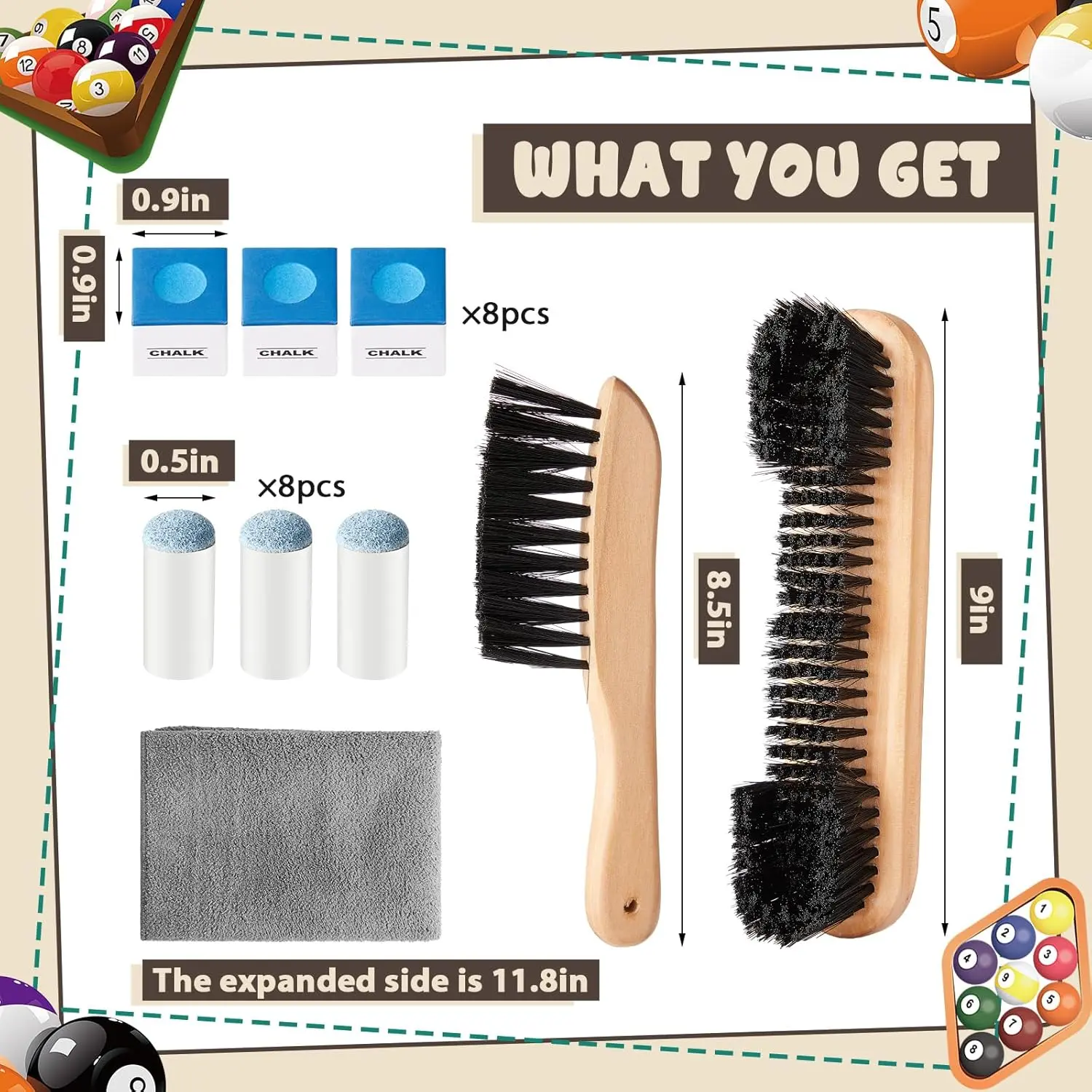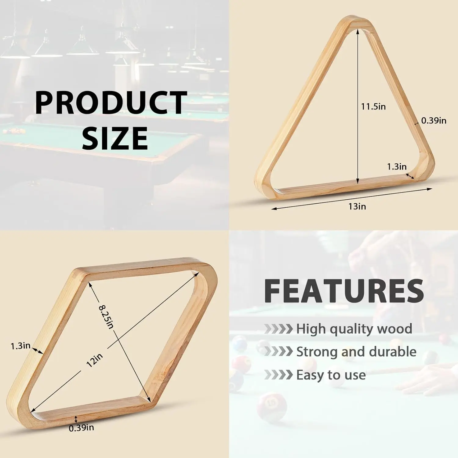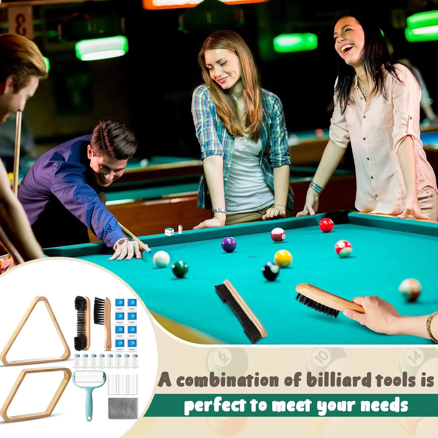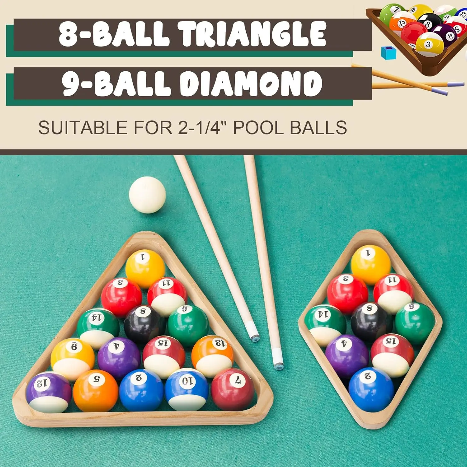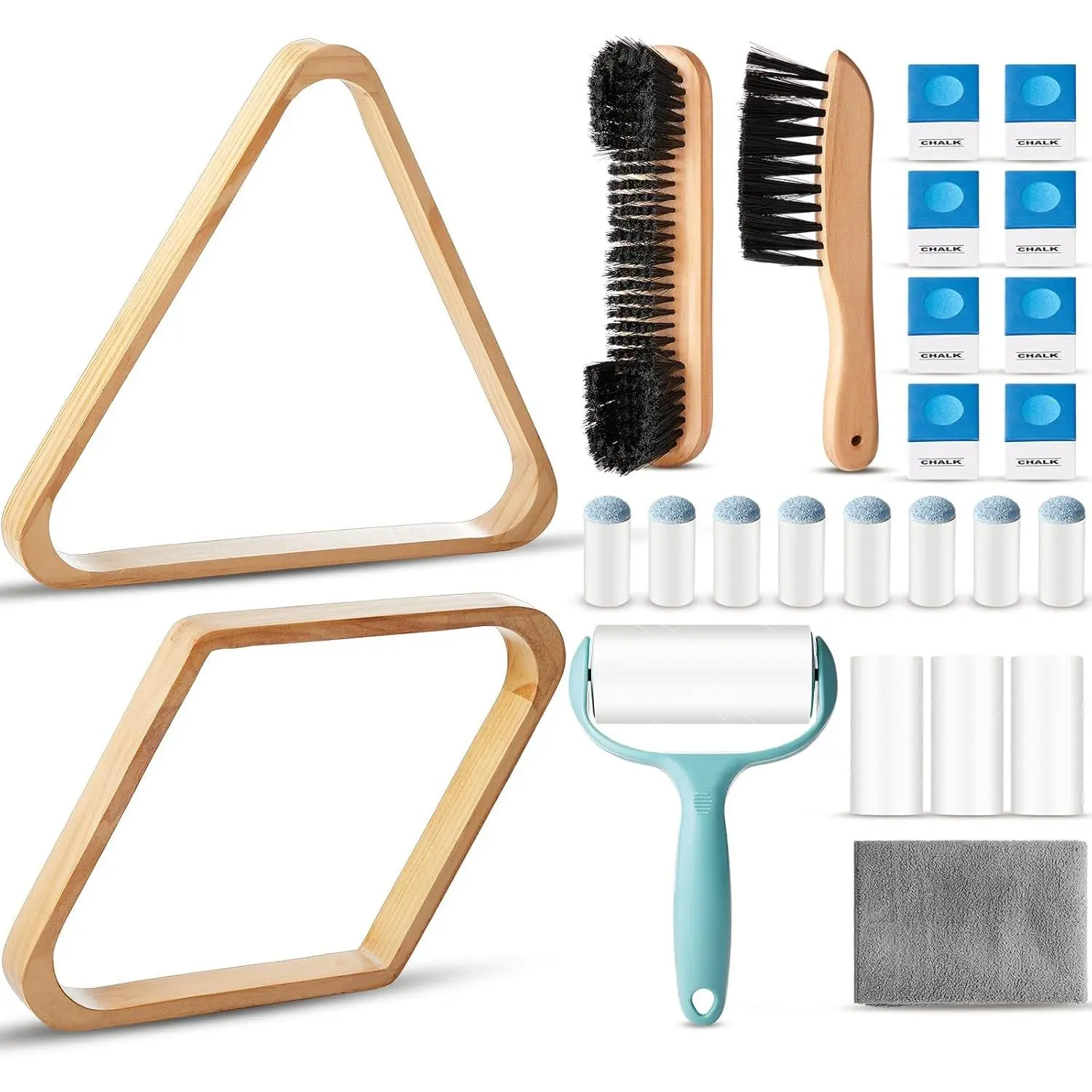 ShinyRelief 22 Pcs Pool Table Brush Set Wooden Billiard Rack 8 or 9 Ball Triangle Diamond for 2-1/4" Pool Ball with Polish Cloth Sticky Lint Roller Cue Chalk Cube Accessories