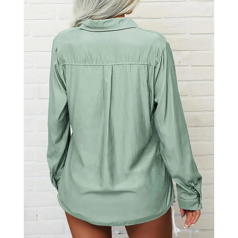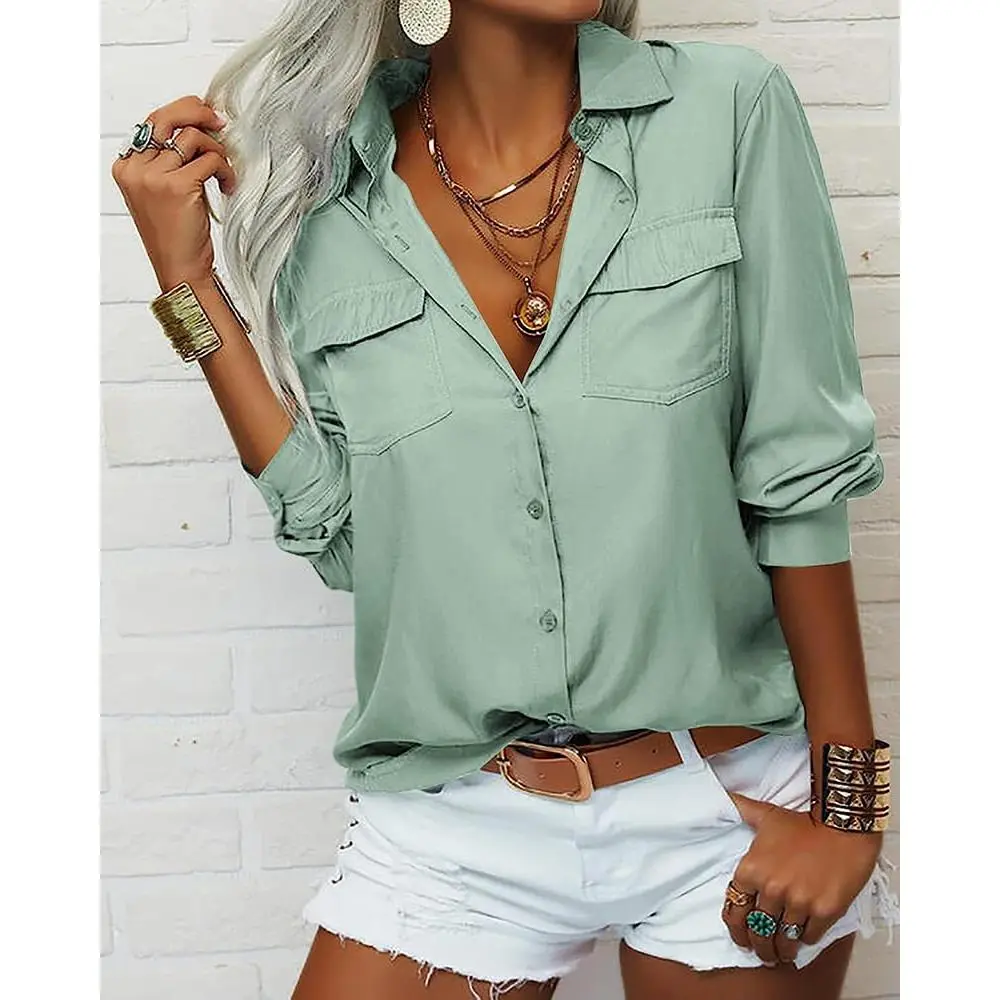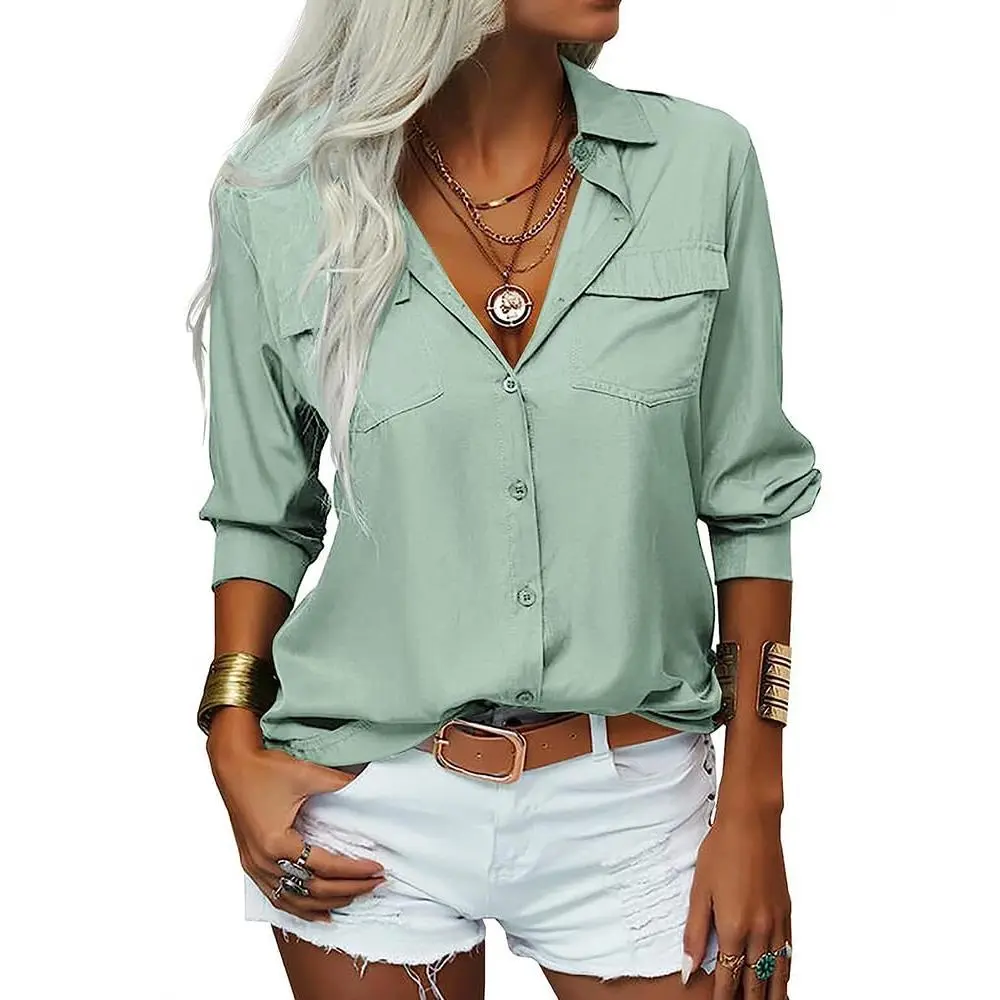Β·Unique Design: Women long sleeve shirt with button cuffs / button up / solid color / bust pocket /collared / v neck / loose fit/ office blouse/ work tops
