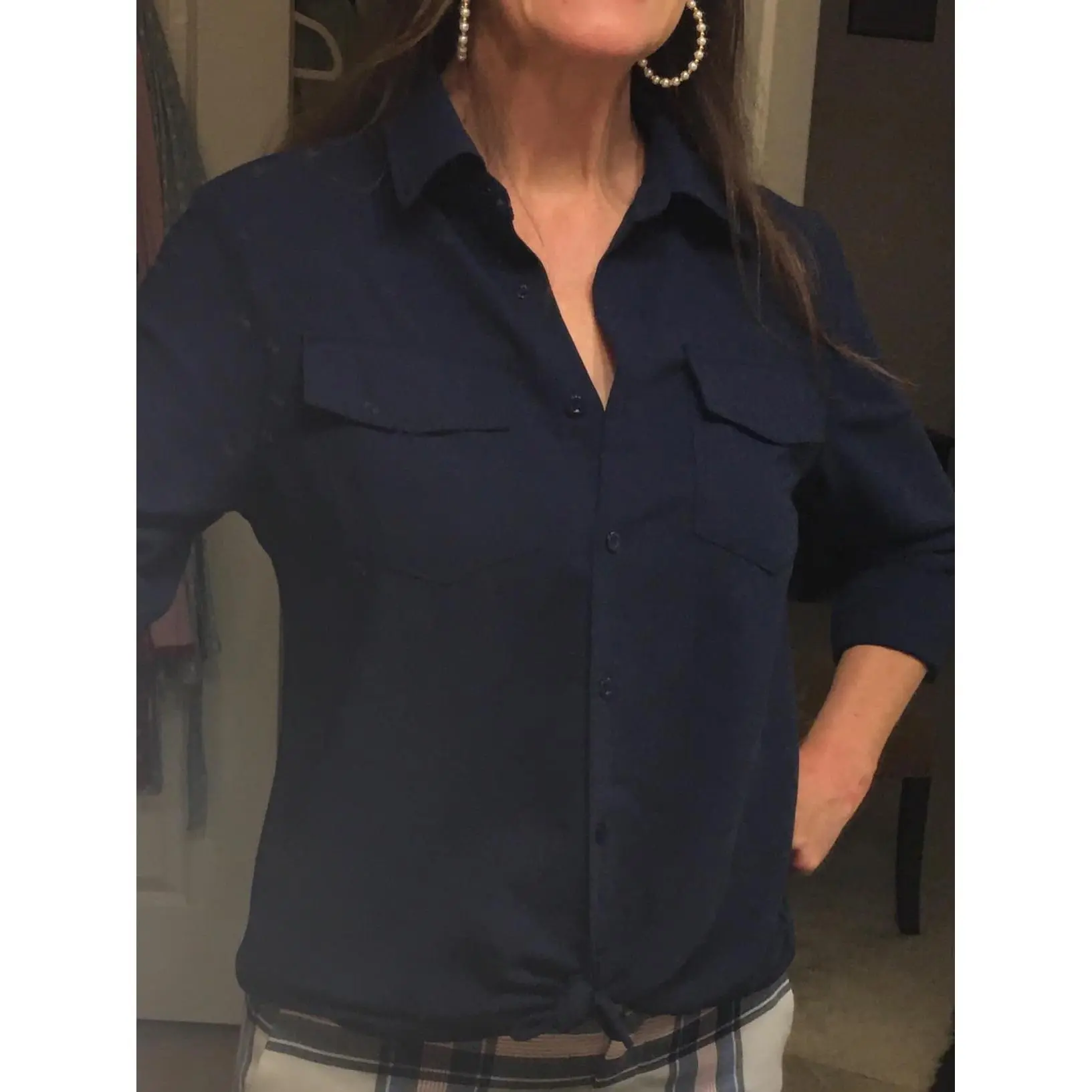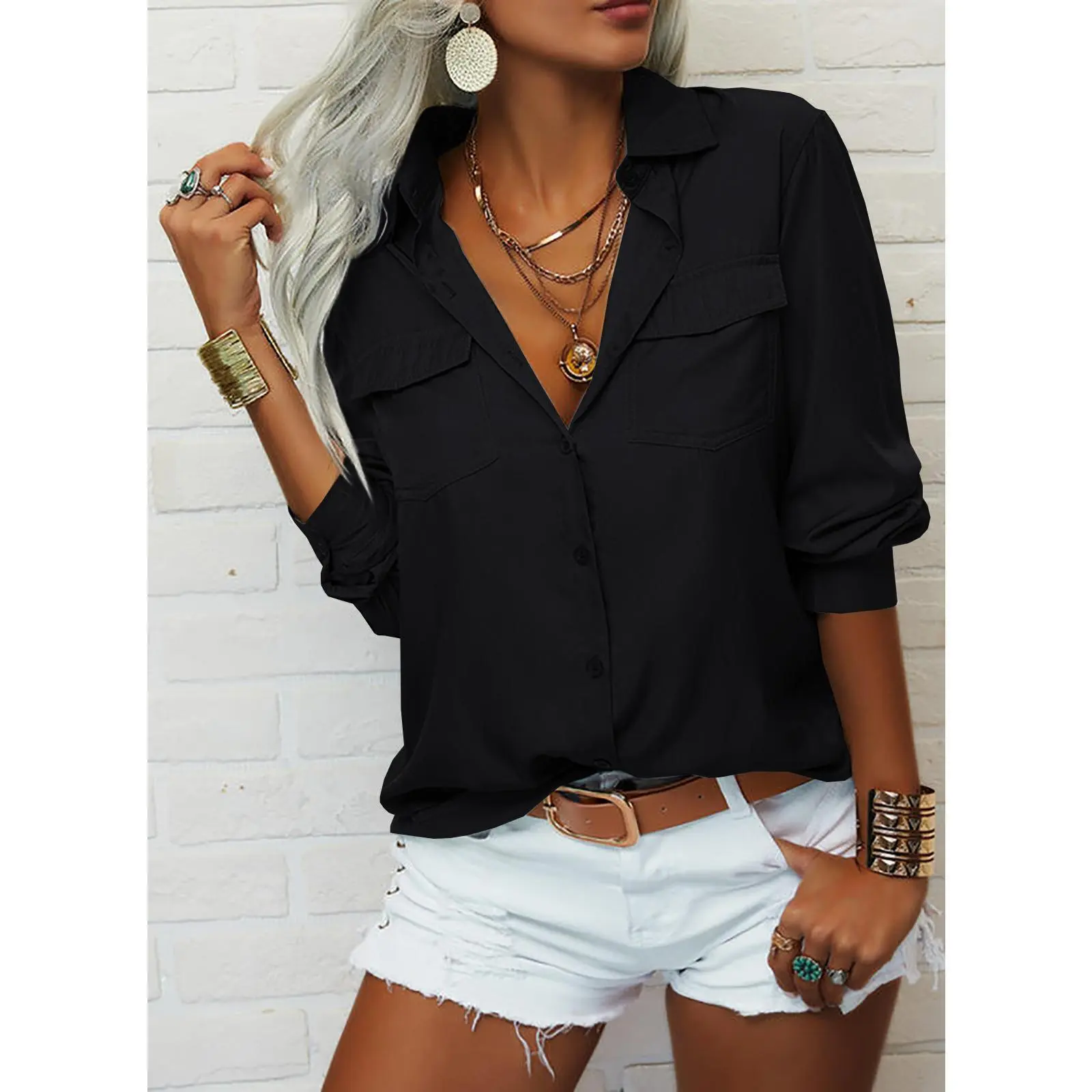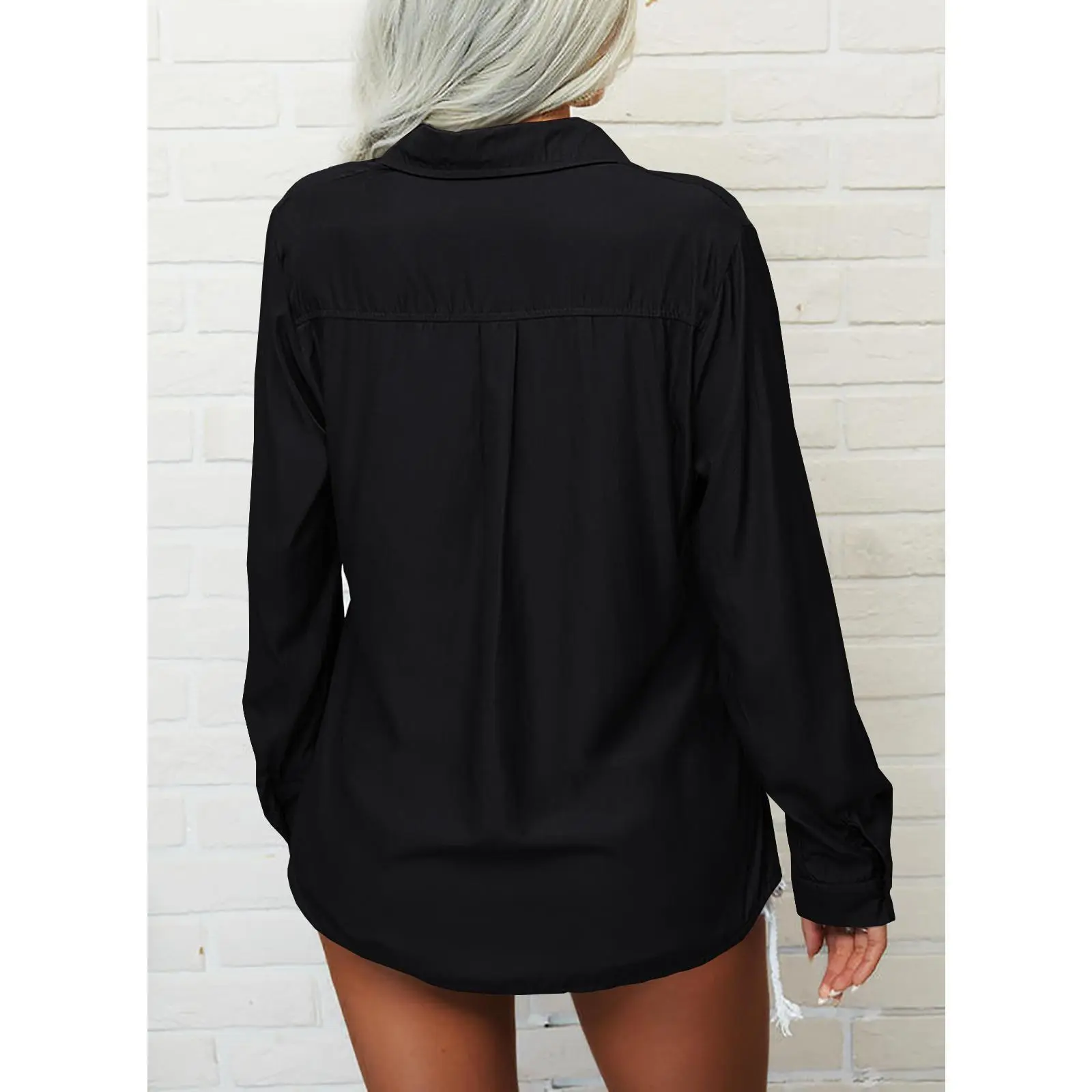 Β·Unique Design: Women long sleeve shirt with button cuffs / button up / solid color / bust pocket /collared / v neck / loose fit/ office blouse/ work tops