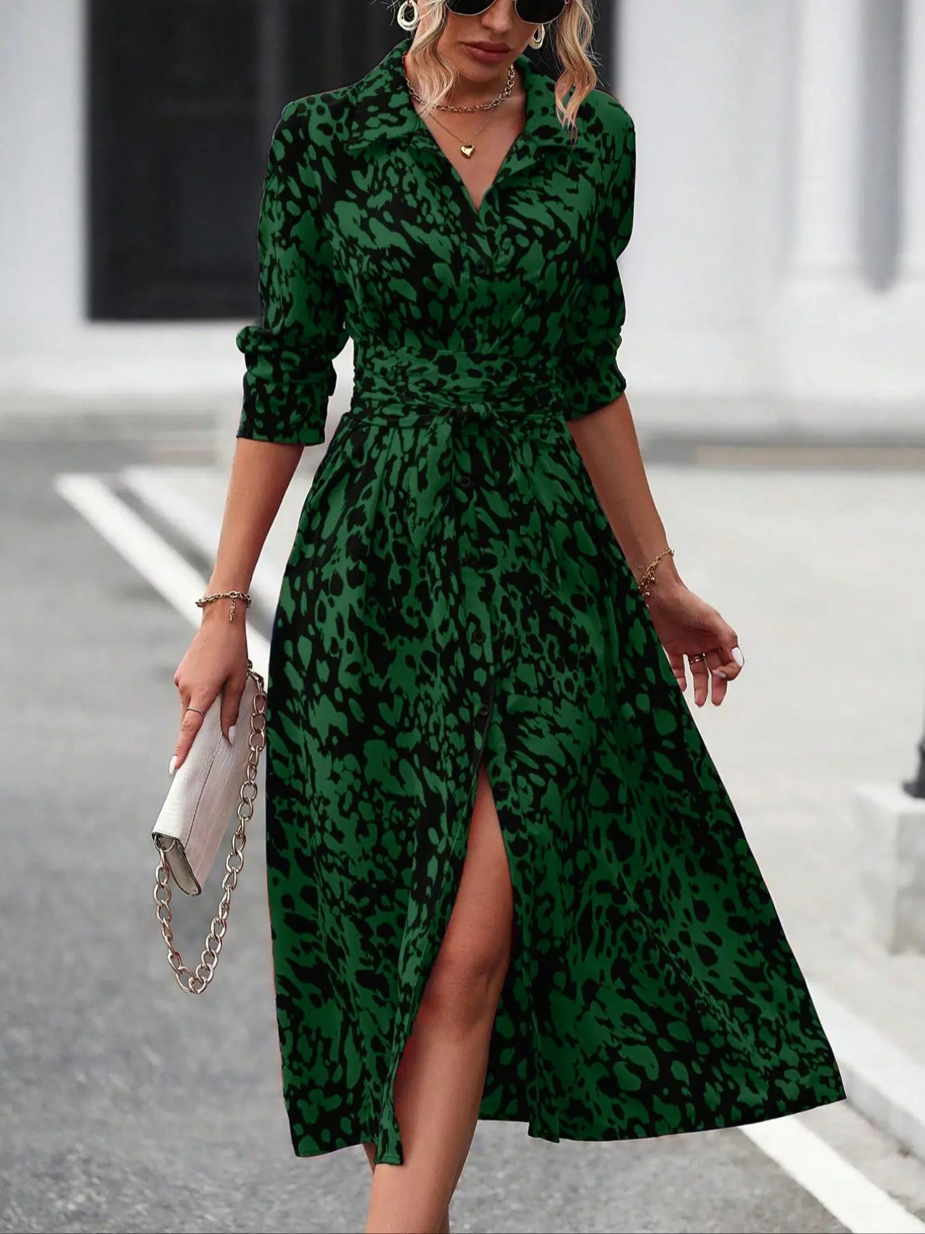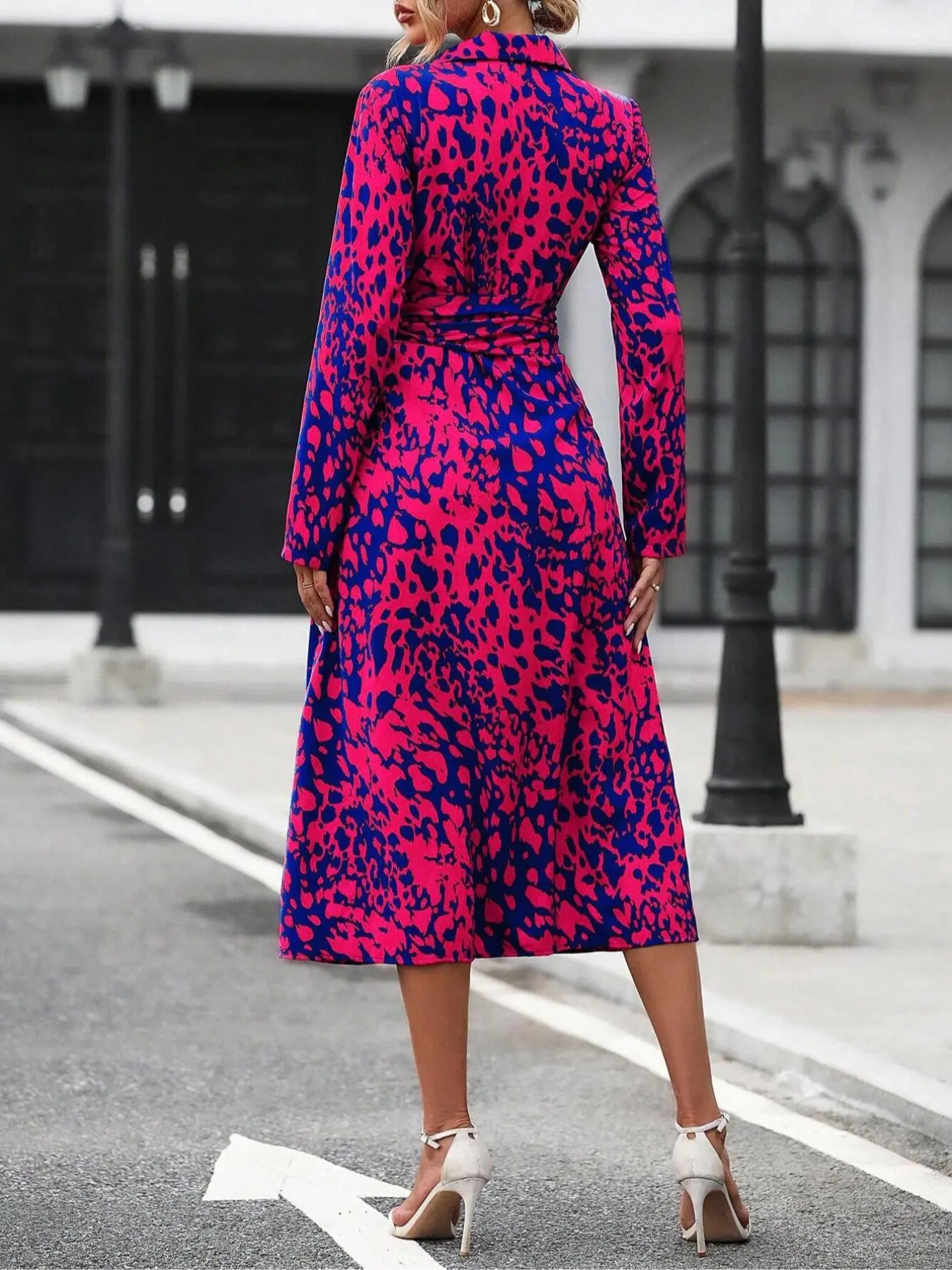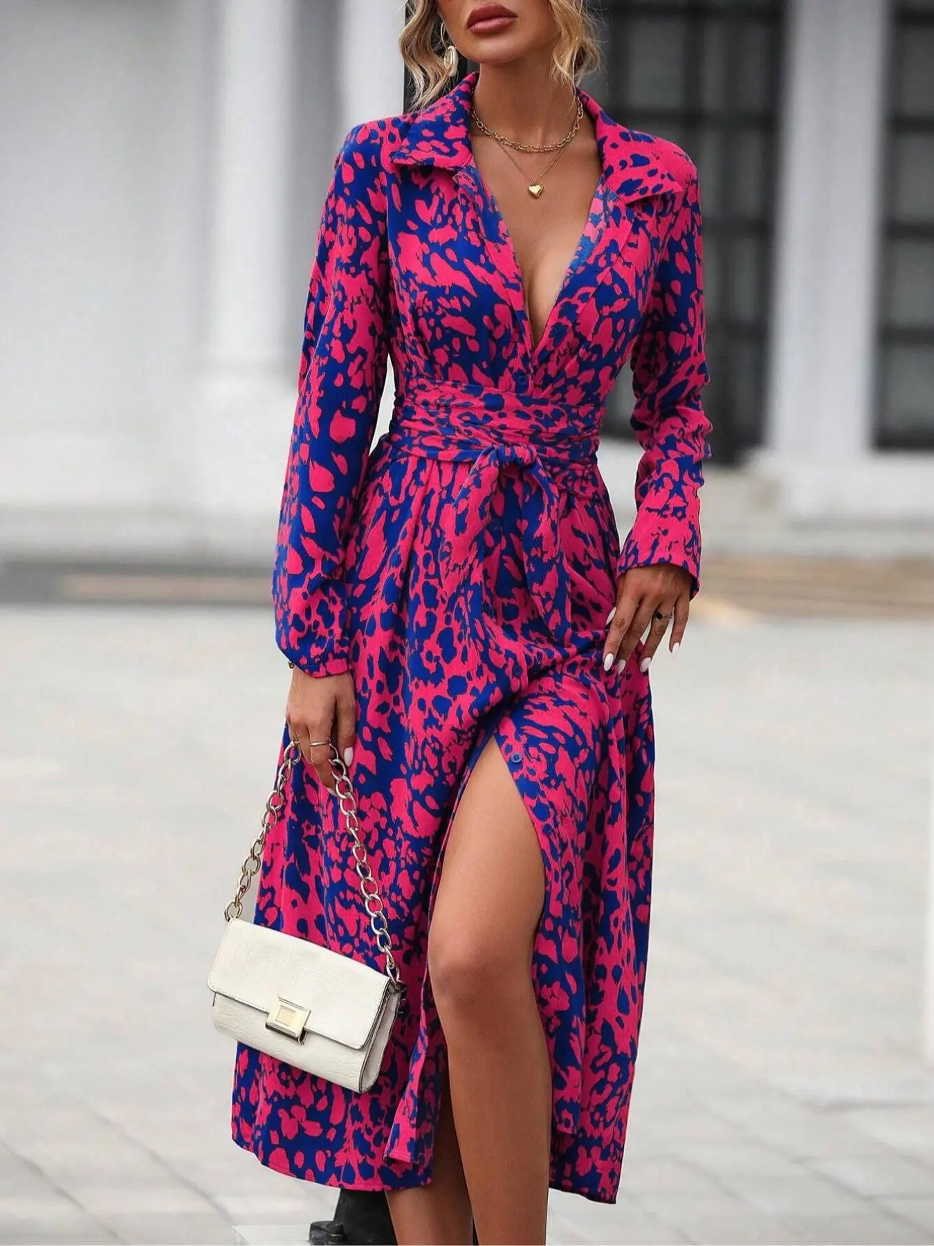 This women’s dress stands out with its vibrant hot pink color and all-over print design. Featuring a button-down front, it’s a versatile piece perfect for casual outings, brunch dates, or even vacation wear.