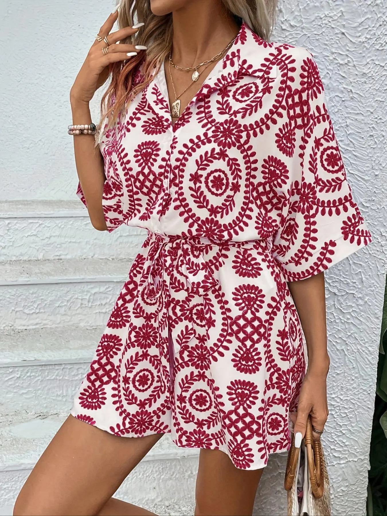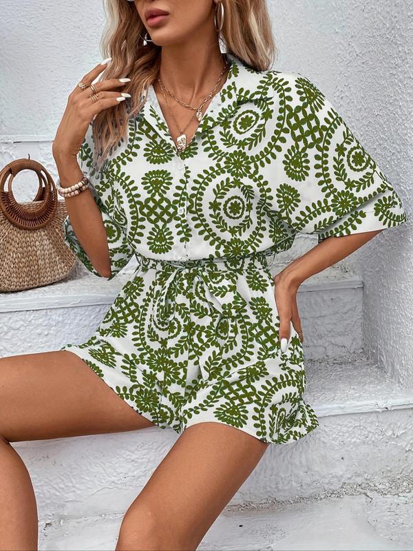 5. Women's All Over Print Button Front Belted Shirt Romper, Casual Batwing Sleeve Collared Playsuit for Summer, Women's Clothes for Daily Wear