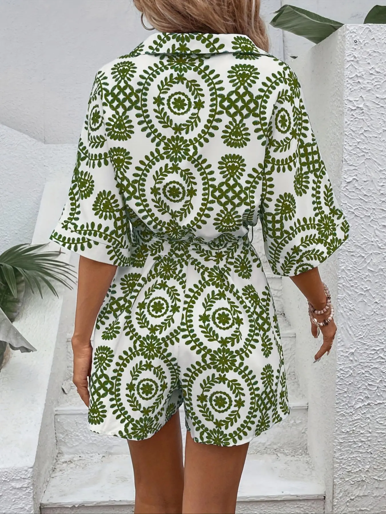 Women's All Over Print Button Front Belted Shirt Romper, Casual Batwing Sleeve Collared Playsuit for Summer, Women's Clothes for Daily Wear