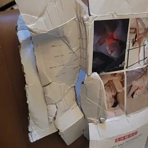 So this is how the package arrived. I was away just got home, I have no clue if the mask is damaged or not because there’s a very strong fume coming out of it which immediately triggered my migraines- it maybe plastic I don’t know. But I don’t feel comfortable or able to put it on my face.