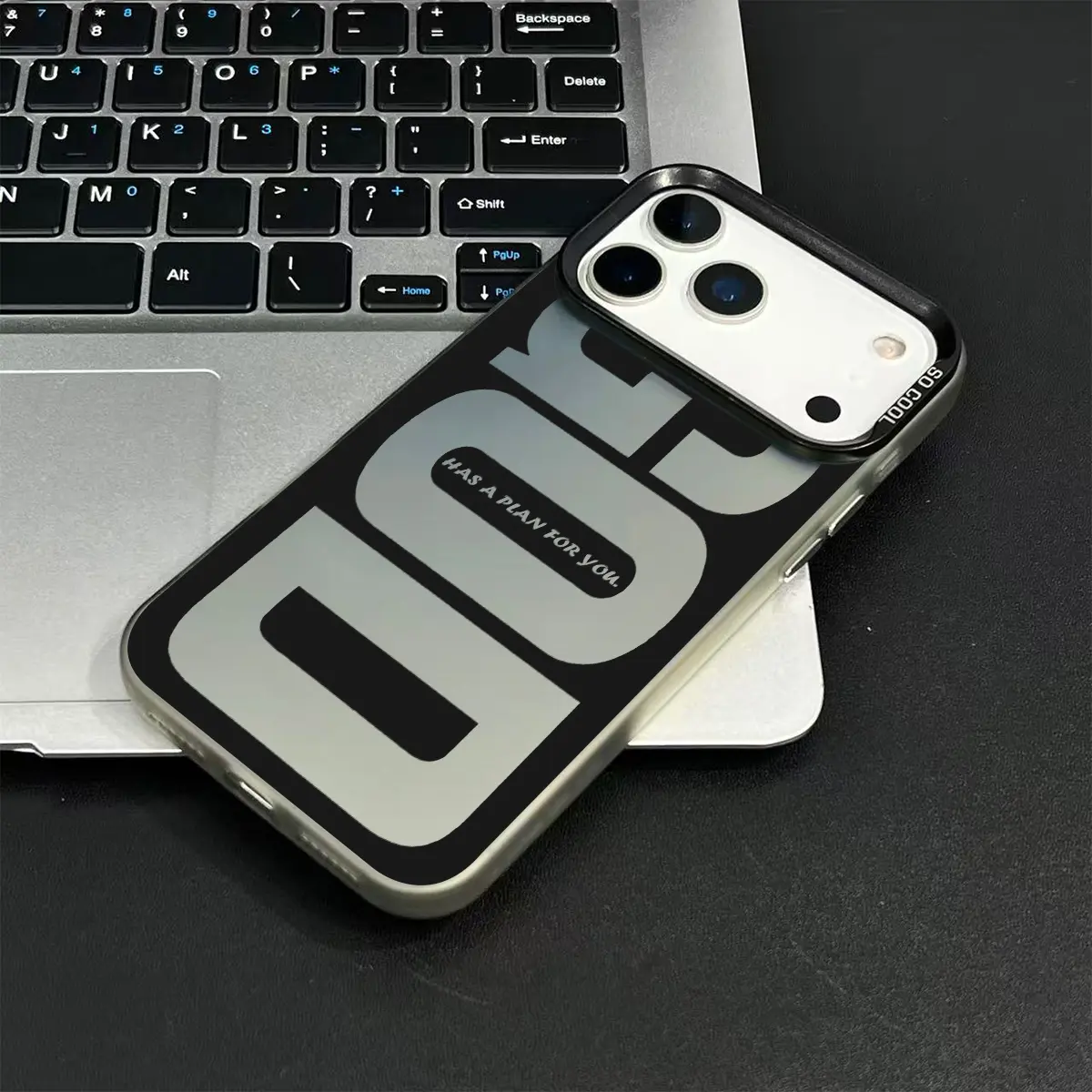 The image showcases the phone case with the "God Has A Plan for You" pattern, highlighting its matte finish and protective features.