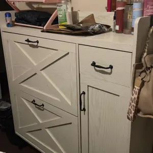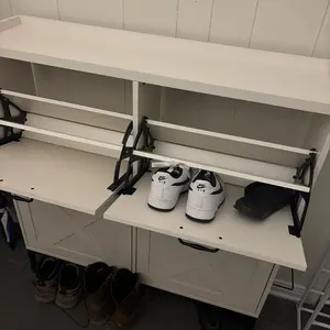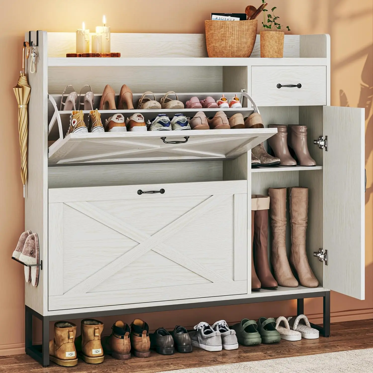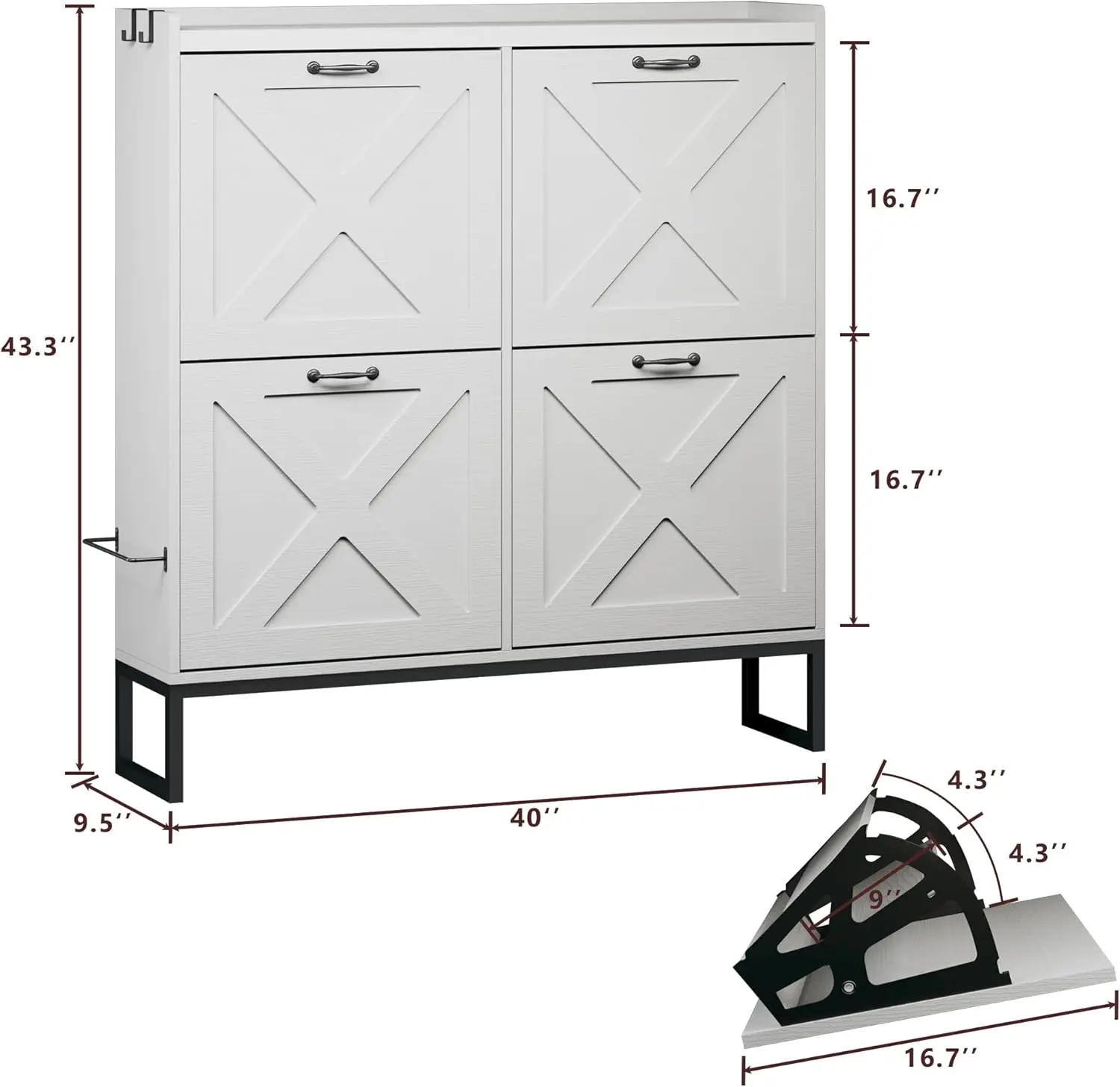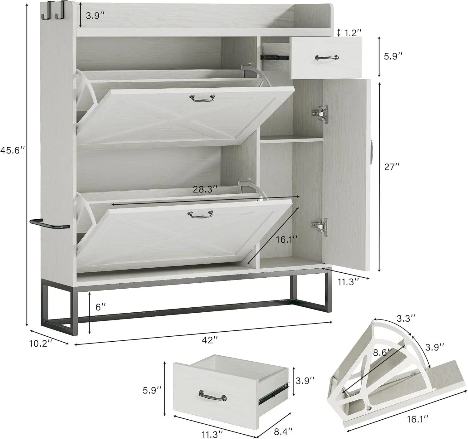 ·Adjustable & Flexible Shoe Cabinet:The shoe storage cabinet features a flexible adjustable design. The flip-out drawers have shelves with 2 adjustable heights to accommodate various shoe sizes. The side cabinet for shoes also offers adjustable shelf, perfect for mid-calf and tall boots, and side hooks for hanging umbrellas, keys, bags, and hats.
