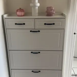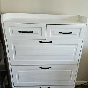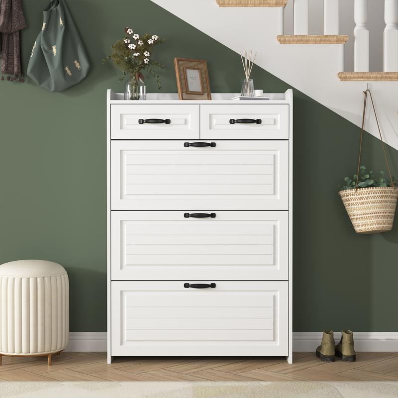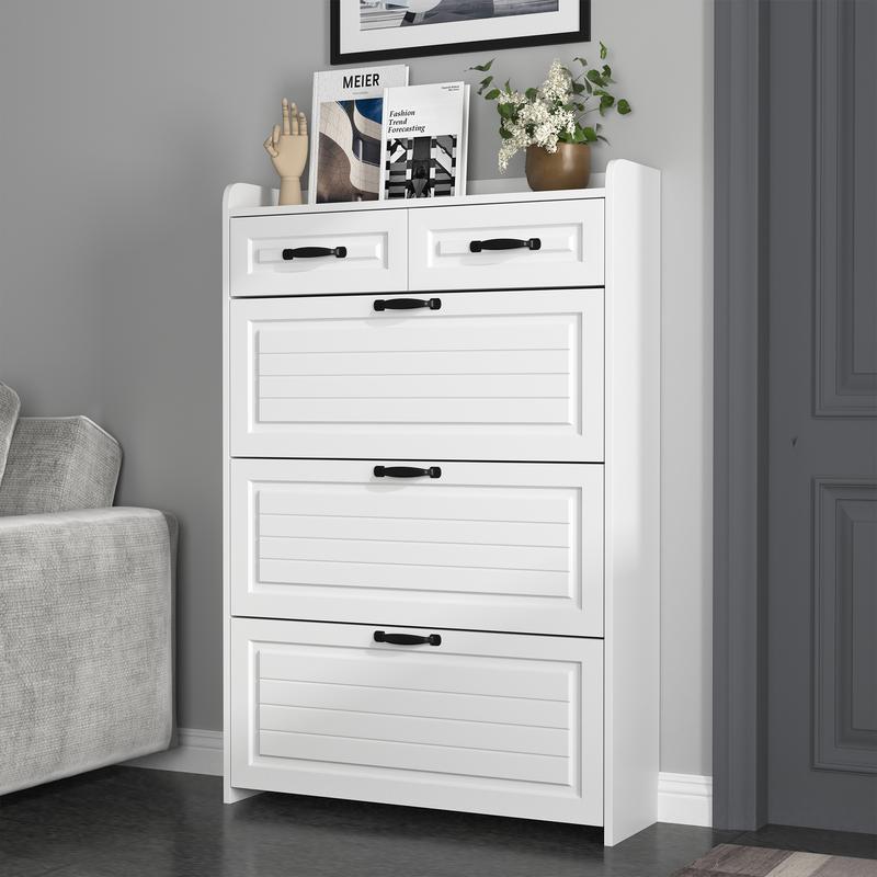·[Ample Storage Space] This shoe cabinet has 3 flip drawers and 2 sliding drawers. The spacious top surface and storage drawers are perfect for accessories,keys,wallet and etc and make you easier to access items. The slim shoe cabinet fits most shoes, can accommodate about 18-24 pairs of shoes at least, providing sufficient storage space(Not for size ten or bigger than that).