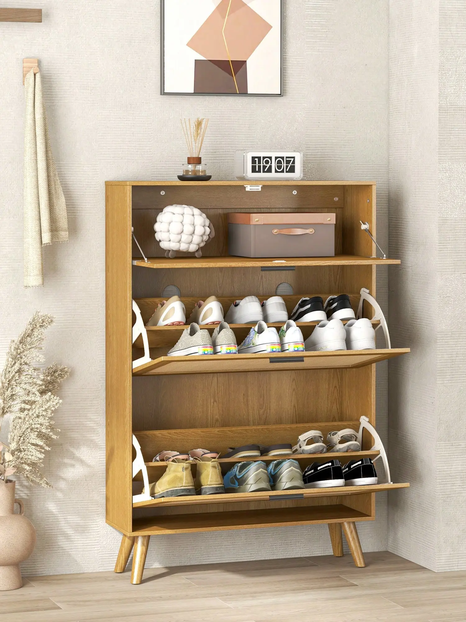 This natural-colored shoe cabinet exudes a warm and cozy atmosphere, transporting you to the tranquility of a forest. The rattan doors elegantly interweave beautiful patterns, embodying a blend of antiquity and modernity, and evoking a nostalgic rural vibe. Whether storing shoes or serving as a decorative piece, it brings a sense of joy and relaxation to any space.