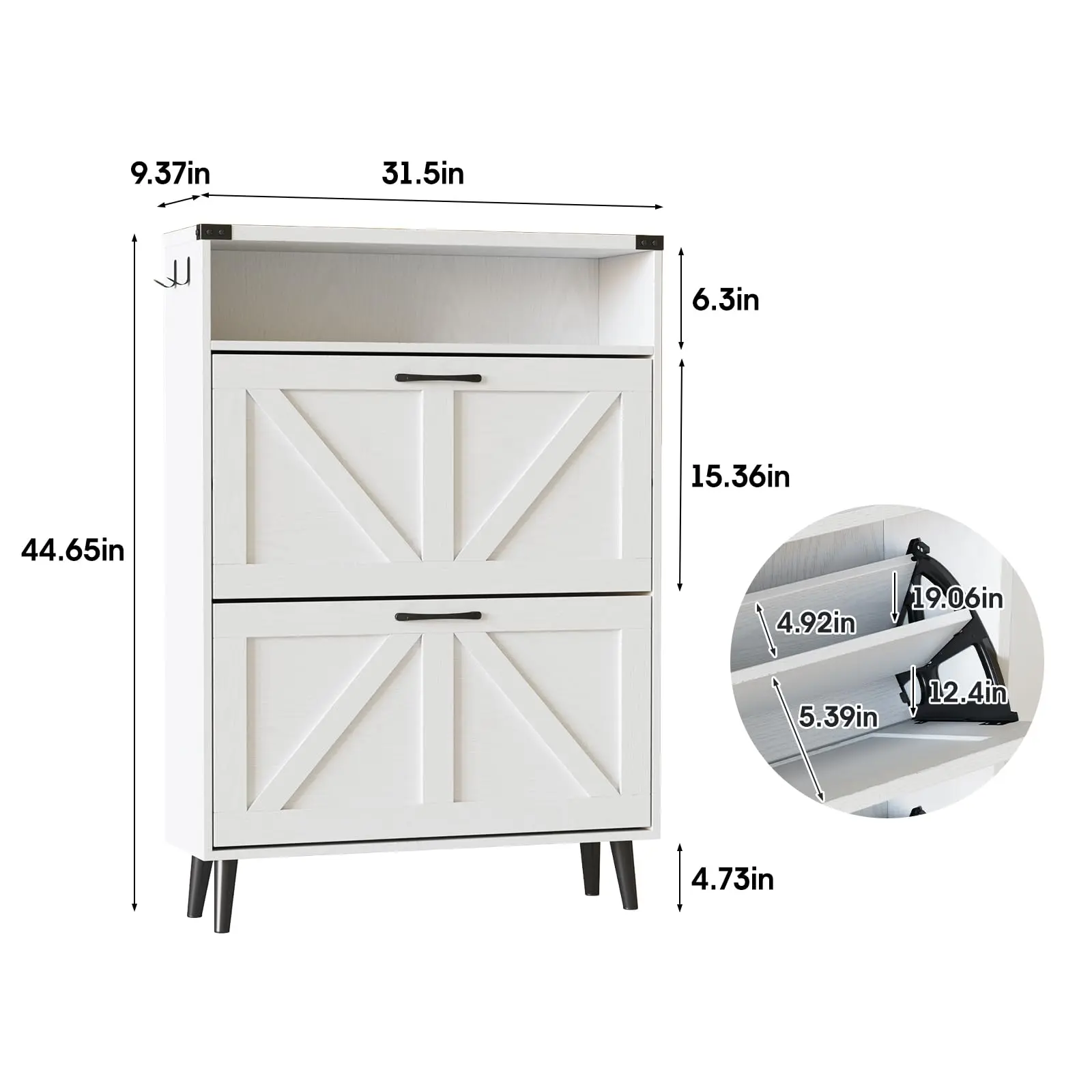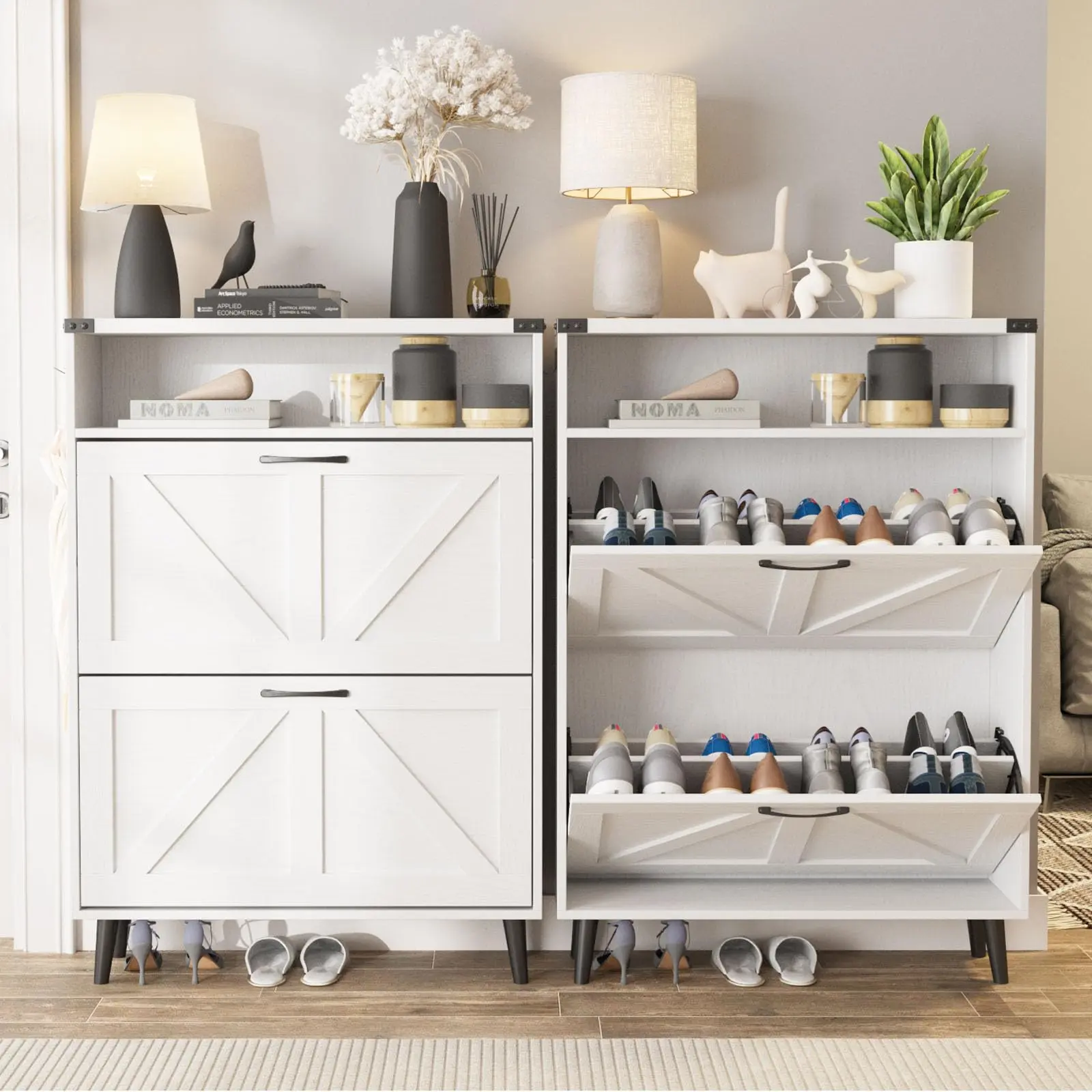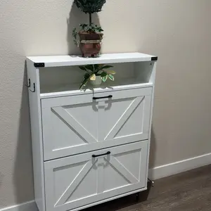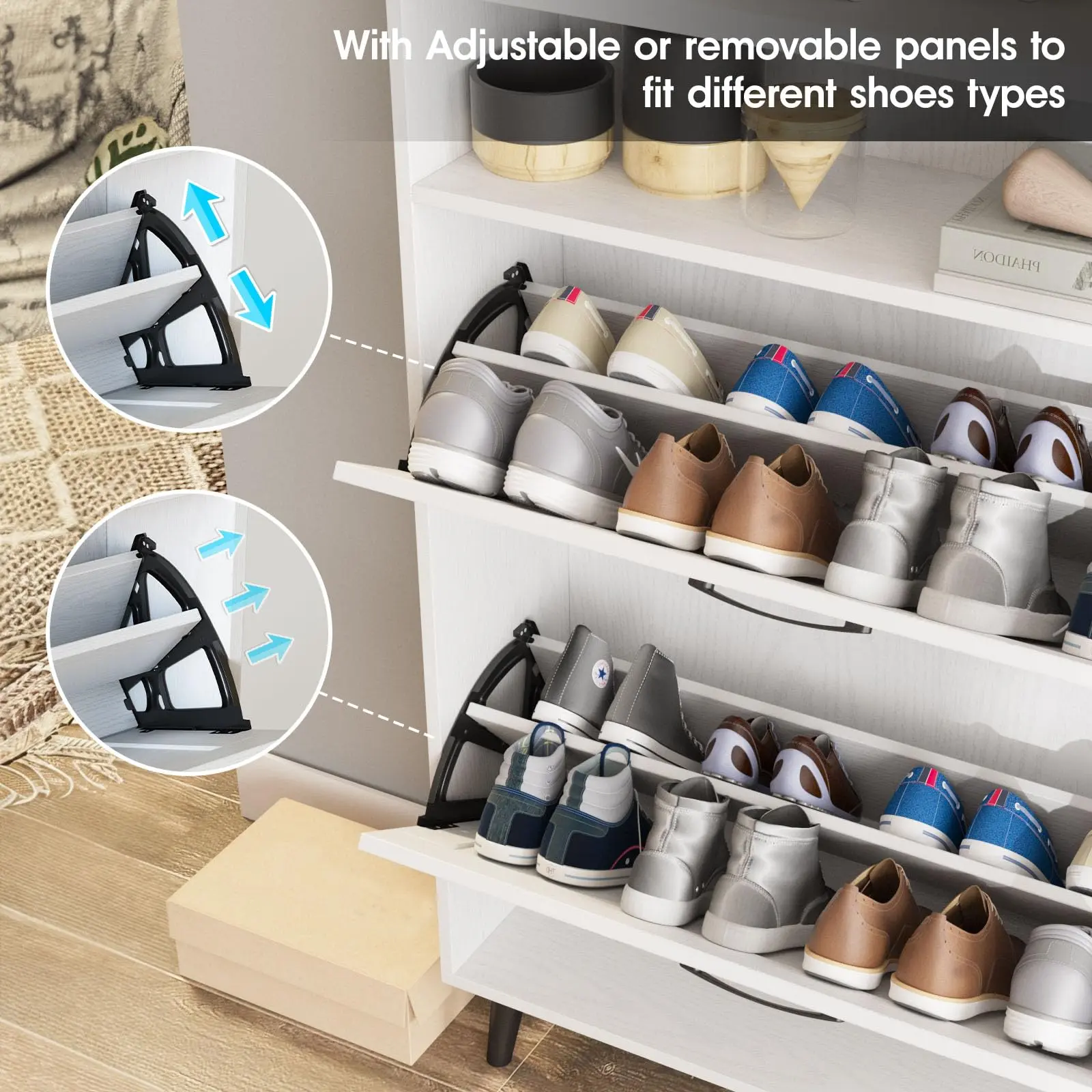 Flip Drawers Shoe Cabinet: Our drawers shoe cabinet has two flip drawers and 2 tiers inside each drawer,It features a removable divider in each compartment, you can choose to keep or remove the panel according to the size or style of your shoes.
