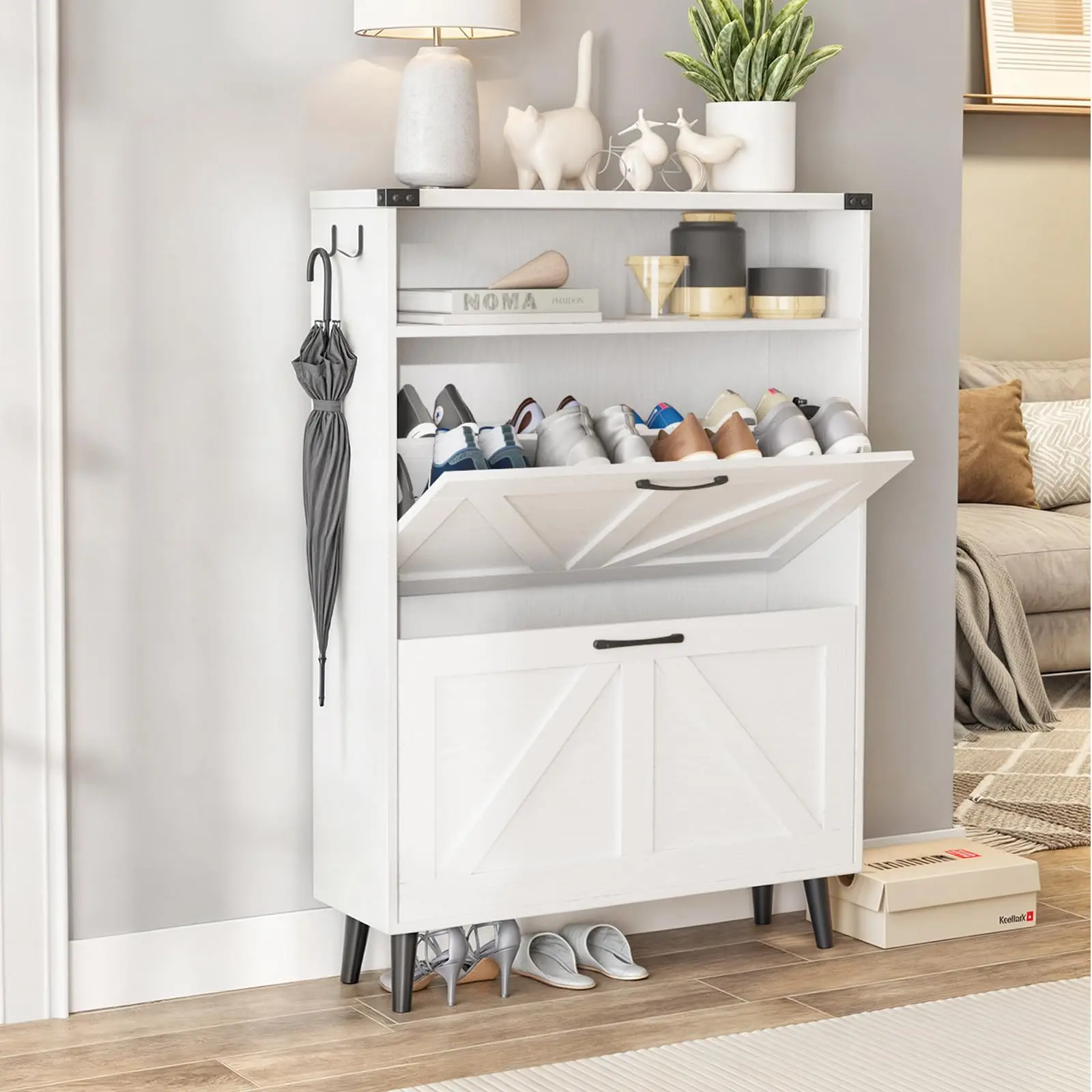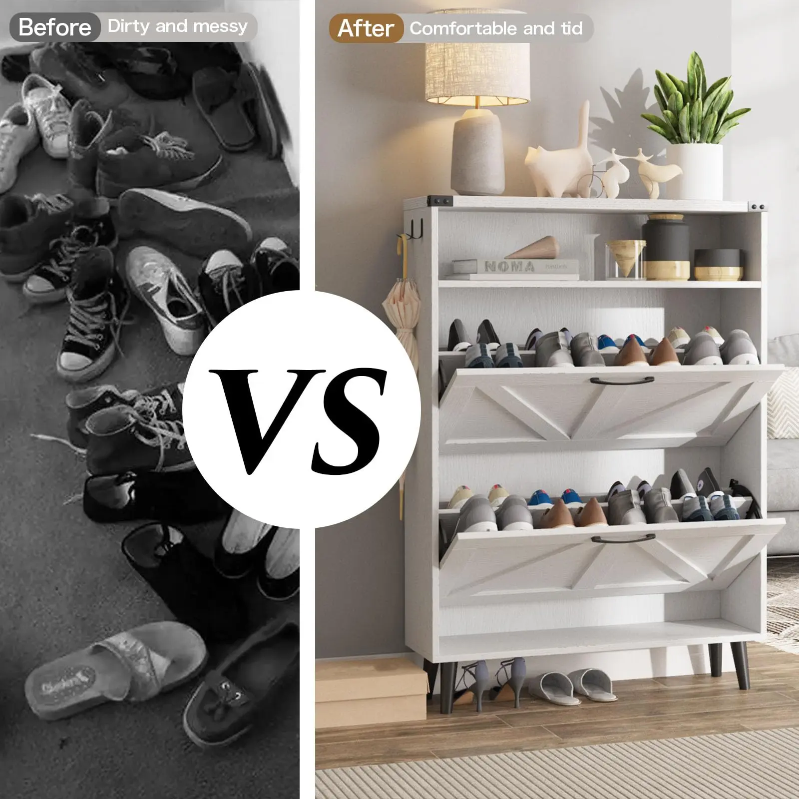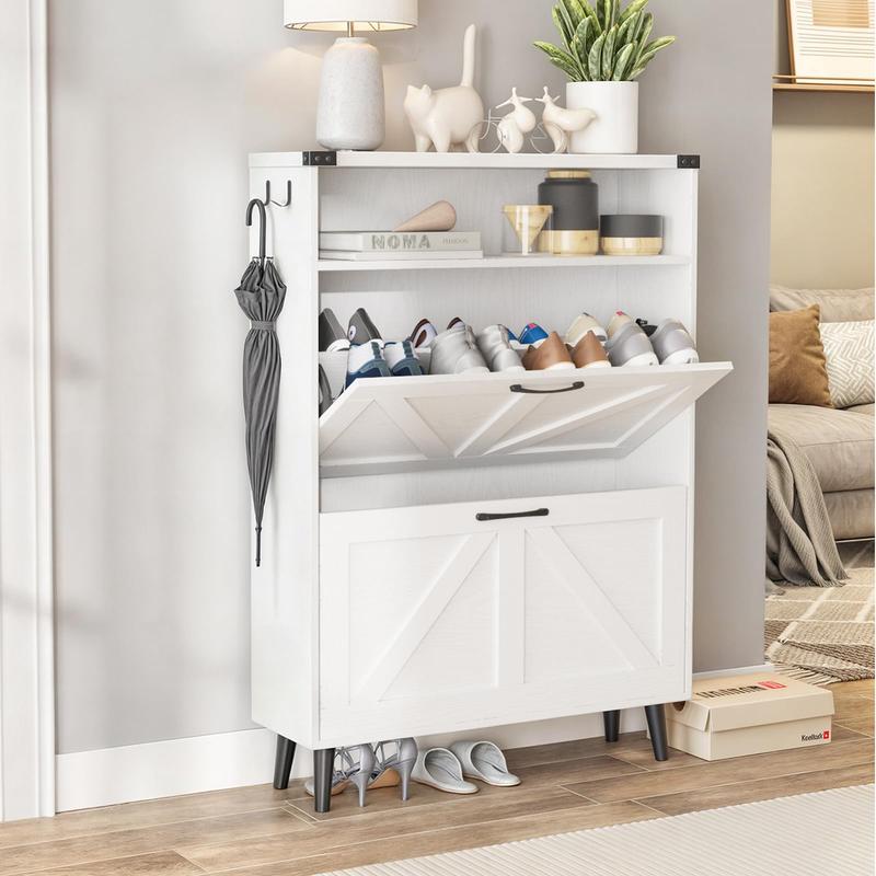 Entryway Slim Shoe Cabinet: This shoe storage rack takes up little space,It can not only store a large number of shoes but also does not need to occupy too much ground area. The hidden tipping bucket design gives you a clean and orderly entryway space.