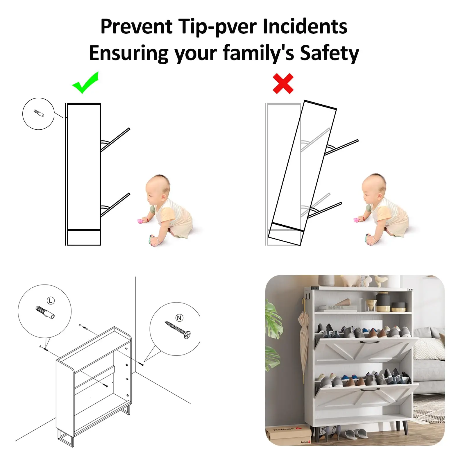 High Quality & Sturdy Construction: This slim shoe cabinet is a safe purchase when it comes to quality. Anti-tipping kits improve the stability. You don't worry about it falling by accident.Made of high-quality MDF wood,and black metal handle is simple and elegant,prevents scratches and injuries during use. Overall, it will get the shoe storaging job done and look good doing it. It's a perfect size shoe cabinet for every home space.