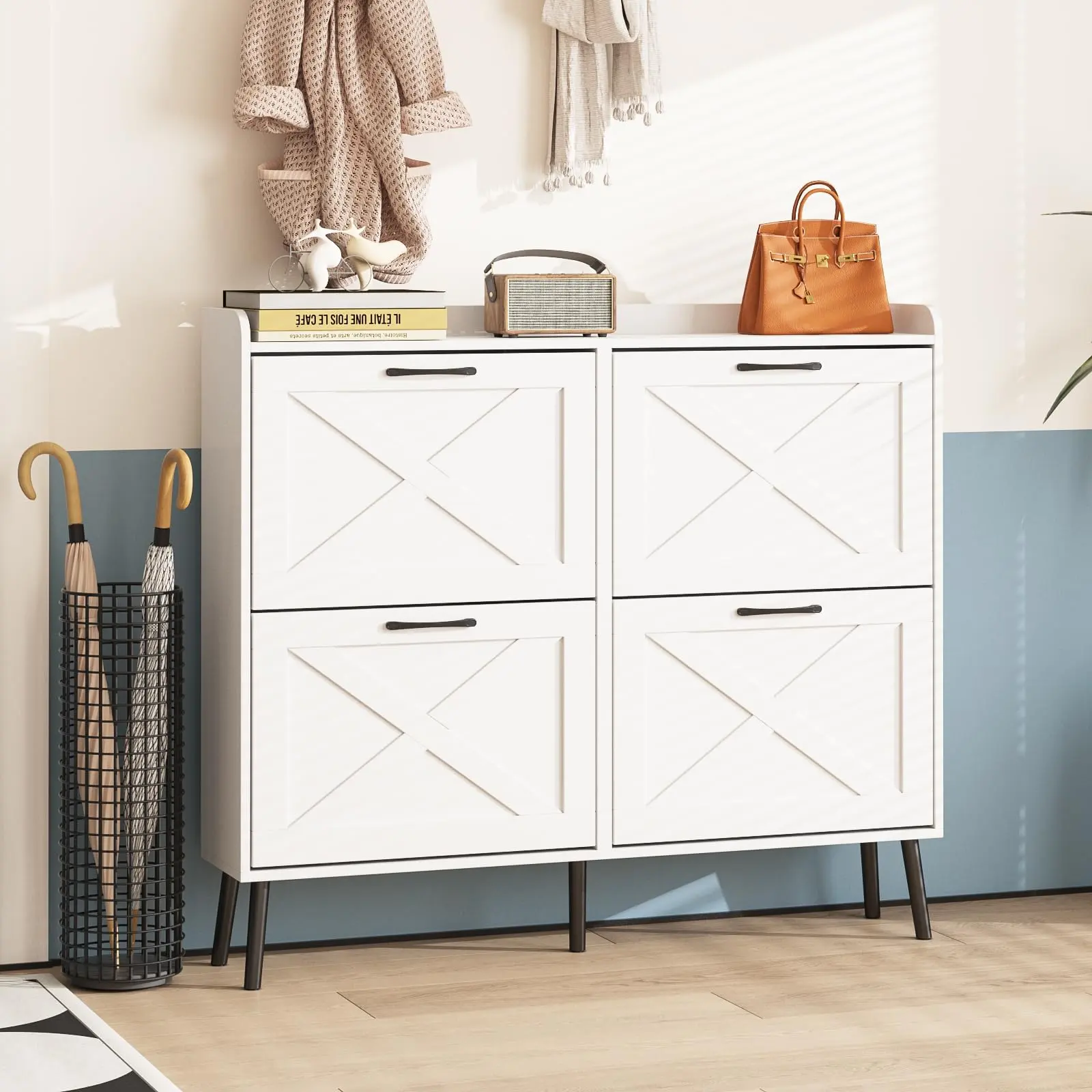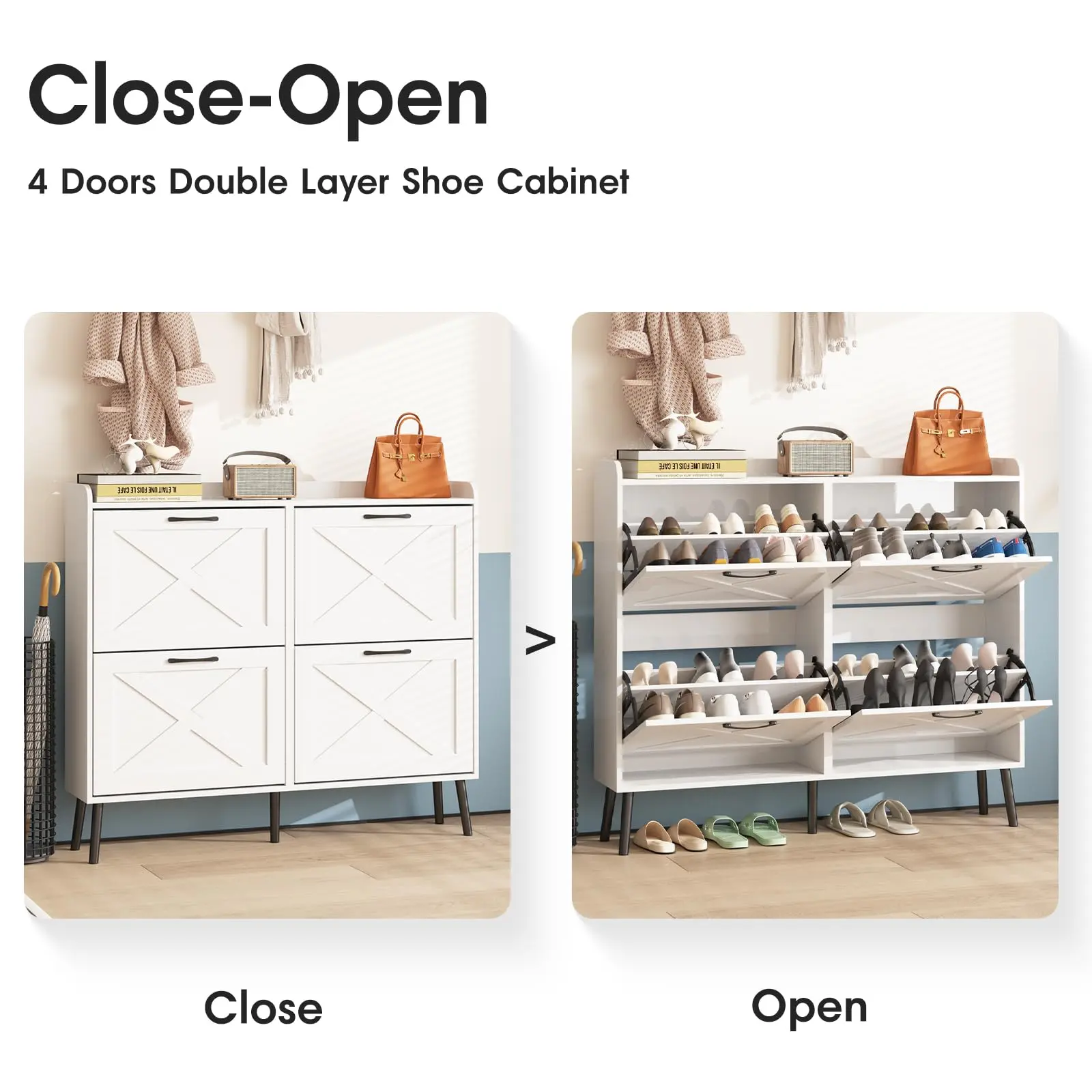 Entryway Shoe Cabinet: The hidden shoe storage cabinet with 4 flip doors, stylish and simple washed grey makes it a neat and beautiful finish and looks great in many different home styles. Perfect for placing in the entryway, hallway, living room, or porch, provides a neat looking in your home and space saving