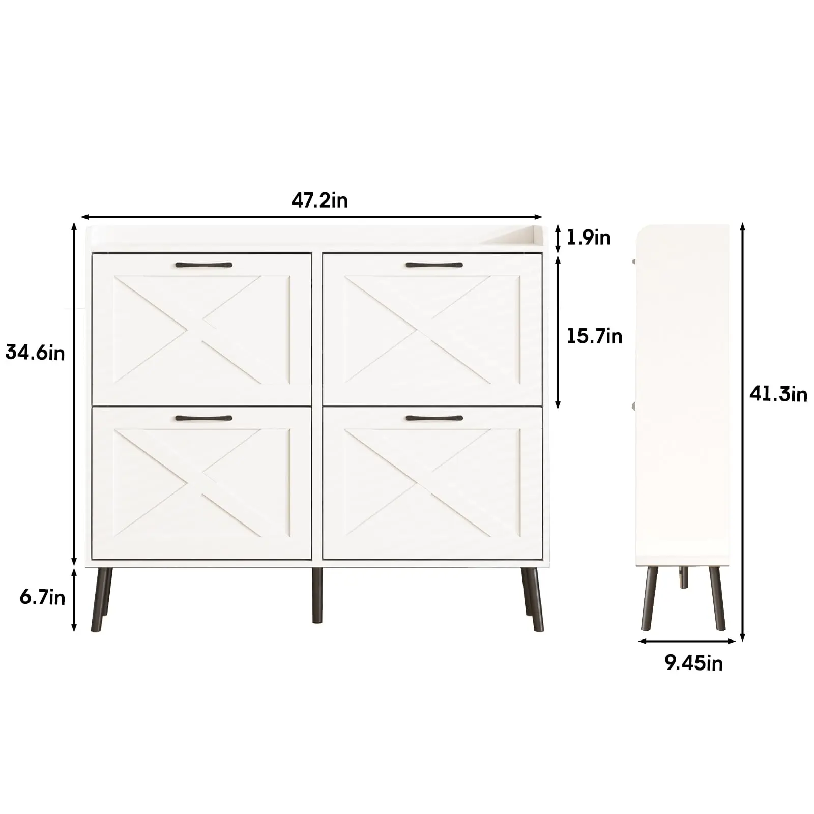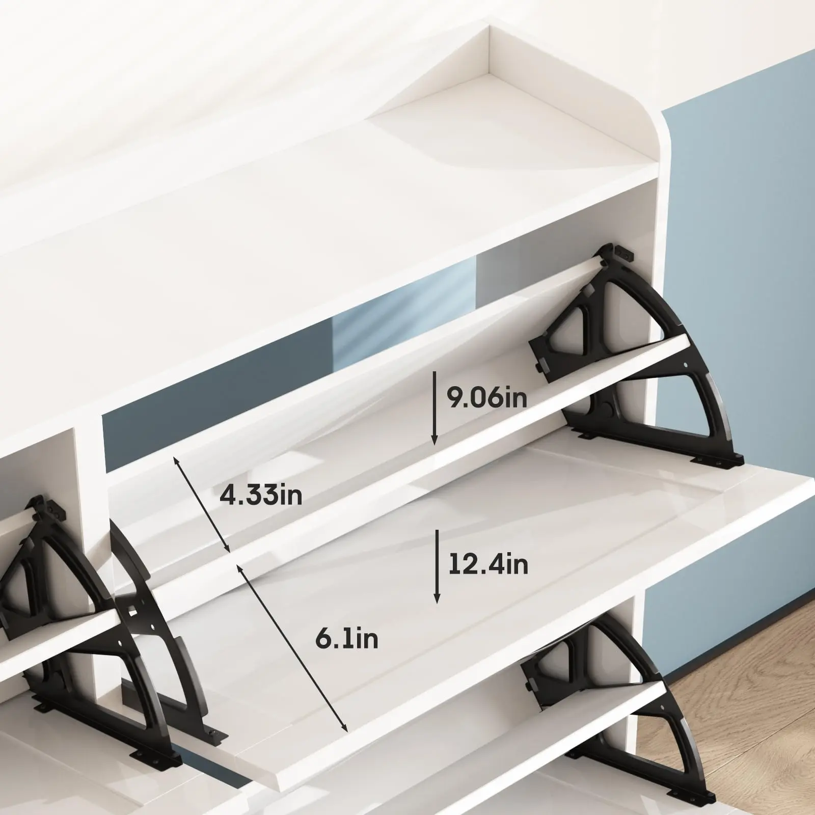 Narrow Shoe Cabinet: Most other shoe cabinets have a depth of 14-15in, while our slim shoe cabinet depth front to back is 9.35in! Only half the volume of other shoe cabinets, but it can neatly hide and store more and larger shoes! Innovative flip space-saving design, bringing more space in the entry area or hallway
