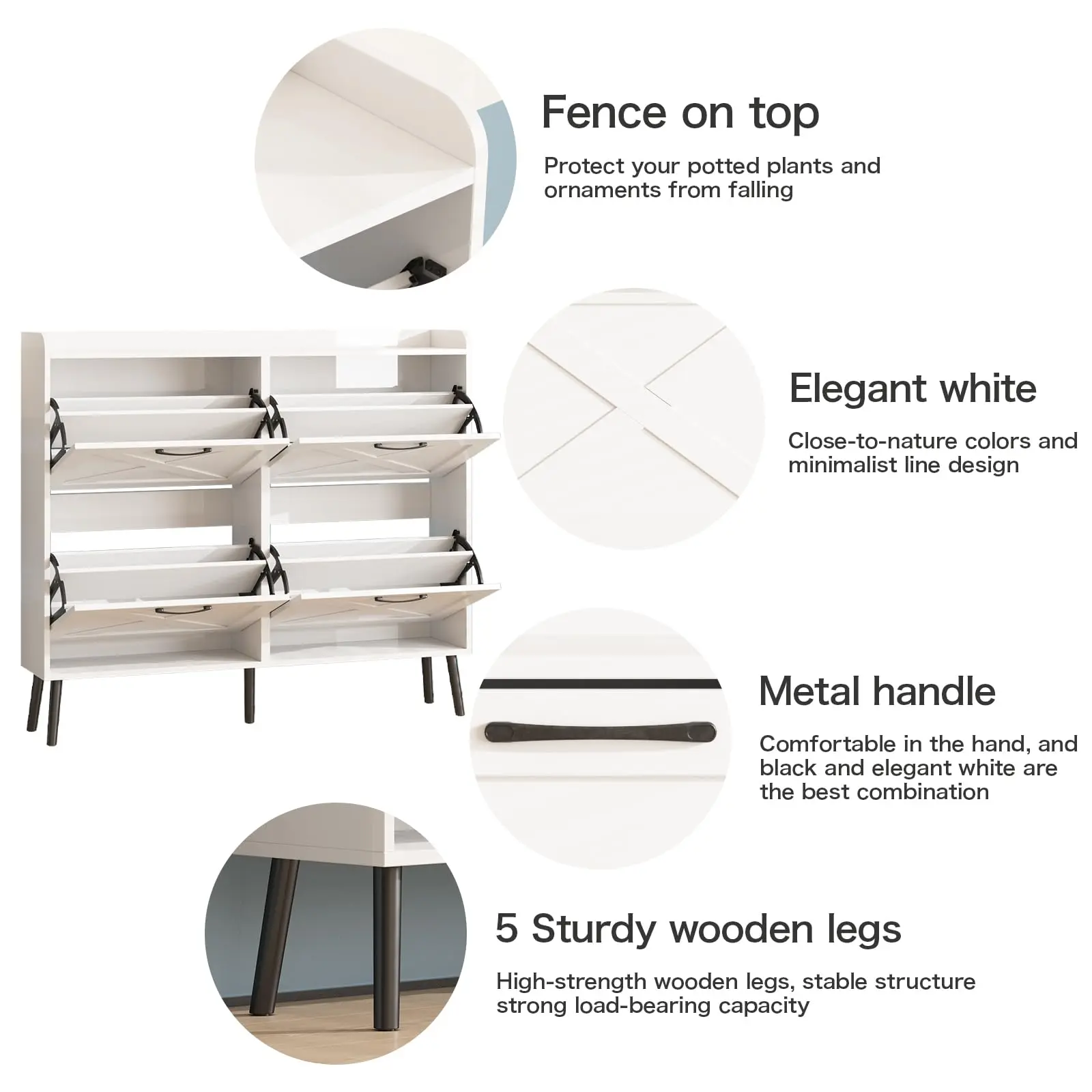 Large Capacity Shoe Cabinet: The drawer shoe cabinet can store up to 32-40 pairs. There are 4 upper and lower drawers, each drawer contains two layers of storage space. The panel can be adjusted or removed in two grooves to accommodate different heights and sizes of flats, mid boots or heels! Slippers or sweeping robots can be placed on the bottom. There is a fence on the top, ideal for placing potted plants, ornaments, socks and keys, without worrying about falling