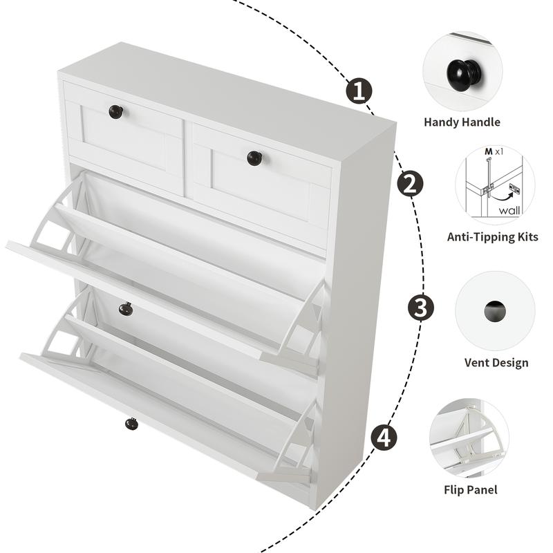 ·【LARGE CAPACITY SHOE CABINET】There are 2 layers of flip drawers, and the panels of each compartment can be adjusted or removed to meet your different types of shoe storage needs. In addition to shoe storage, there are 2 drawers to store door keys, wallets and other sundries for easy access at the door.