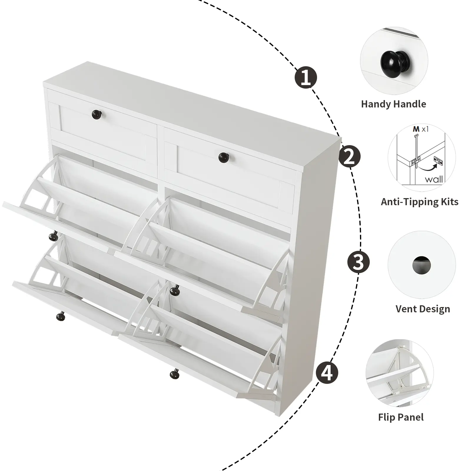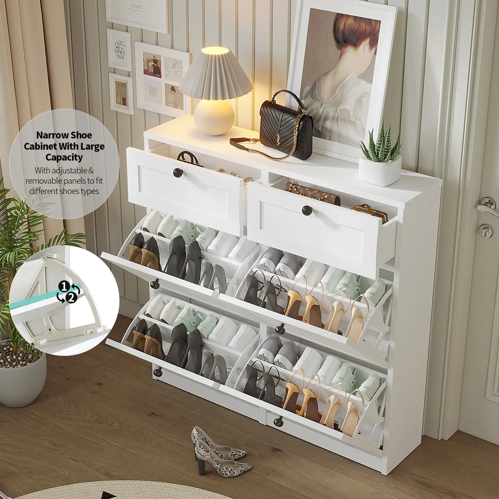 【LARGE CAPACITY SHOE CABINET】There are 4 layers of flip drawers, and the panels of each compartment can be adjusted or removed to meet your different types of shoe storage needs. In addition to shoe storage, there are 2 drawers to store door keys, wallets and other sundries for easy access at the door.