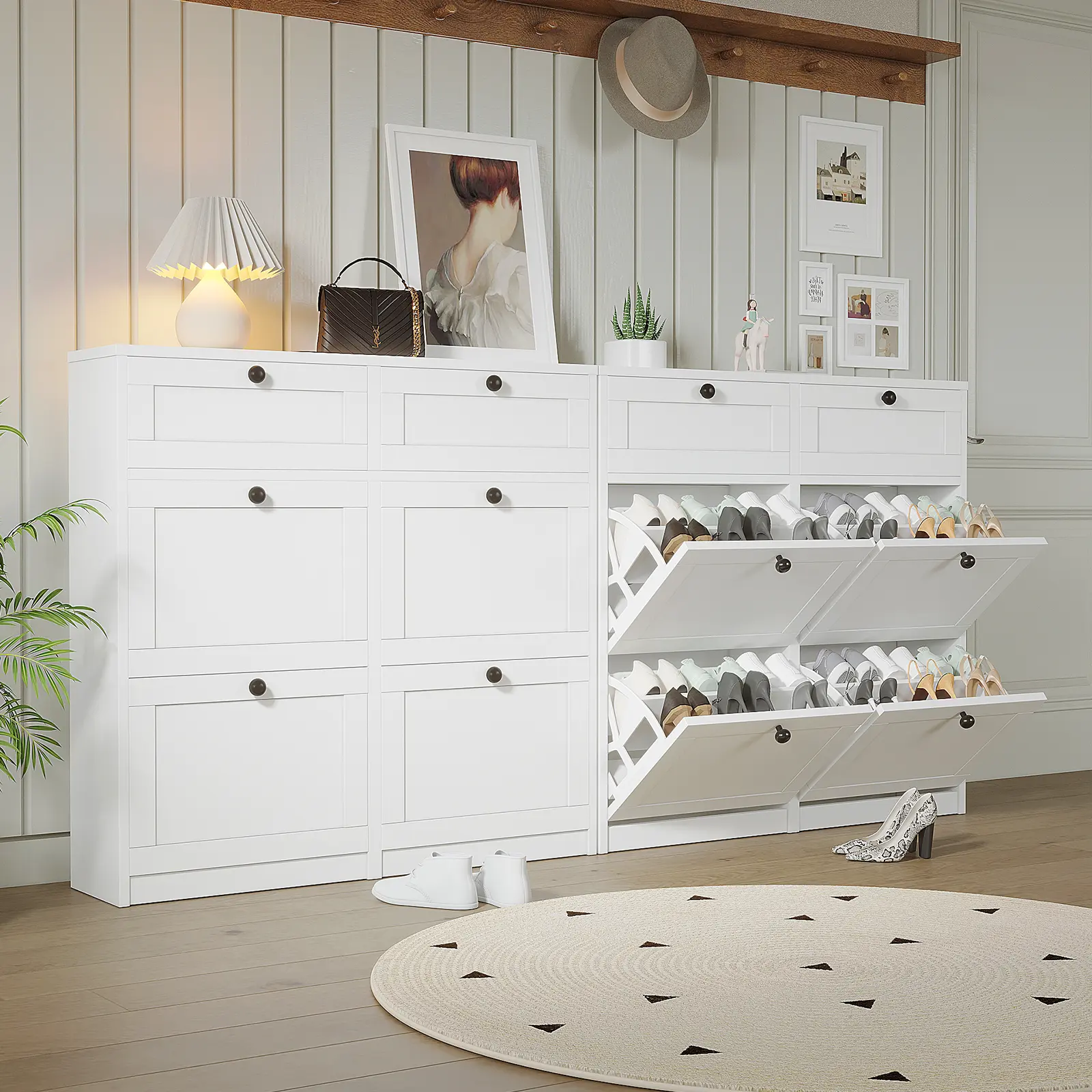 【PRACTICAL DESIGN】The hidden shoe cabinet adopts a space-saving pull-down drawer design, which is easy to open and close. There is an anti-dumping device on the back, which can be fixed to the wall. No need to worry about children and pets knocking over and tipping over.