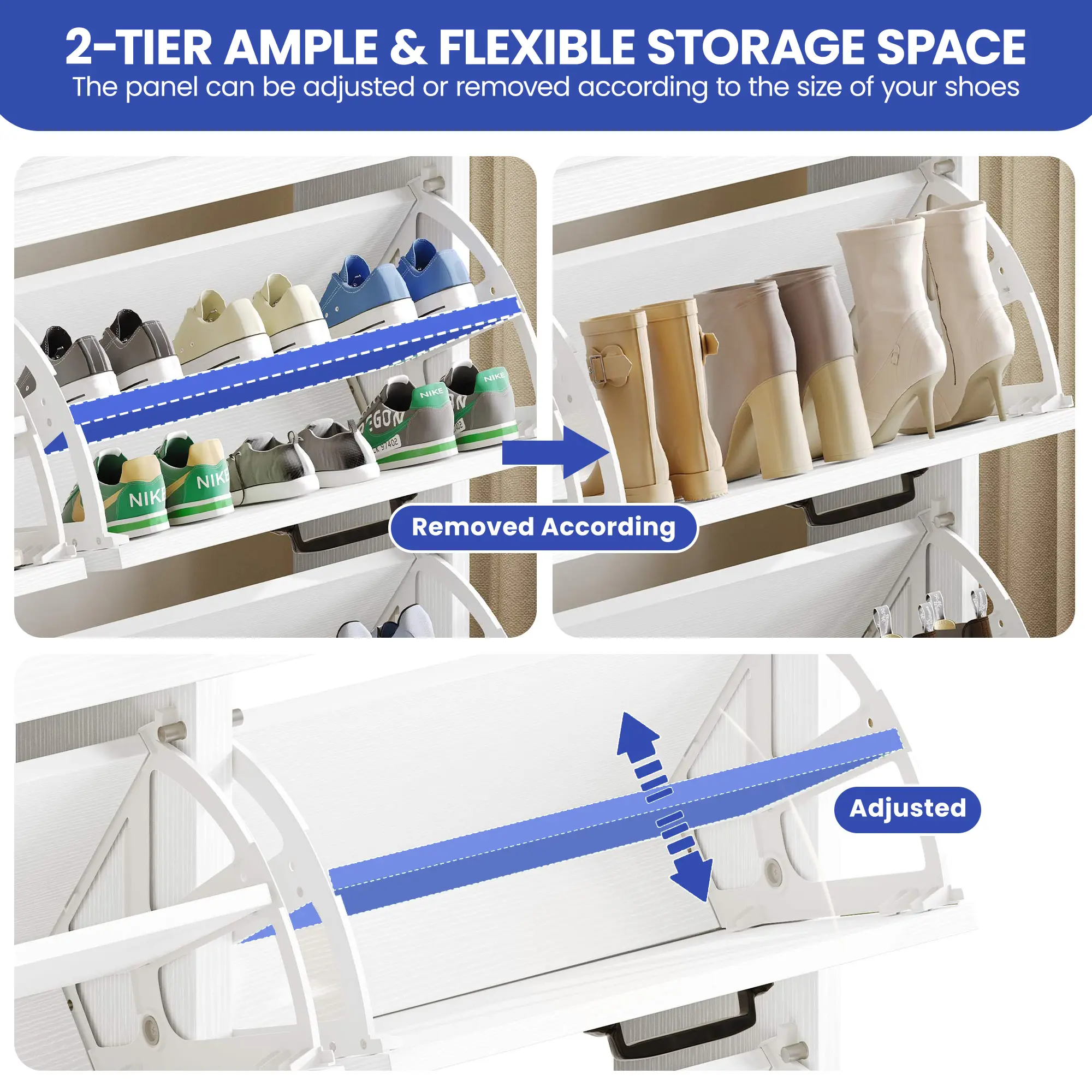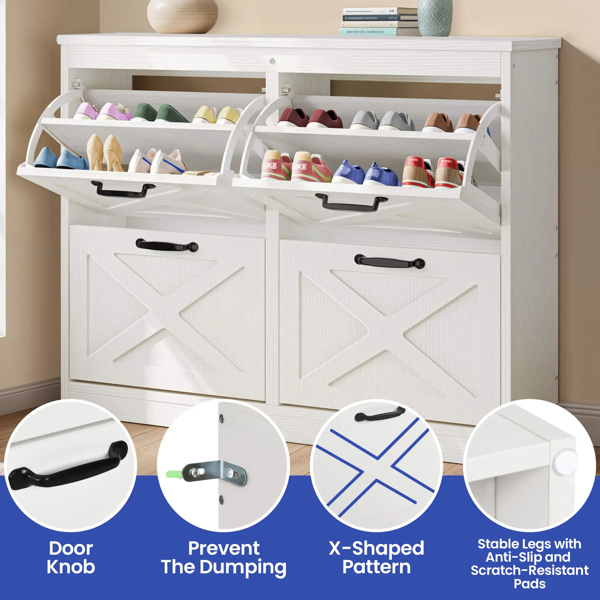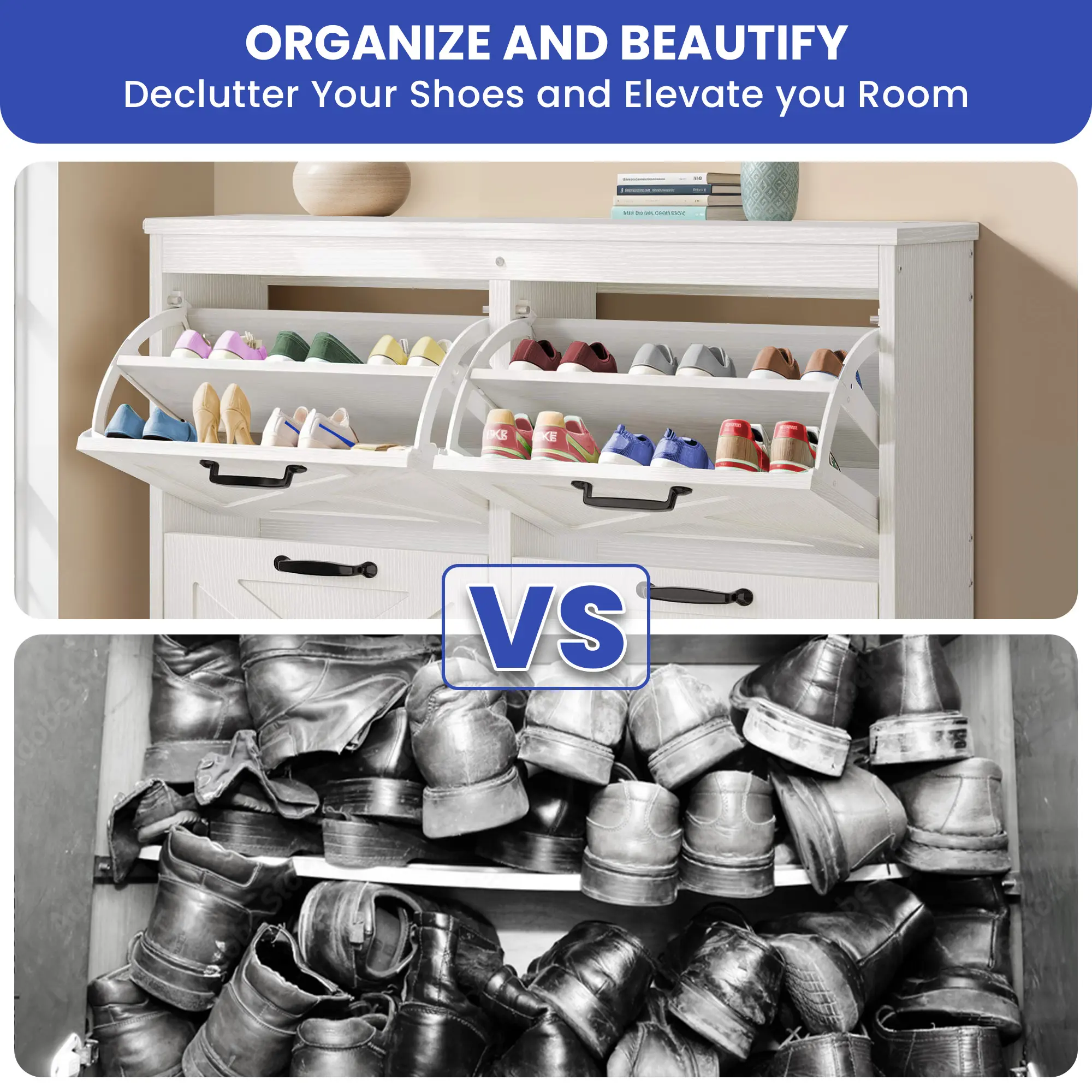 Ample shoe organizer: Four flip drawers with dual layers enable you to adjust or remove them to accommodate your prized shoe collection – boots or heels. The top surface serves as an elegant gallery for decor or a convenient spot for daily essentials.