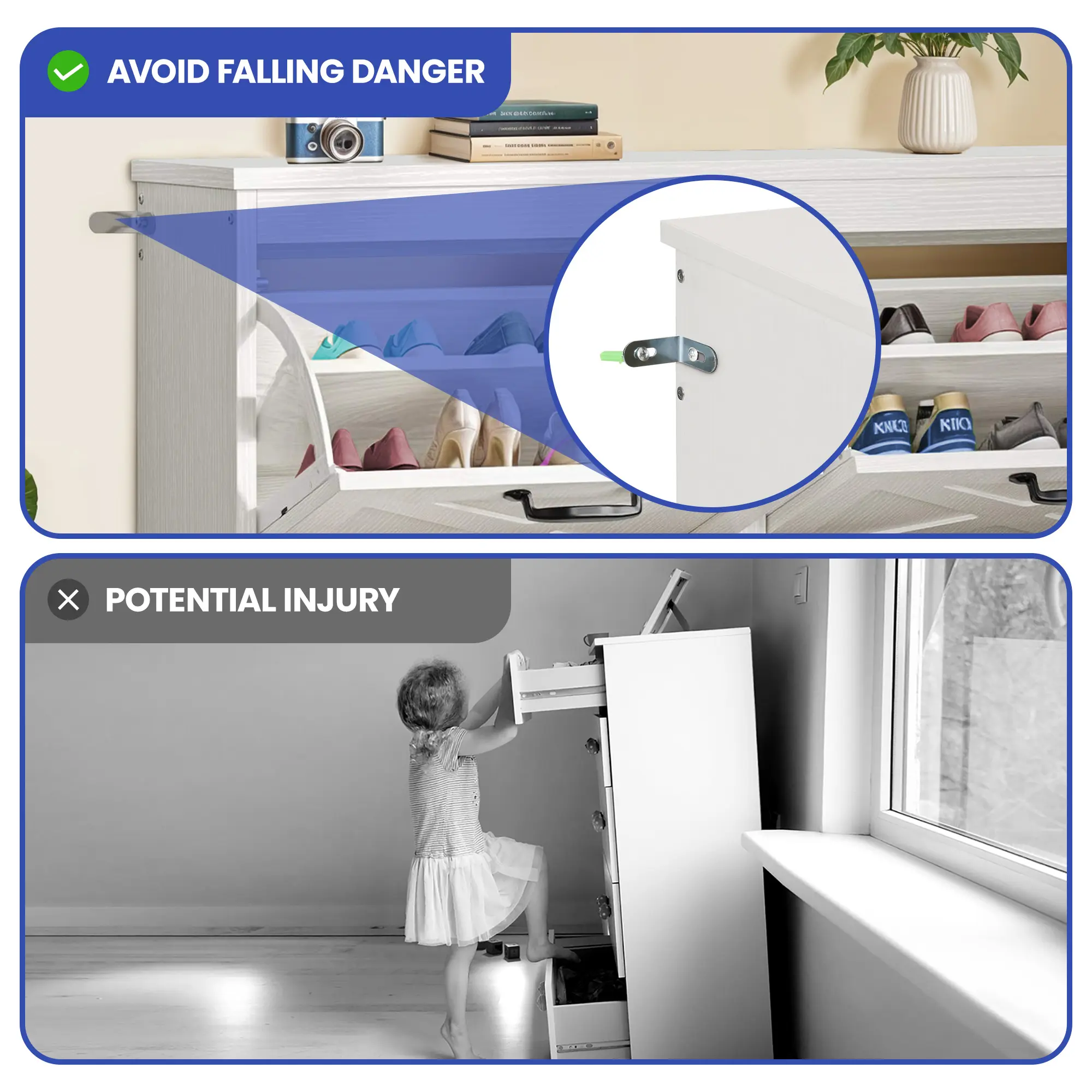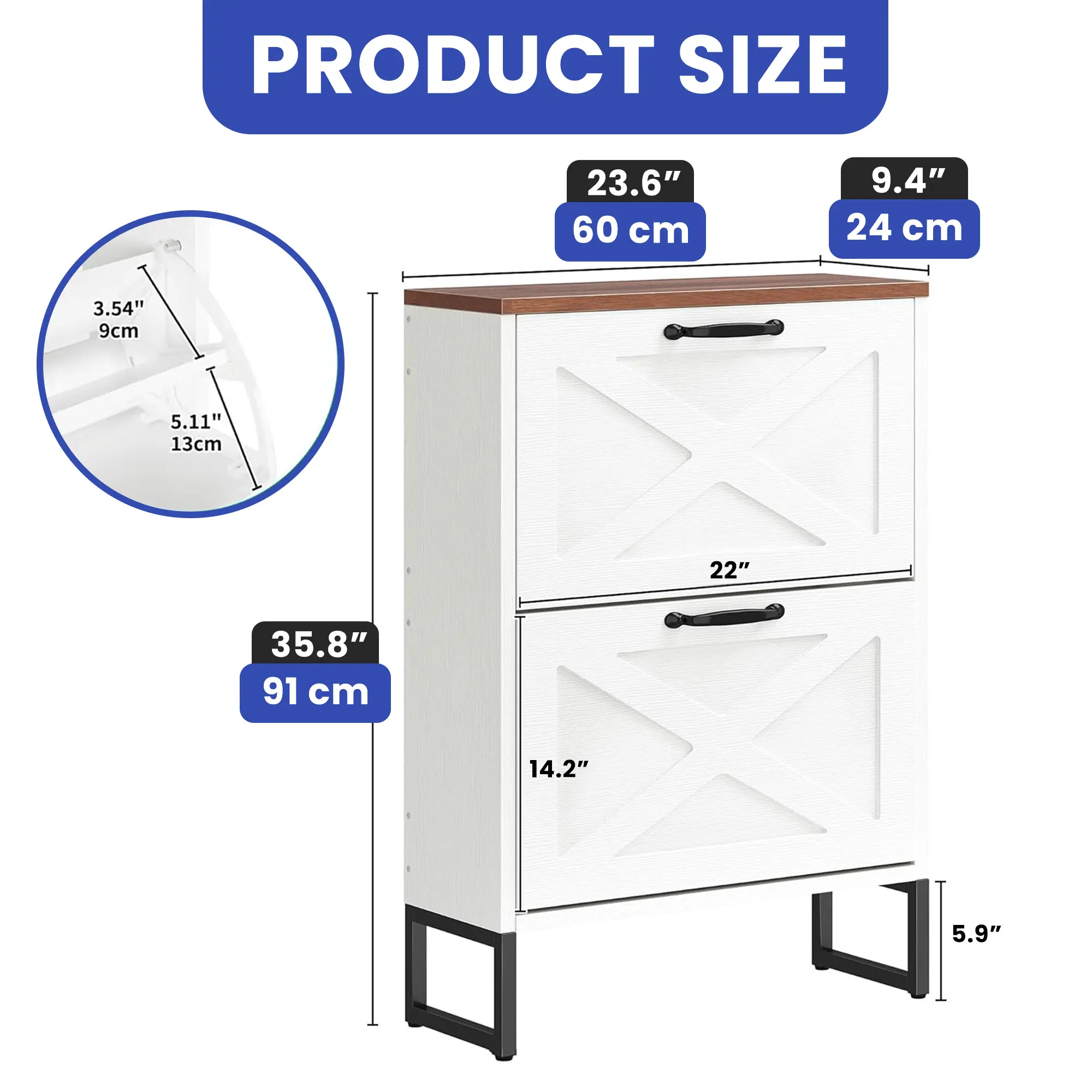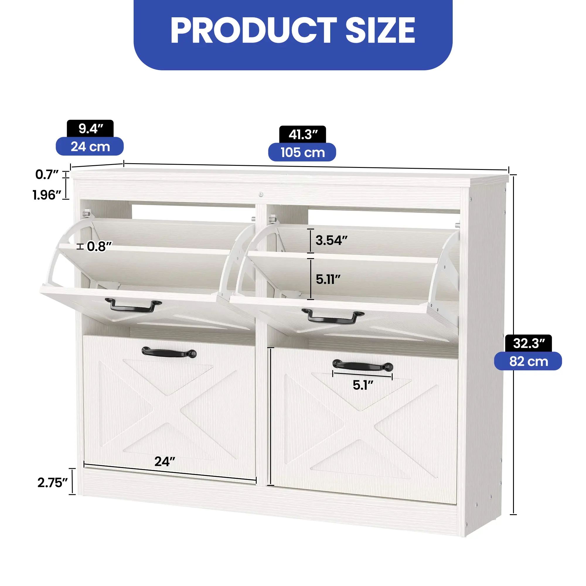 Ample shoe organizer: Four flip drawers with dual layers enable you to adjust or remove them to accommodate your prized shoe collection – boots or heels. The top surface serves as an elegant gallery for decor or a convenient spot for daily essentials.