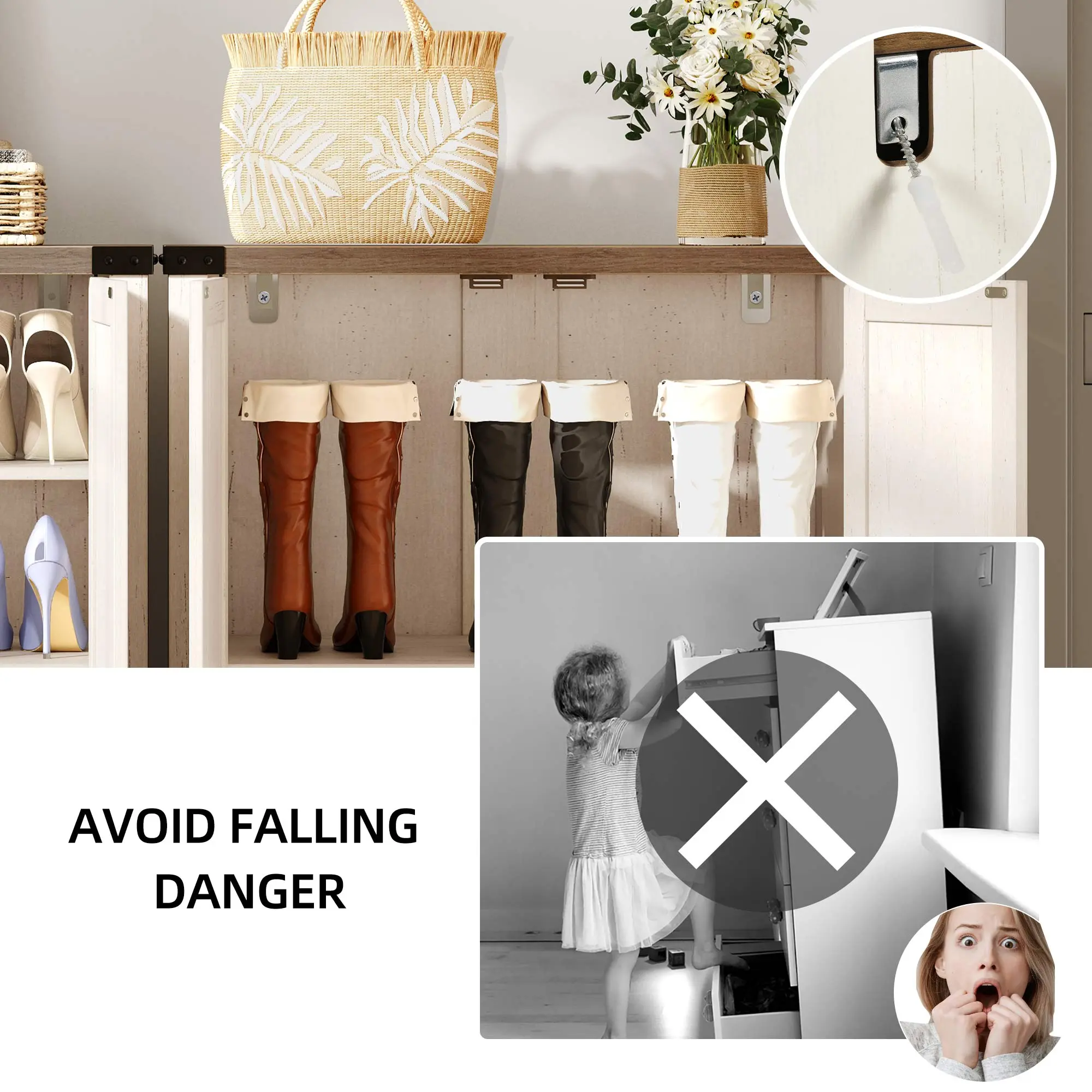 Fit all your shoes: From tall boots, large size shoes to flat sneakers, this shoe cabinet with doors can flexibly accommodate them, as the 1st and 3rd shelves can be adjusted or removed.