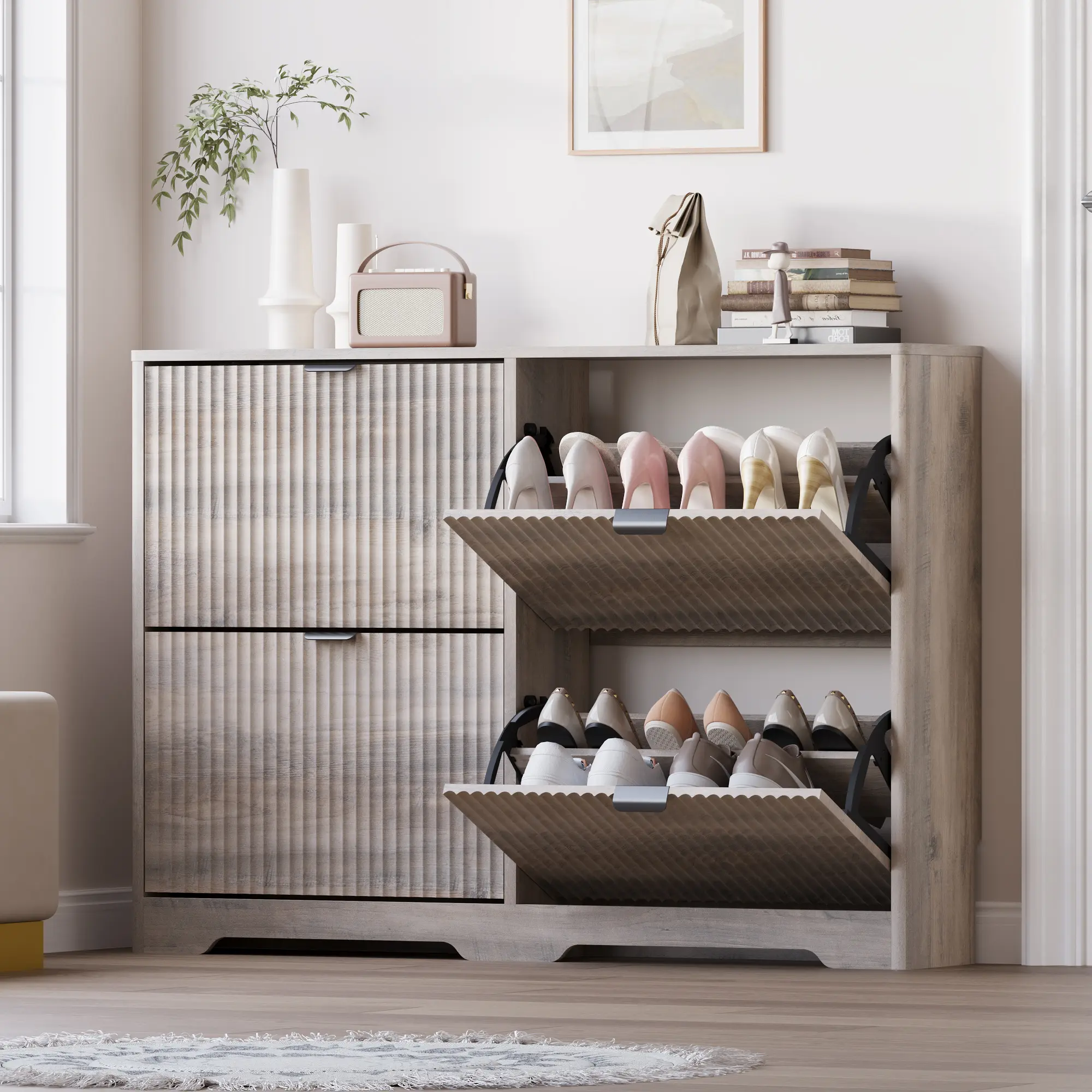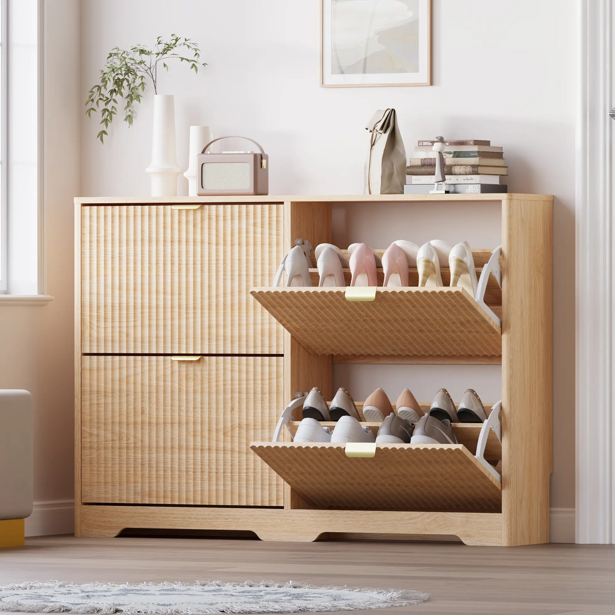 ·【FLUTED FLIP DRAWER】Natural wood shoe cabinet is designed for higher-grade fluted flip drawer, both functional and mid century modern appealing. Fluted shoe storage cabinet creates subtle shadow effects that add dimension, sets it apart from general shoe racks, adding a sophisticated charm to your home.