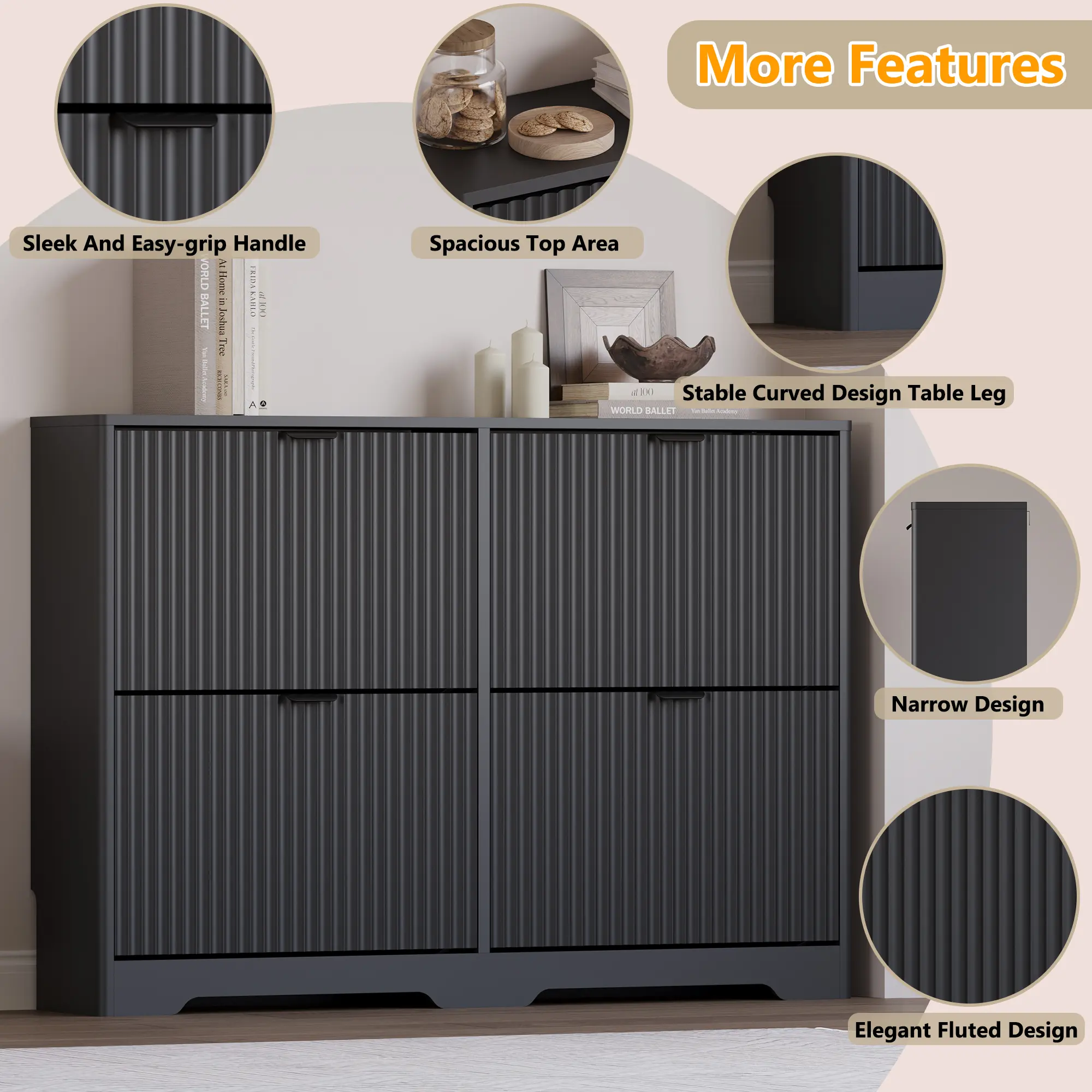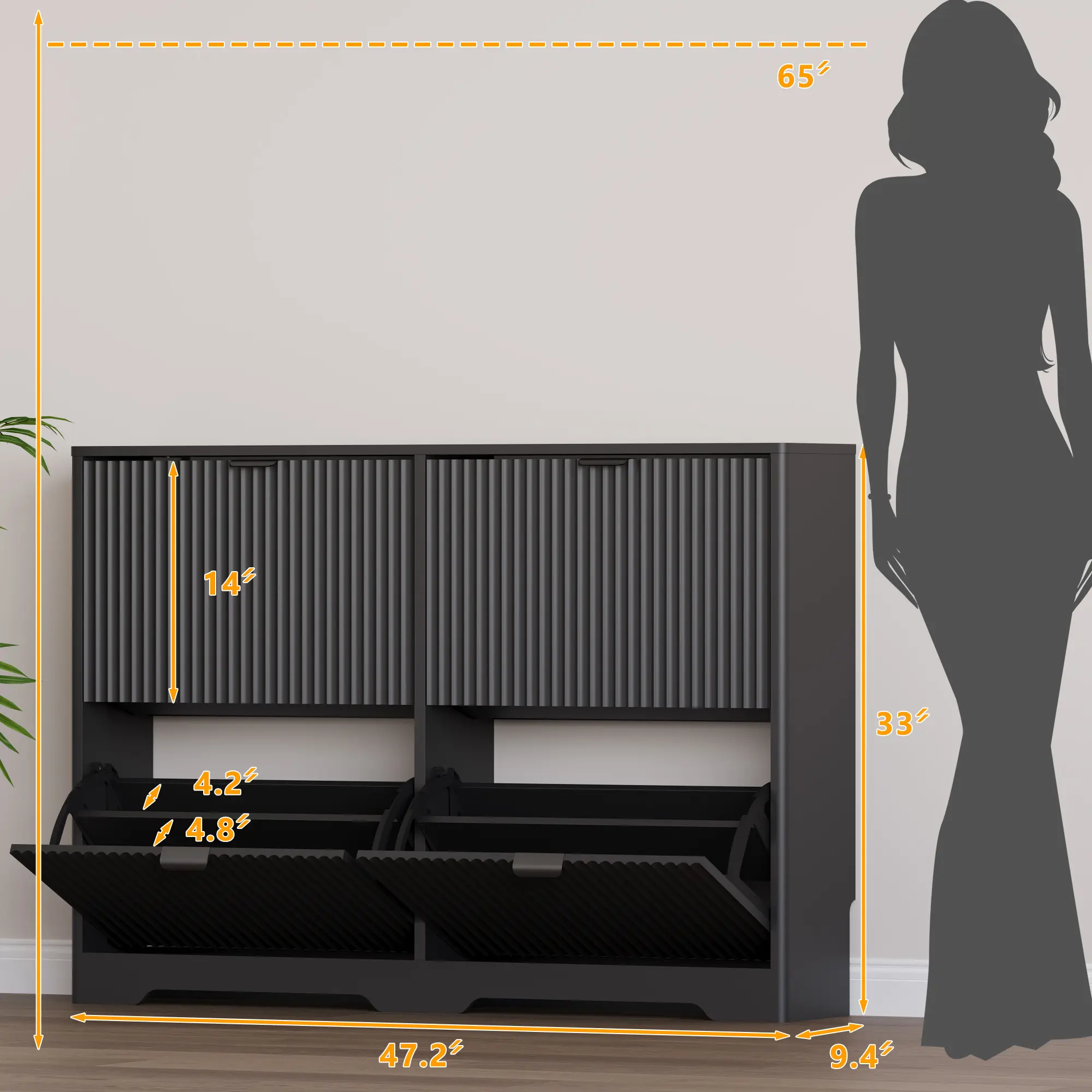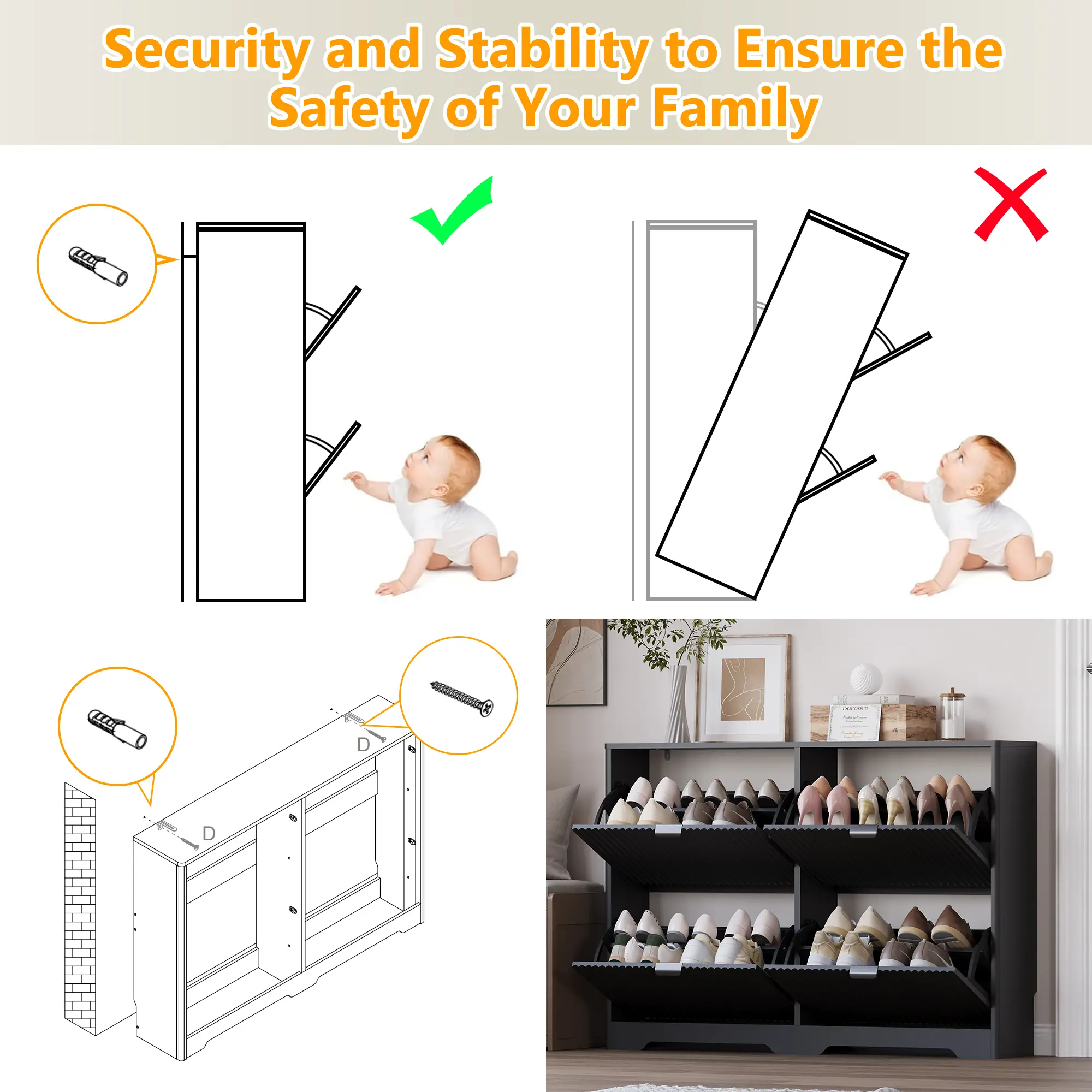 ·【MULTIFUNCTIONAL & DURABILITY】Black shoe organizer cabinet is equipped with 4 flip drawers, each flip drawer has 1 adjustable shelf. And you can remove or adjust shelves to accommodate different shoe sizes and styles. Spacious open storage space on top for keys, wallets, picture frames, plants, etc. So easily you accessing!