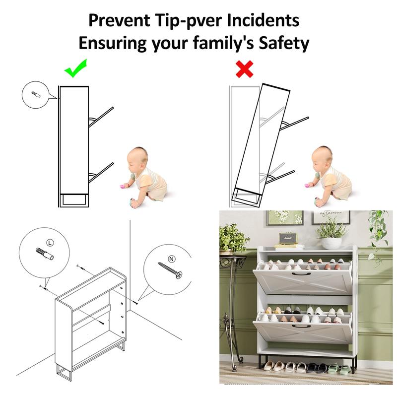 ·Safe and Reliable Quality: This slim shoe cabinet contains an anti-tipping device, which can be fixed on the wall to prevent tipping and protect children's safety. Made of high-quality MDF wood and metal legs, the stable structure ensures super load-bearing capacity. The black metal handle is simple and elegant, feels comfortable, and prevents scratches and injuries during use. The black metal legs prevent the floor from being scratched, and can be easily cleaned with a damp cloth