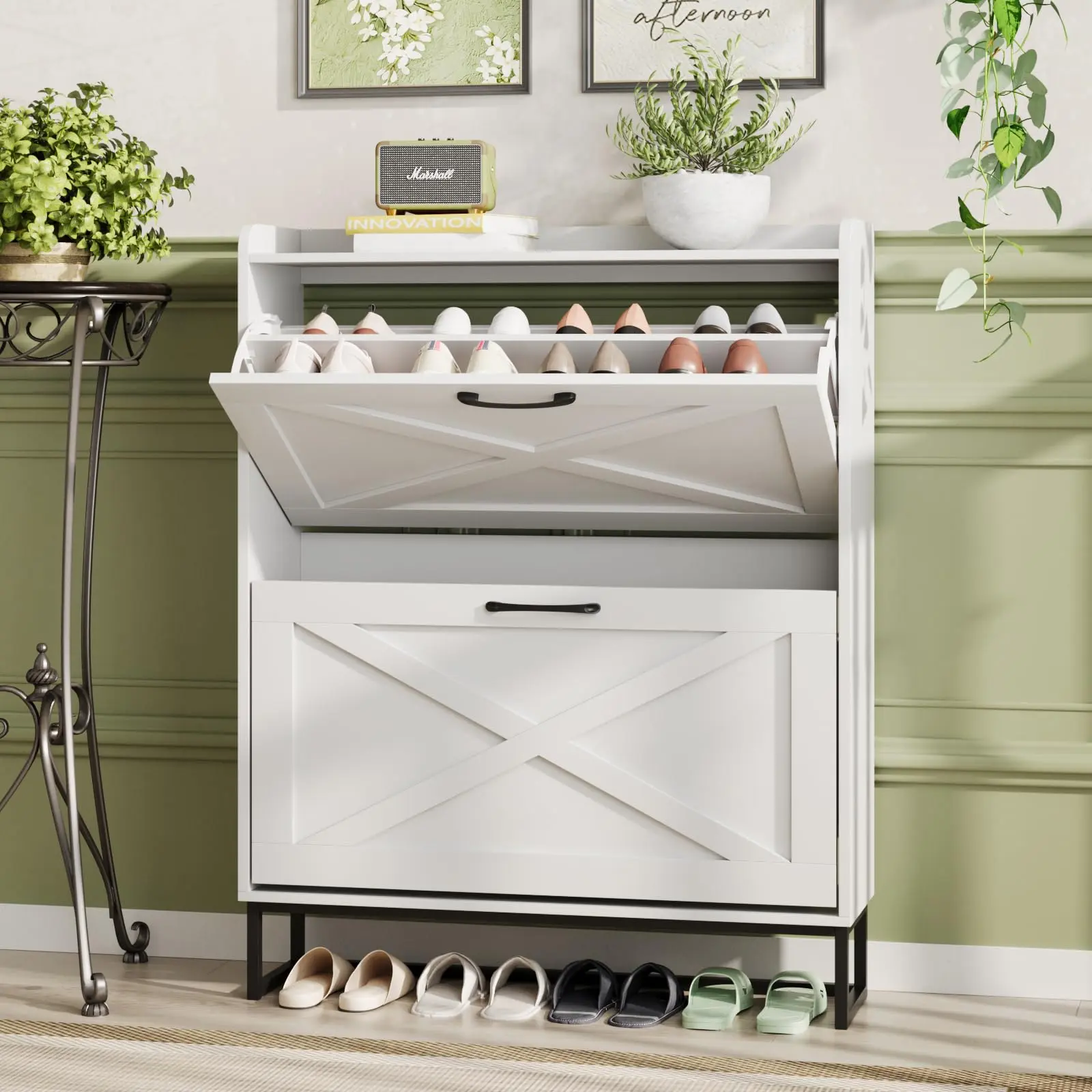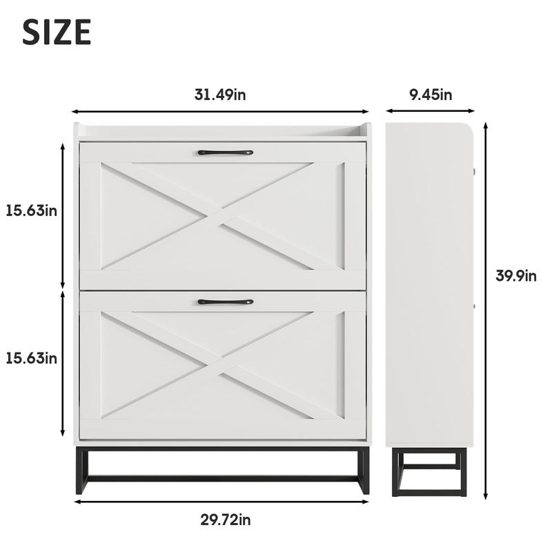 ·Entryway Shoe Cabinet: The hidden shoe storage cabinet with 2 flip doors, stylish and simple white makes it a neat and beautiful finish and looks great in many different home styles. Perfect for placing in the entryway, hallway, living room, or porch, provides a neat looking in your home and space saving