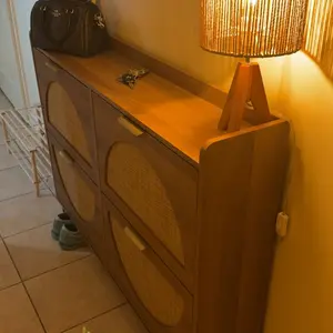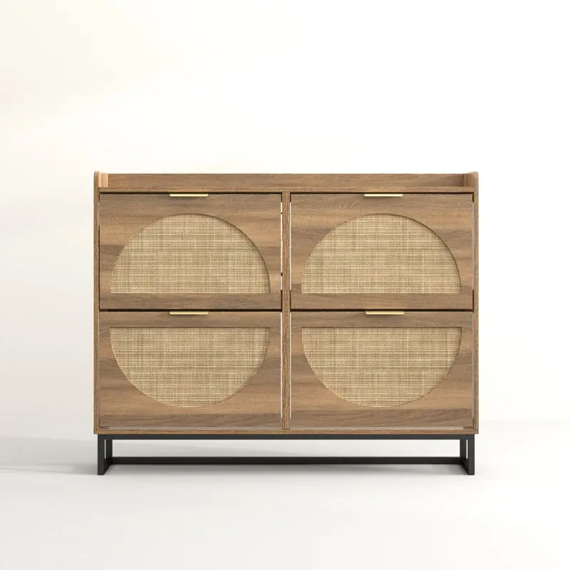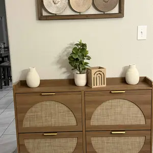 Entryway Shoe Cabinet: The hidden shoe storage cabinet with 4 flip doors, geometric aesthetics of the half-round combined with the traditional rattan elements, and looks great in many different home styles. Hand-woven rattan craftsmanship, harmless and odorless. Perfect for placing in the entryway, hallway, living room, or porch, provides a neat looking in your home and space saving