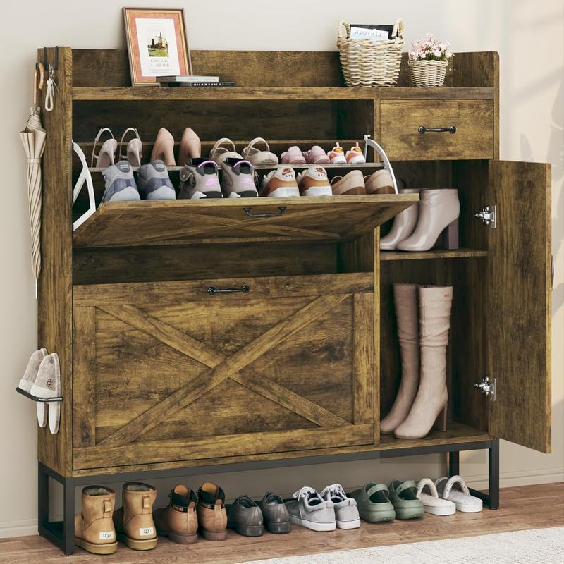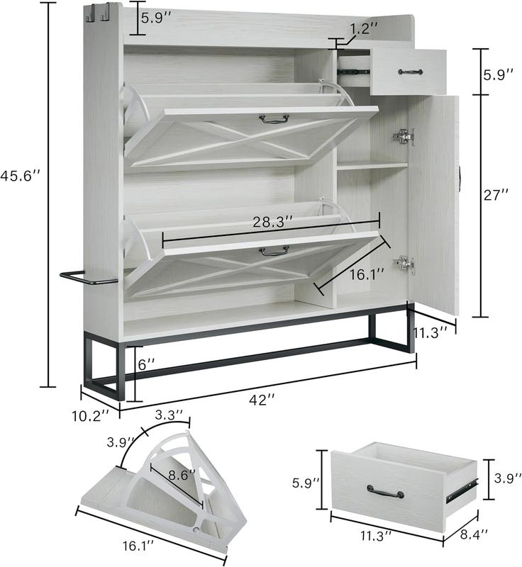 ·Adjustable & Flexible Shoe Cabinet:The shoe storage cabinet features a flexible adjustable design. The flip-out drawers have shelves with 2 adjustable heights to accommodate various shoe sizes. The side cabinet for shoes also offers adjustable shelf, perfect for mid-calf and tall boots, and side hooks for hanging umbrellas, keys, bags, and hats.