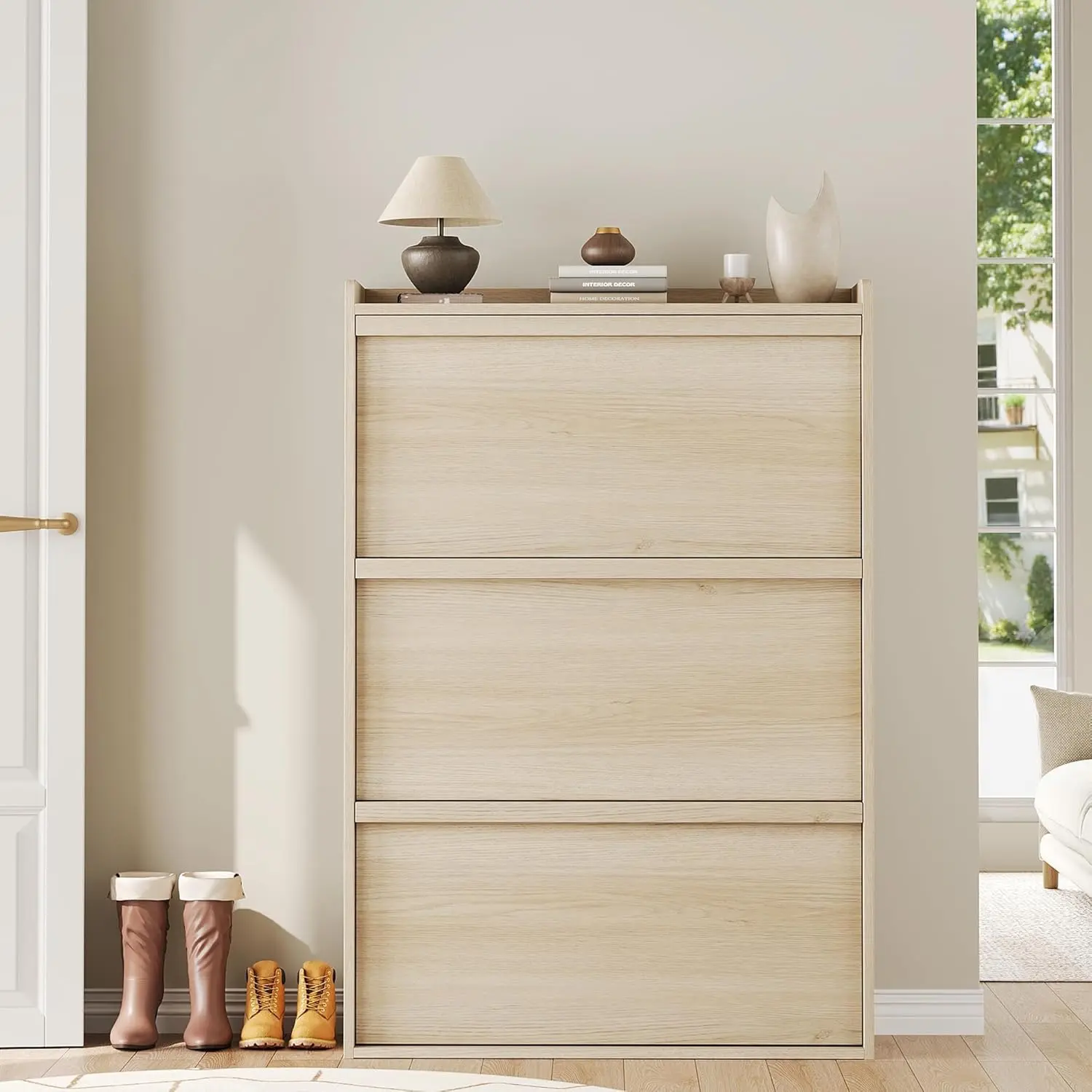 Wooden Shoe Cabinet with 3 Flip Drawers, 3-Tier Adjustable Shelves, Hidden Freestanding Design for Entryway, Hallway, Living Room - Natural Decor Rack Organiser Installation Water Proof Storage Unit