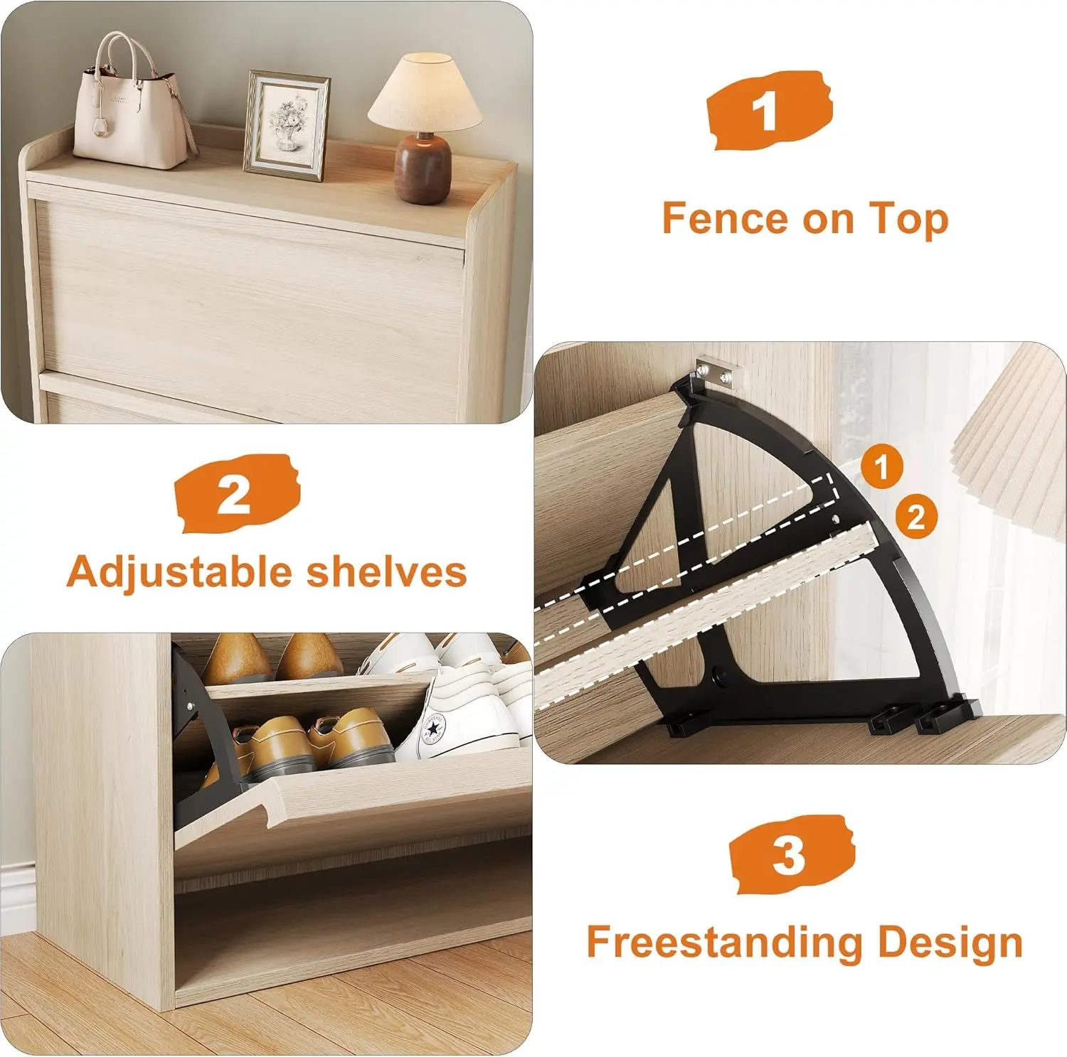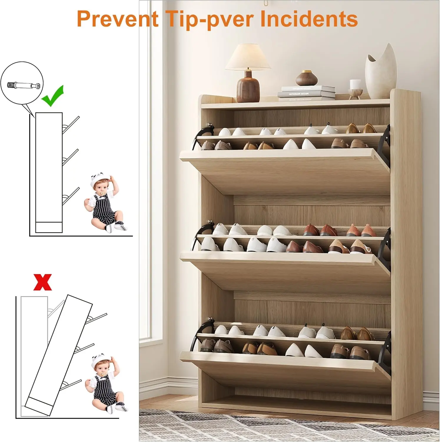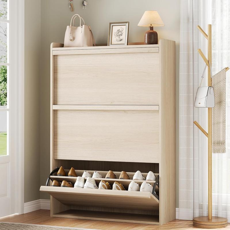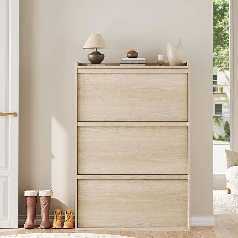 VERSATILE STYLE: Chic entryway shoe cabinet enhances the aesthetics of your space, adding a touch of cleanliness and beauty. It effortlessly complements any home style and is ideal for narrow entry halls, dorm rooms, or small apartments. This shoe cabinet infuses warm and inviting tones into your living area, serving not only as functional furniture but also as a stylish home decor piece. LARGE STORAGE SPACE: Our shoe cabinet overall size is 31.50” L x 10.35” W x 46.14” H. The flip shoe cabinet can store between 18-24 pairs of shoes.Each drawer has two layers of storage space, providing ample storage capacity. The panel can be adjusted or removed within two grooves to accommodate sneakers shoes, ankle boots, or high heels of varying heights and sizes. Moreover, it is capable of storing men's shoes up to size 13". CHIC DESIGN: The hidden shoe rack incorporates a space-saving flip drawer design, which offers greater convenience for opening and closing. Compared to regular shoe racks, this shoe cabinet allows placement in narrower spaces and provides protection against dust, pets, or insect damage to your shoes. The back of the shoe cabinet features an anti-tipping device and can be securely anchored to the wall, eliminating concerns about accidental tip-overs from children and pets. STURDY STRUCTURE: This shoe cabinet is made of high-quality MDF engineered wood to ensure its strength and durability, and the thickened waterproof desktop provides excellent stability and a load-bearing capacity of 25 pounds. Each layer inside designed to bear 12 pounds, providing ample support. High-quality materials and exquisite craftsmanship make this entryway shoe cabinet sturdy and durable, not afraid of long-term use. EASY ASSEMBLY: This product is very simple to assemble thanks to clear step-by-step instructions in the installation manual. All screws and parts are labeled for easy assembly. Your shoe cabinet will be carefully packed to ensure maximum protection during shipping. If you have any questions or concerns, please feel free to contact us via email and we will provide a satisfactory solution in time.