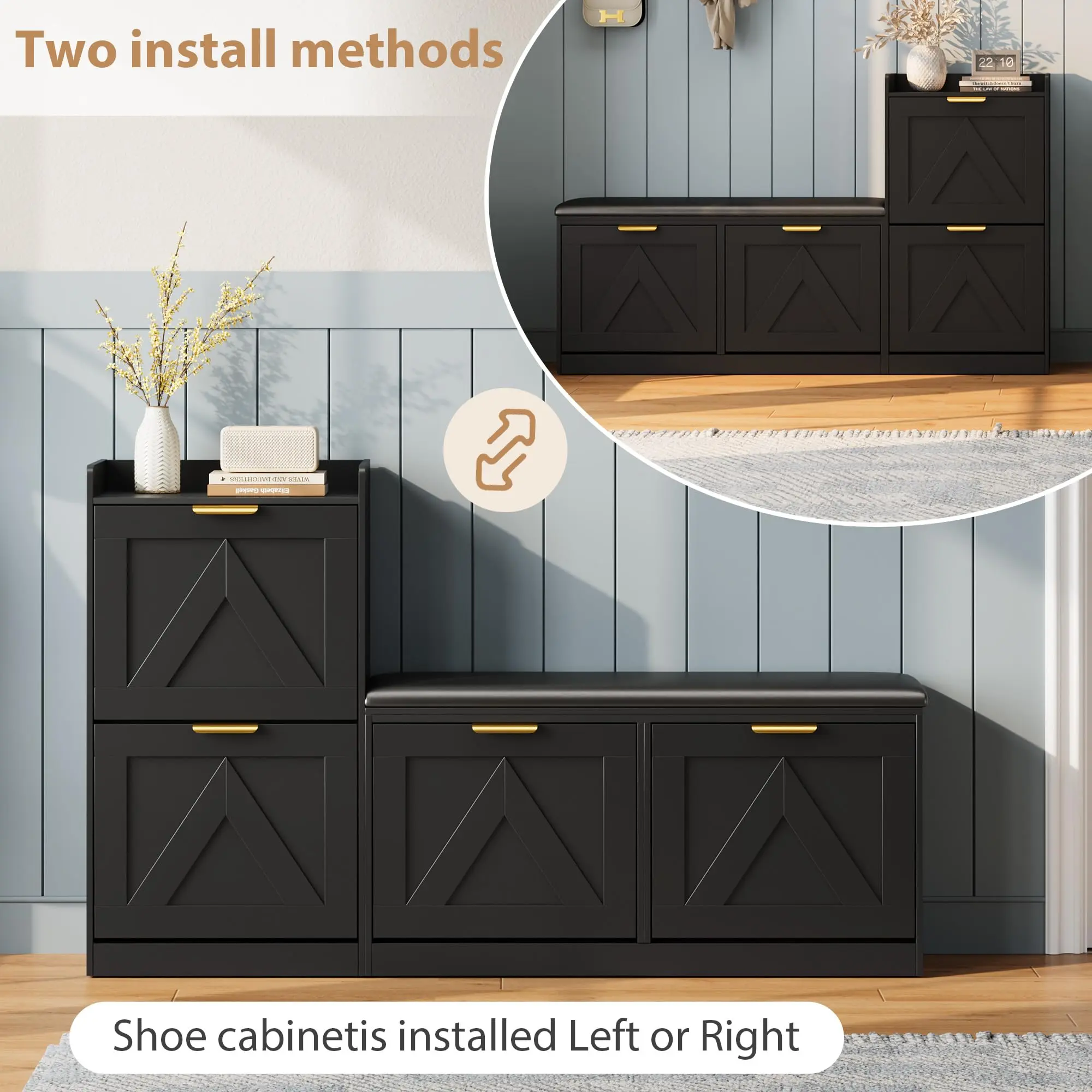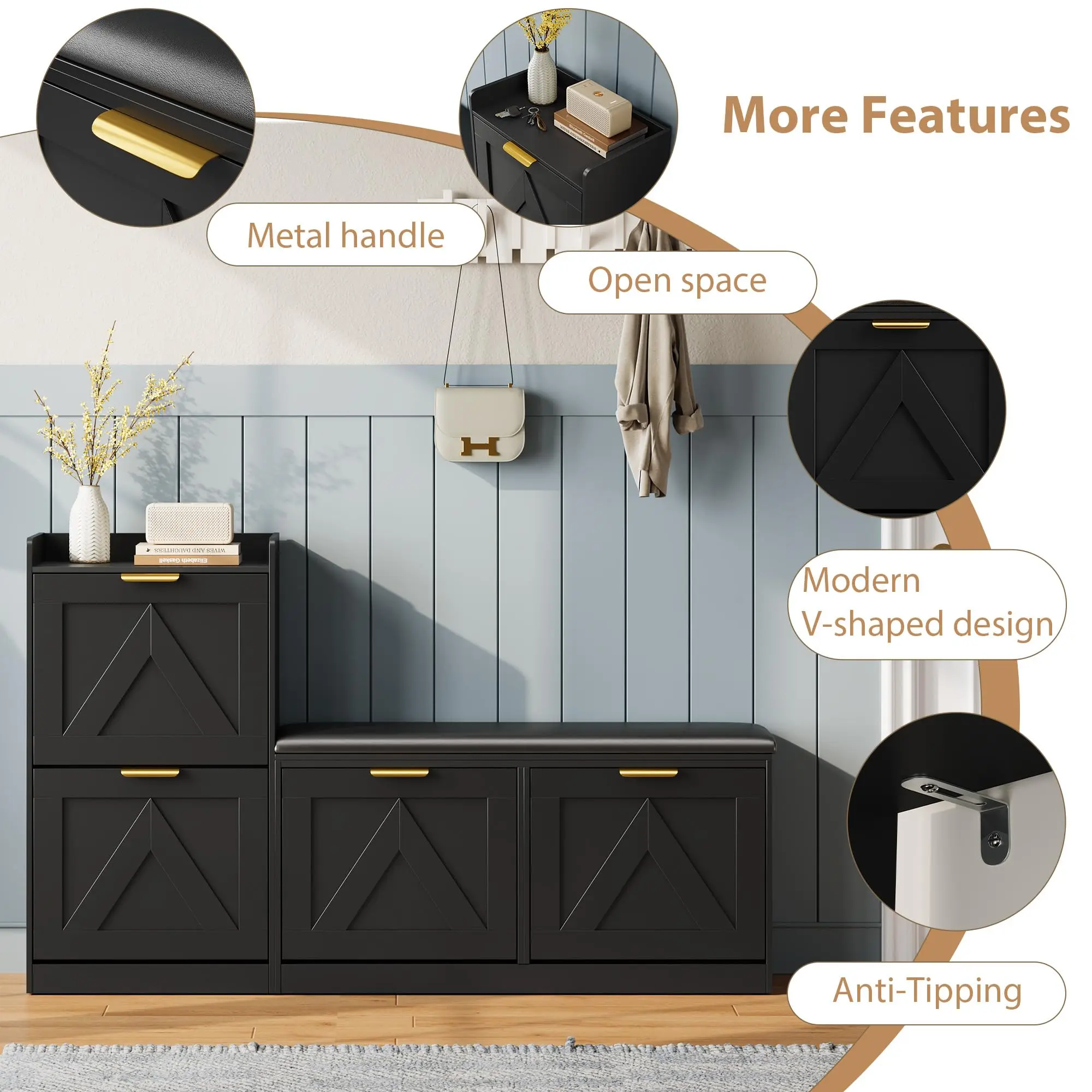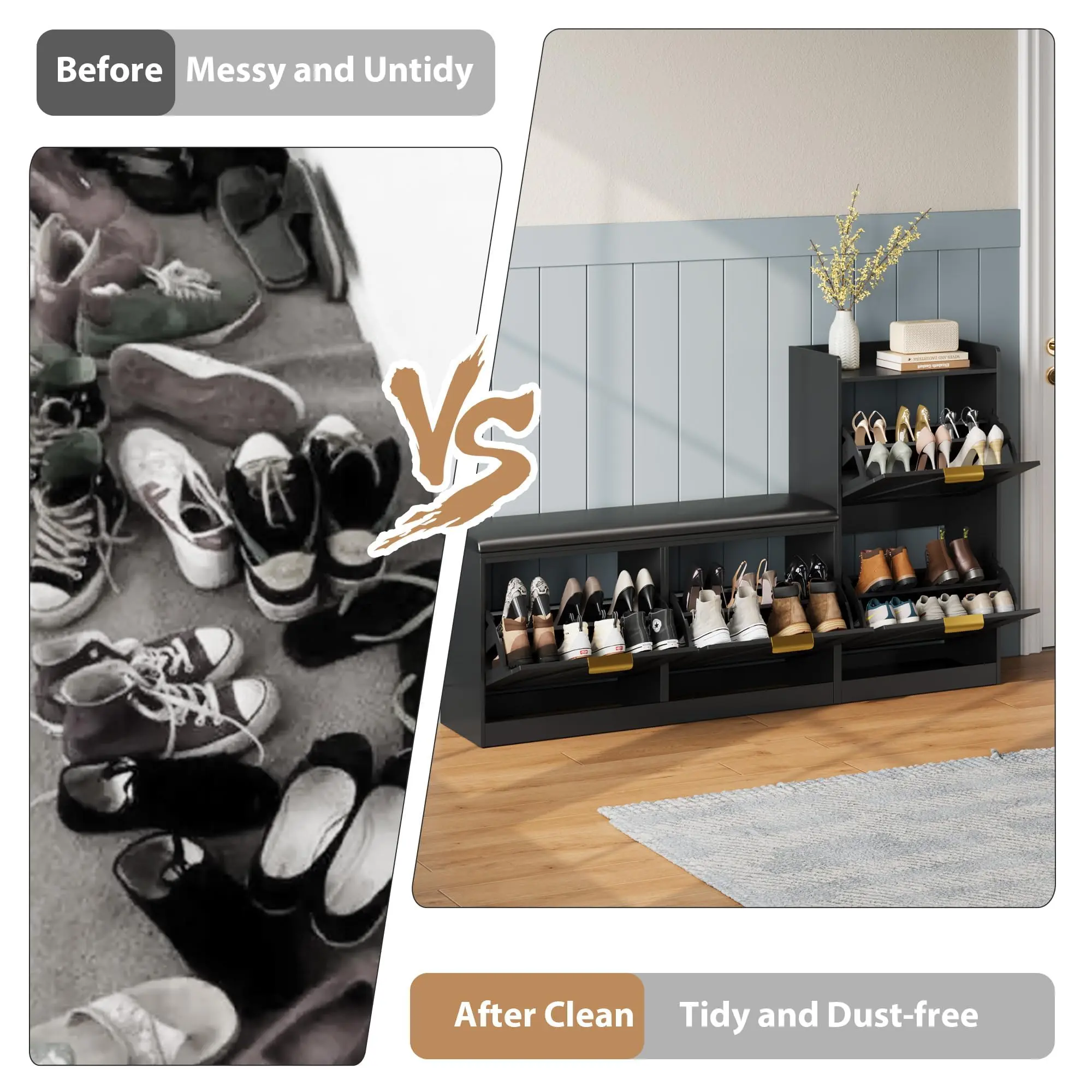 ·3.Sturdy & Durable Construction: Made from high-grade MDF with a thickened bottom, this shoe organizer cabinet supports up to 340 lbs. It's non-cracking, easy to clean, and includes an anti-tipping kit for extra safety, making it a reliable choice for your home