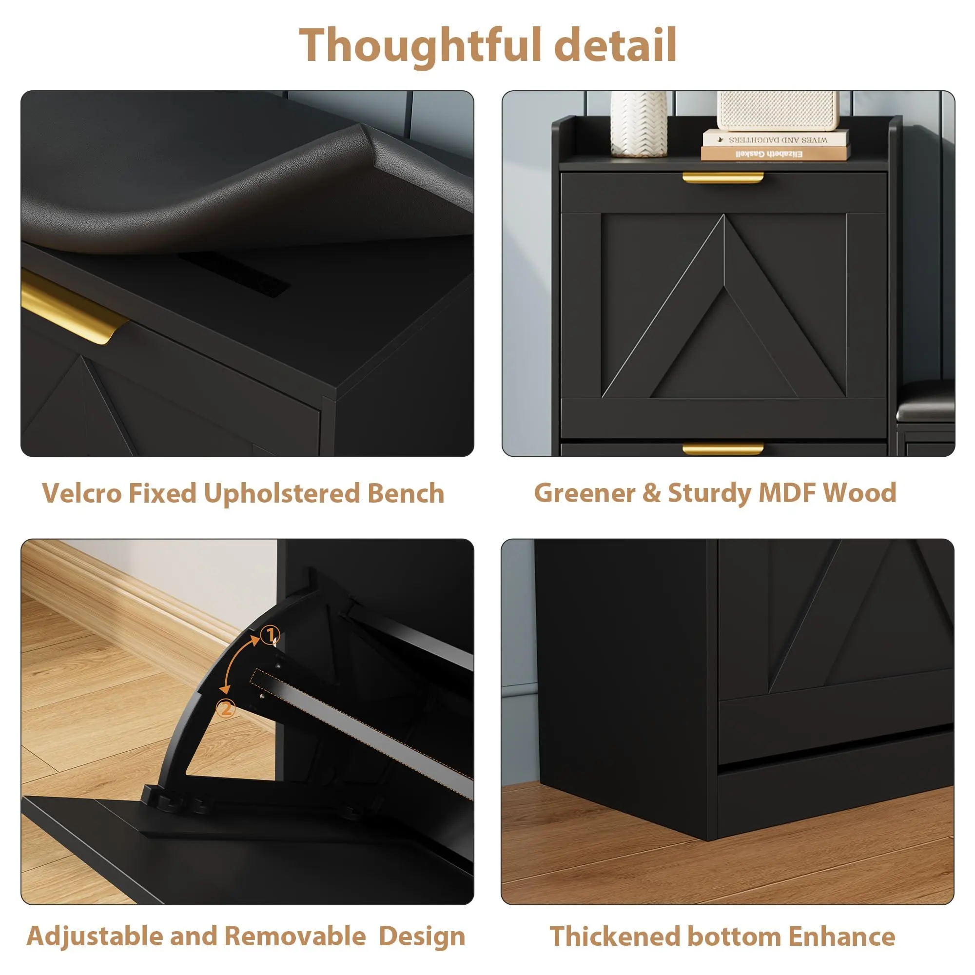 ·2.Comfortable Storage Bench: The entryway shoe storage bench comes with a thick, upholstered cushion secured by straps . The cushion is removable, scratch-resistant, and easy to clean, giving you a comfortable spot to sit while putting on or taking off shoes